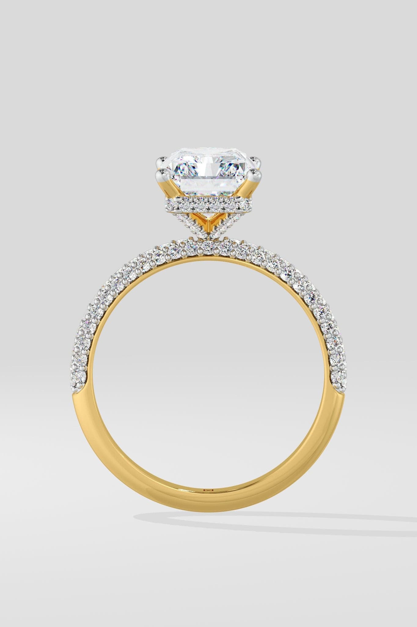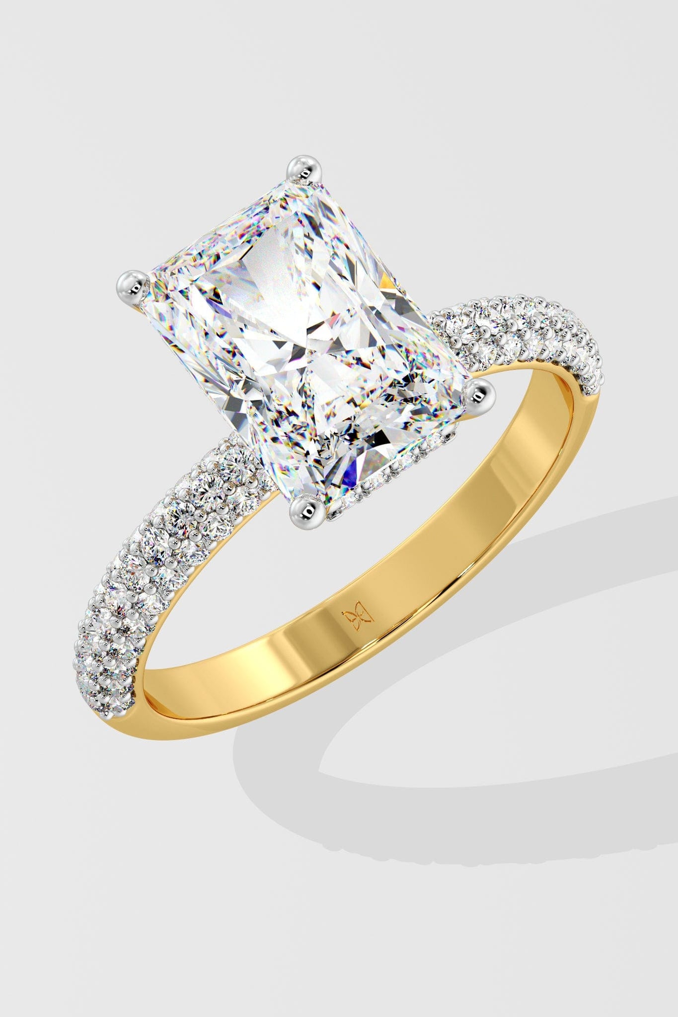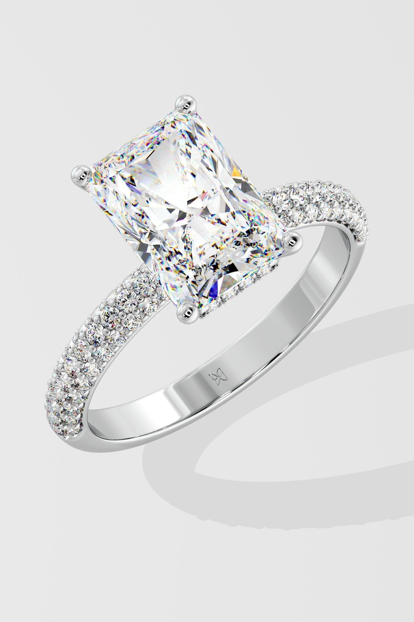 The 2.5 ct Lab Grown Reverie Radiant Ring features a radiant-cut diamond set on a pave band. The band has three rows of small diamonds in a pave setting that add that charming sparkle.