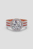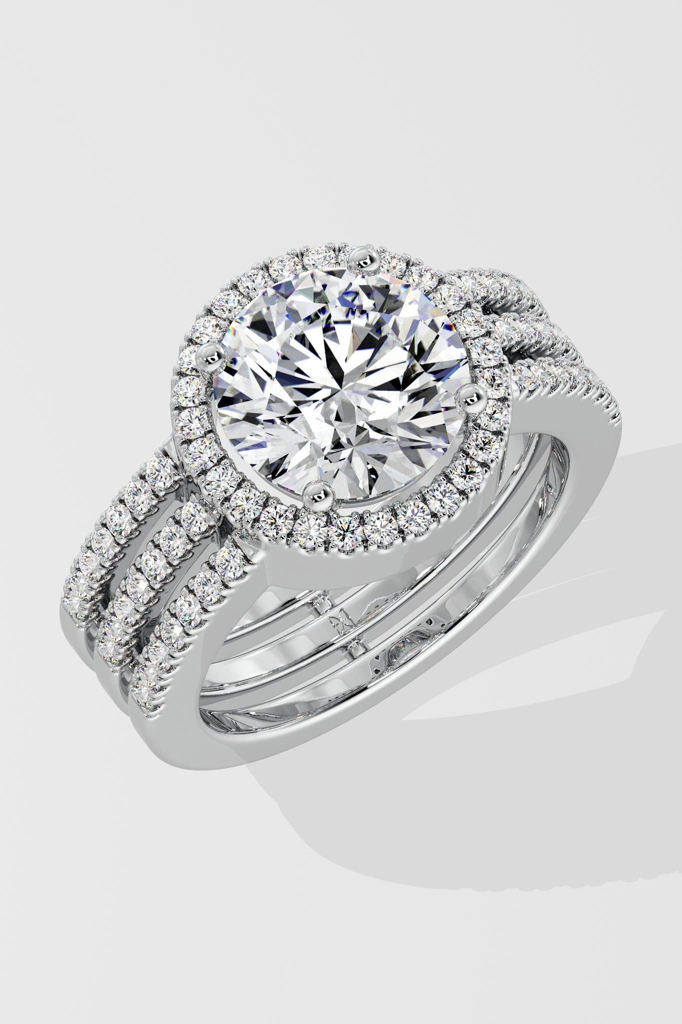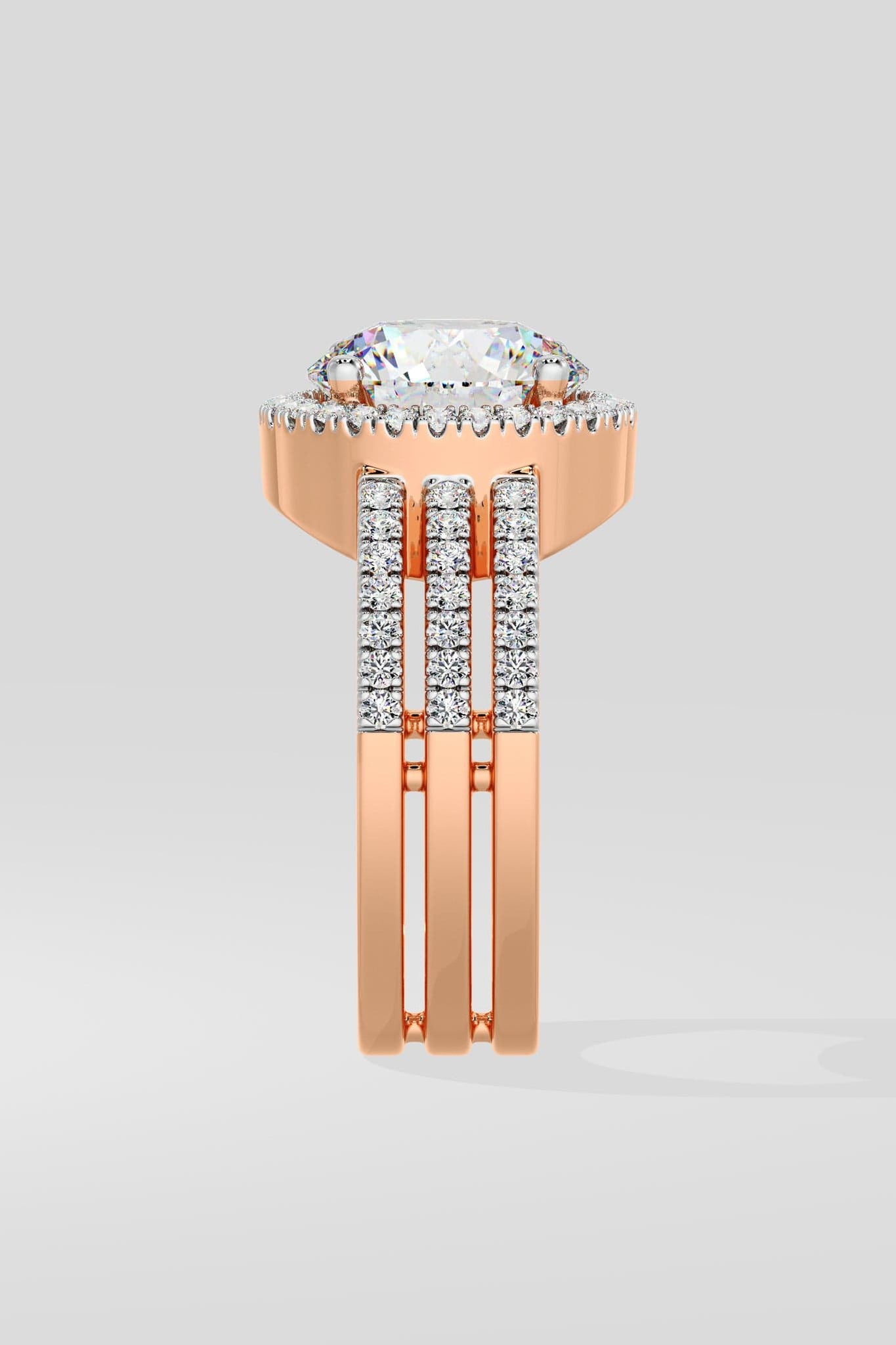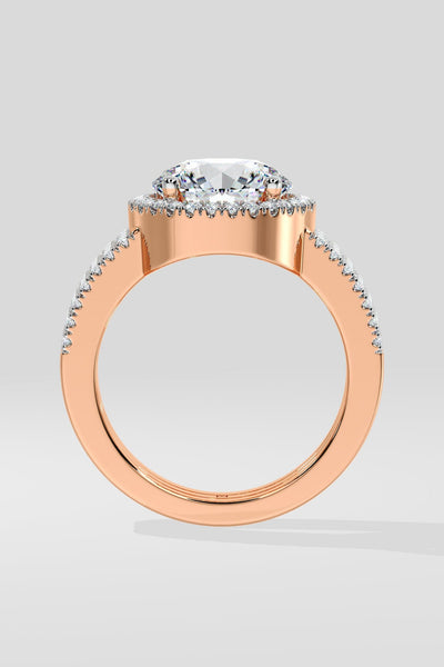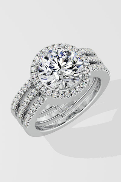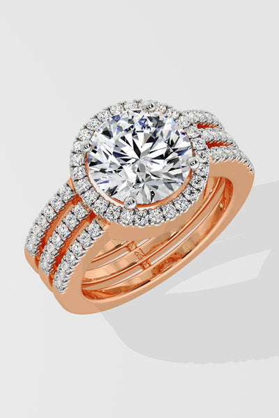 The 2 Ct Aurora Triple Row Ring features a 2 Carat Round solitaire with a visible halo that enhances the size of the diamond. A studded, triple row band adds structure and presence. Designed to stand out, it makes a bold statement.