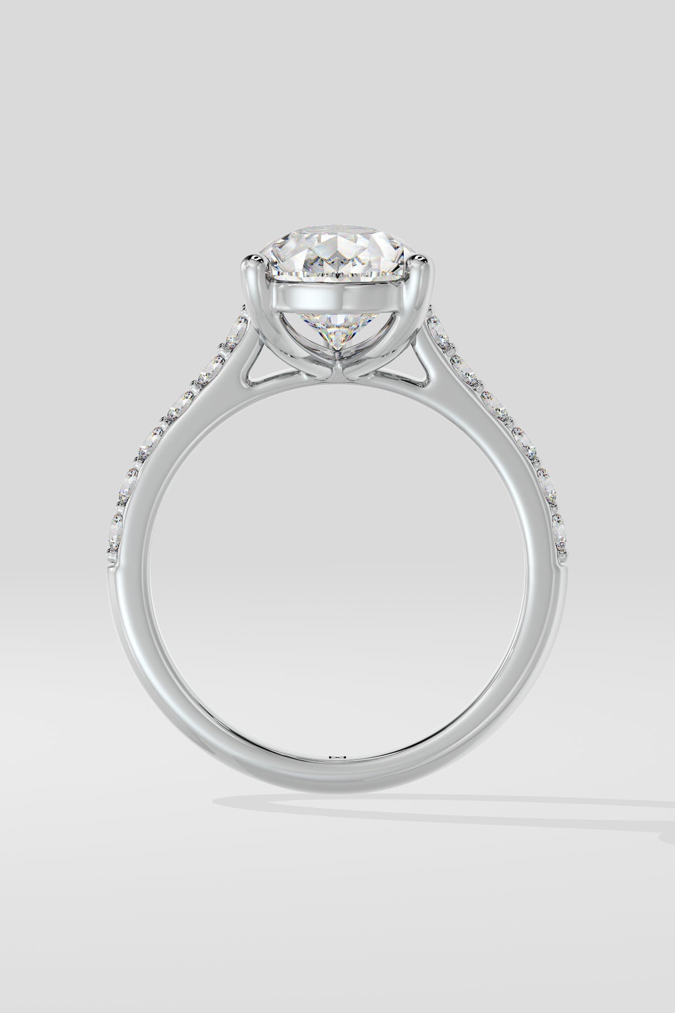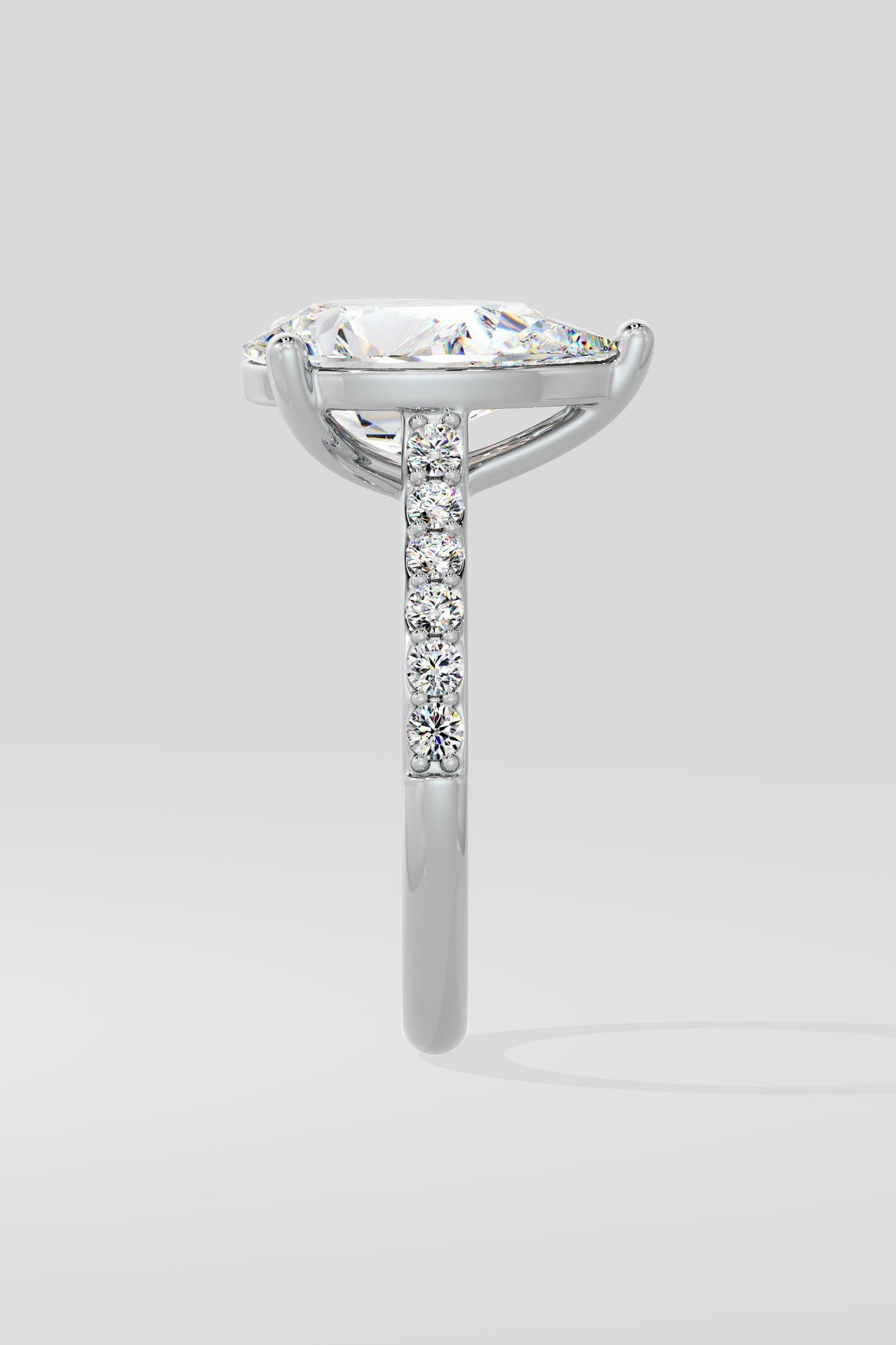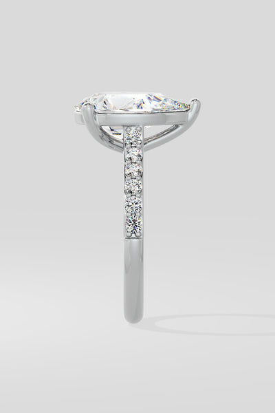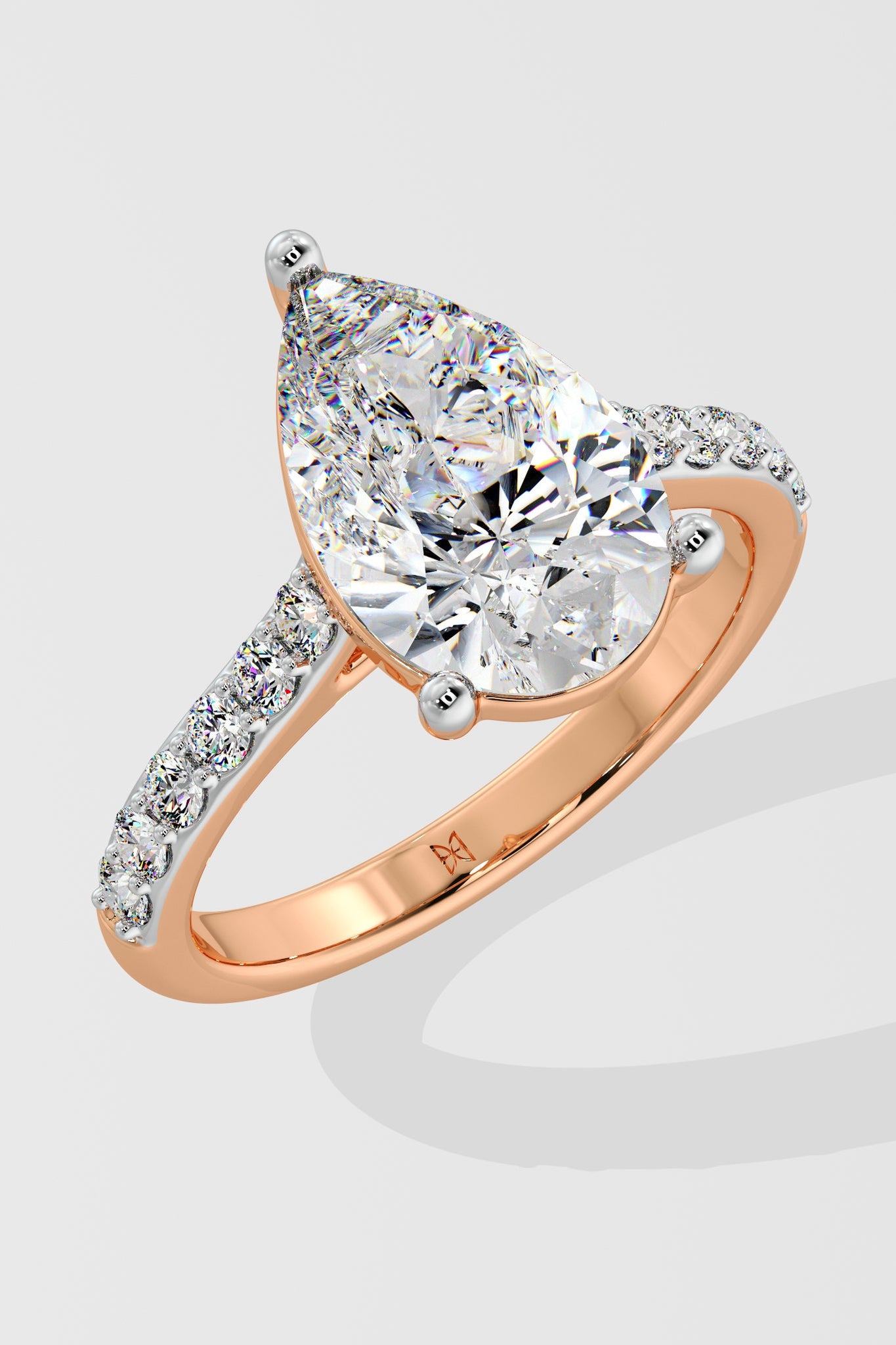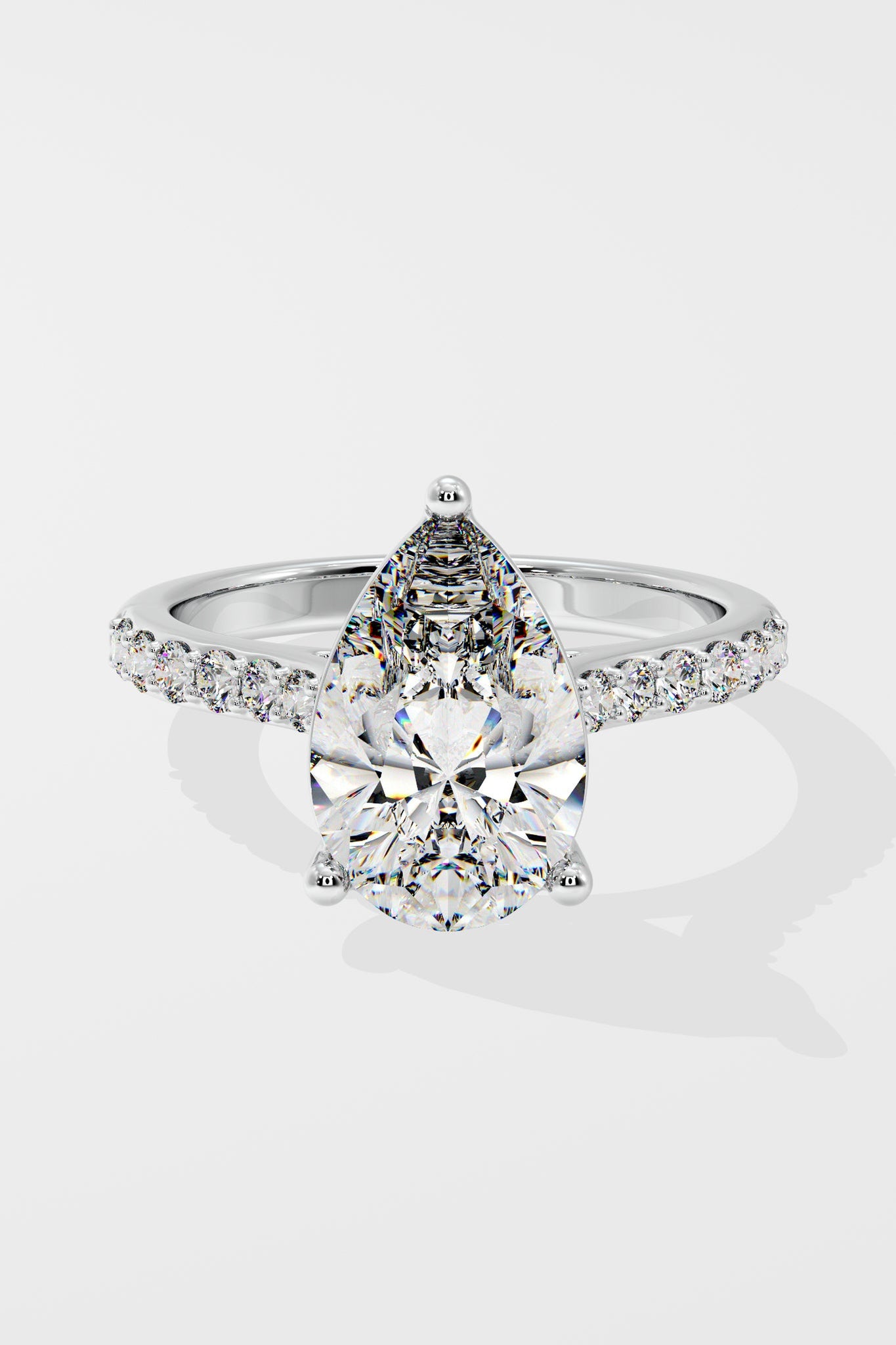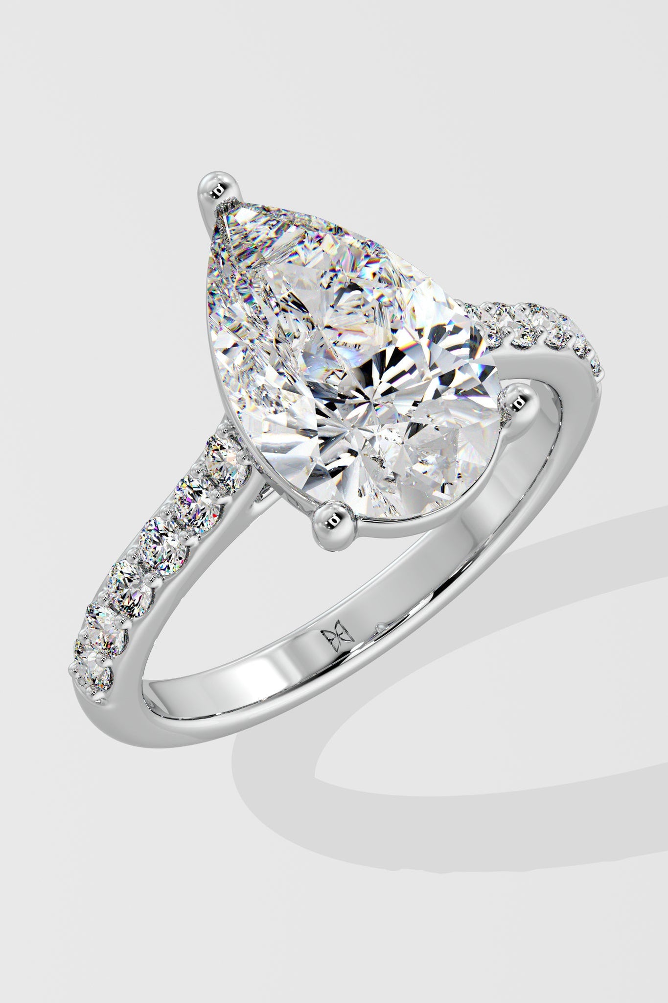The Classic Pear Solitaire Ring features a 2 ct Pear with the classic prong band. The Pear Diamond pushes above its weight by looking bigger than others with diamond bands. A timeless engagement ring & a statement solitaire.