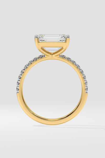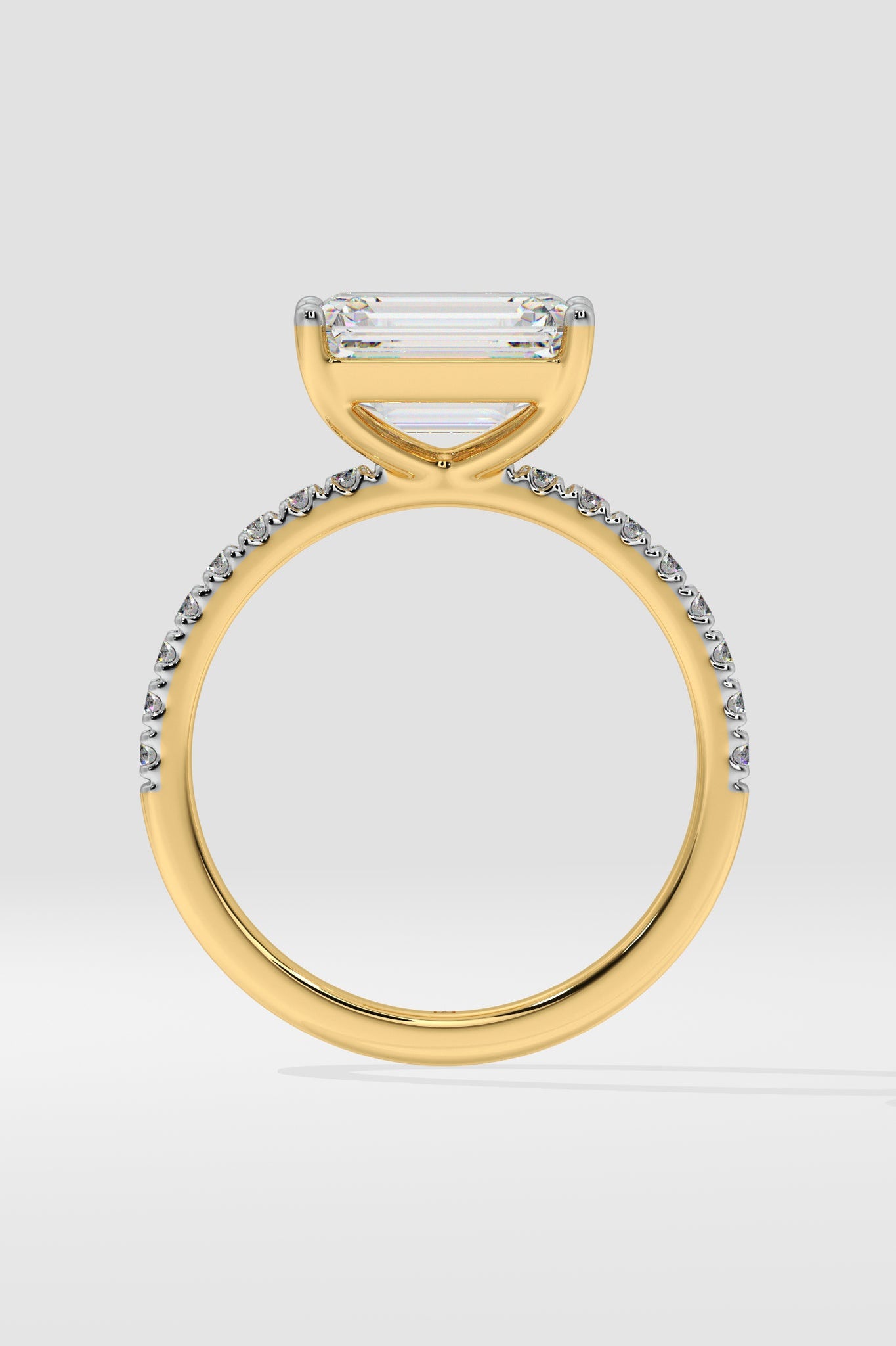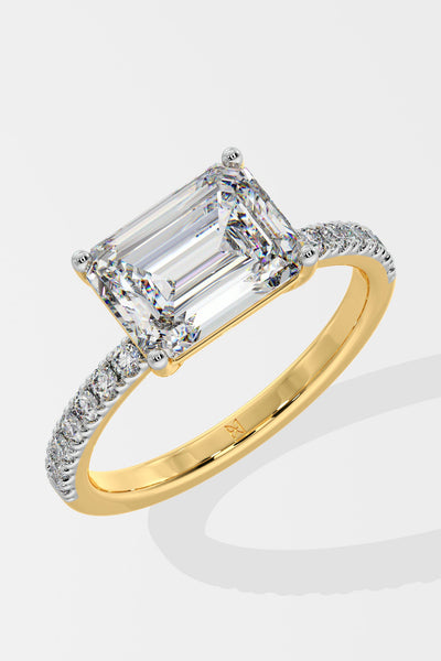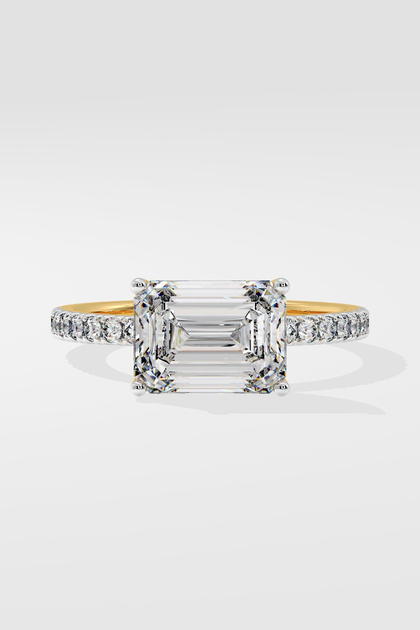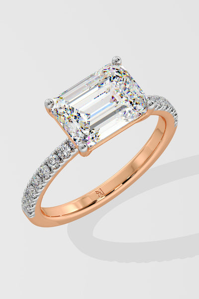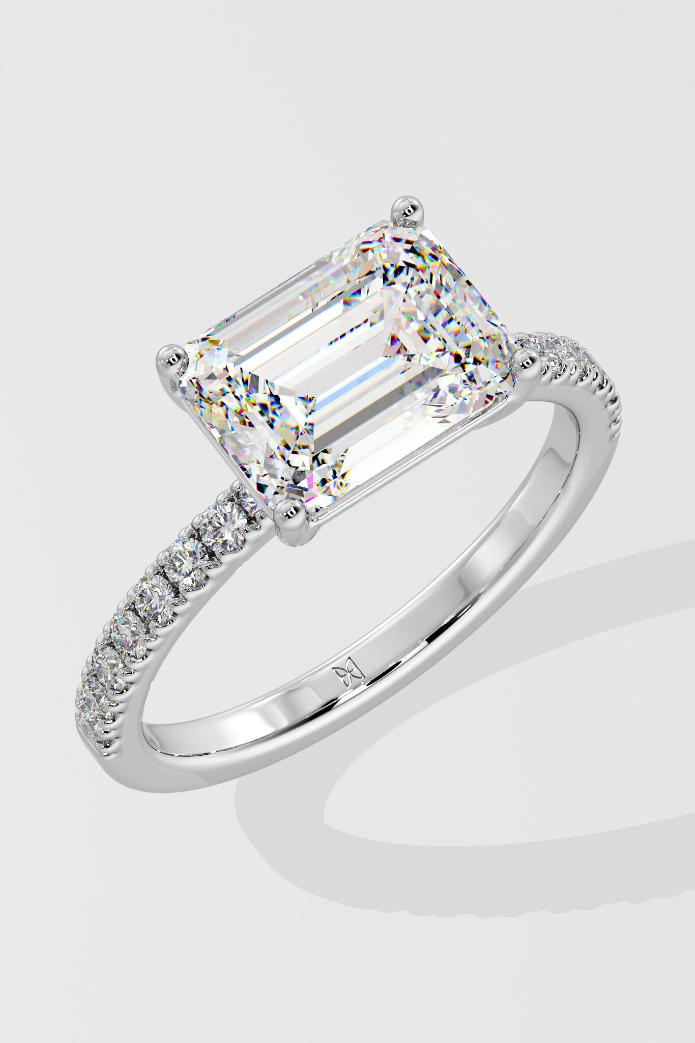 The East-West setting is a subtle shift in perspective to modernize a timeless look. Here, a 2 Ct Emerald is set alongside the studded shank. A horizontal treatment for a fresh aesthetic, this one's for the modern bride.