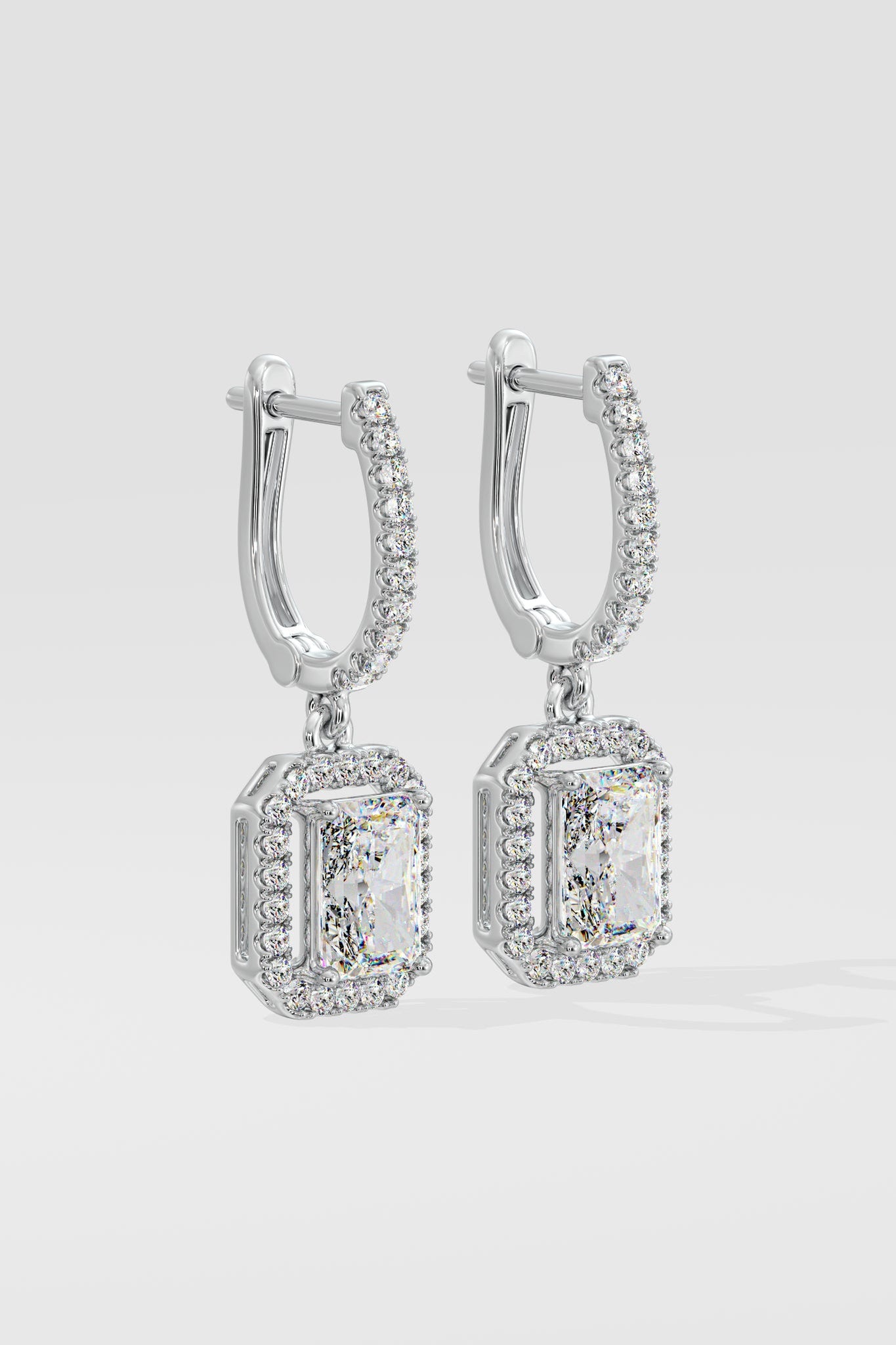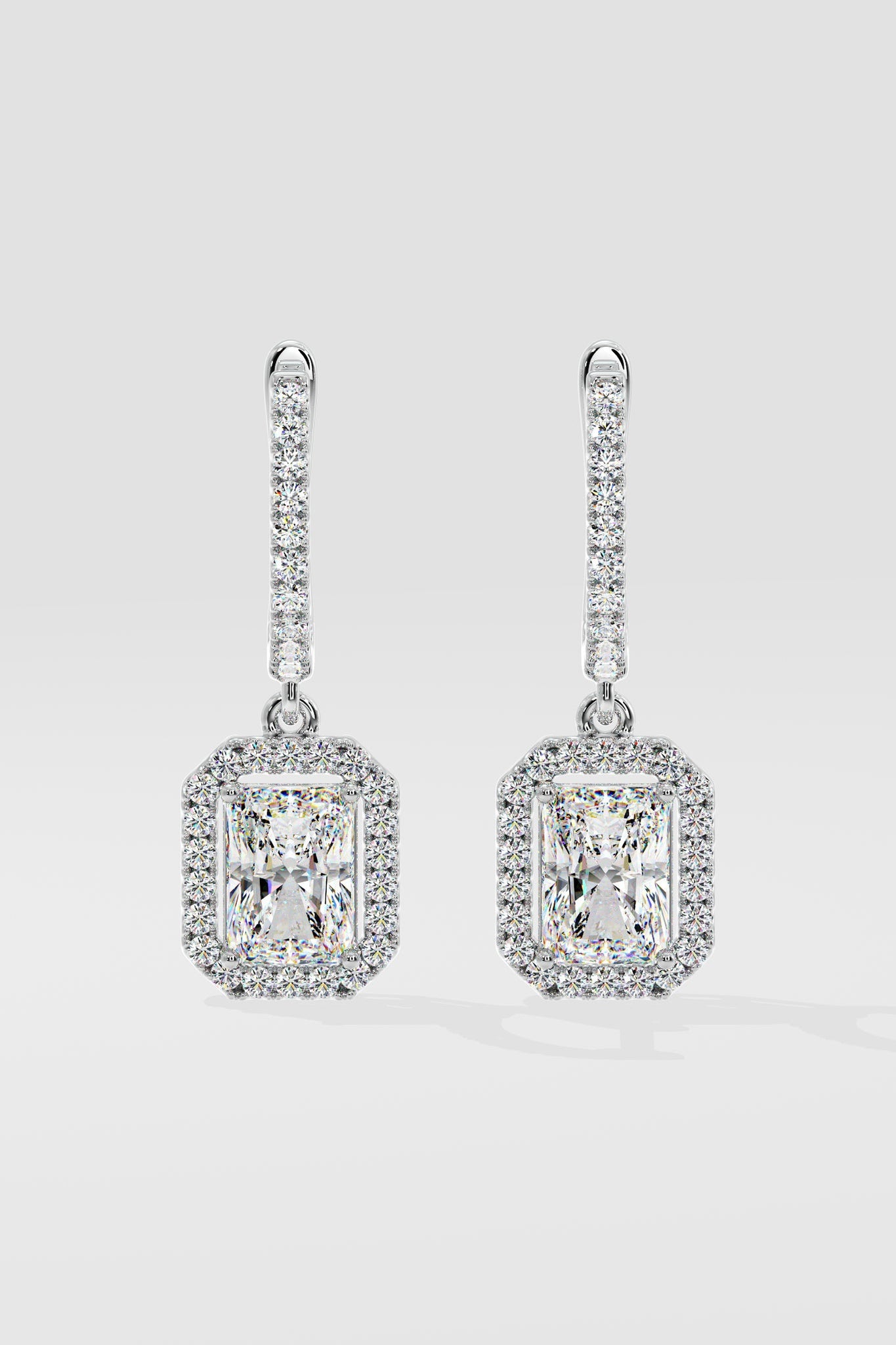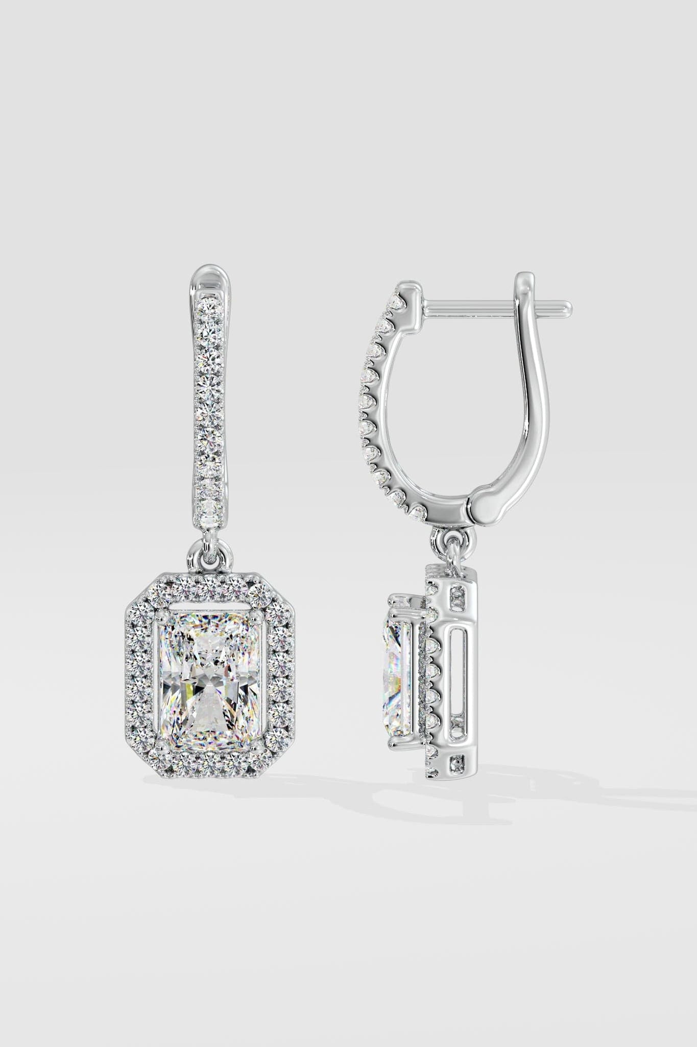 The 2 ct Radiant Danglers feature 1-carat each centers with our classic delicate halo. The dangling Radiants sway gracefully, they add a touch of sophistication to your look. Crafted with attention to detail, perfect for any occasion where you want to shine with effortless beauty.