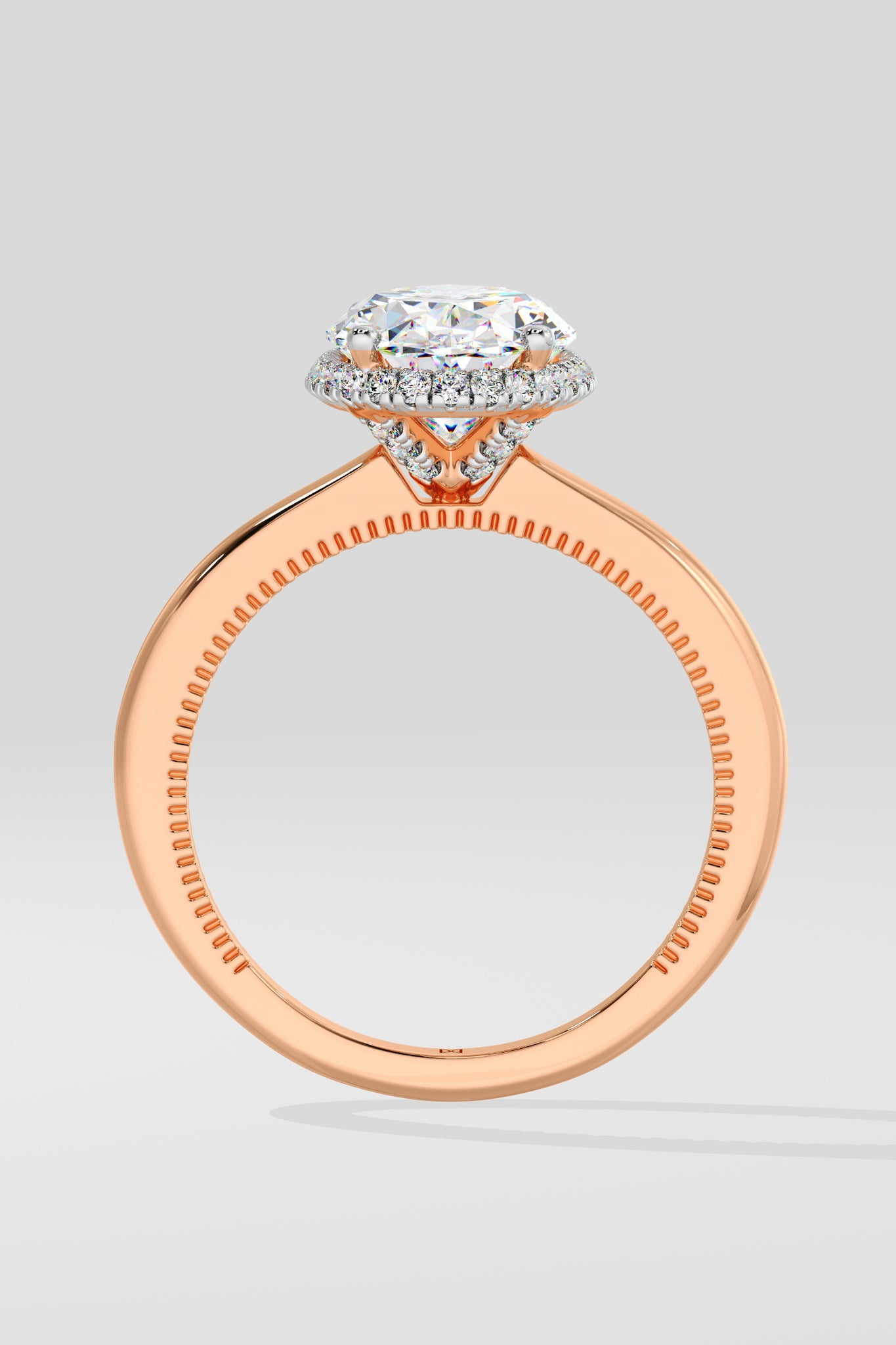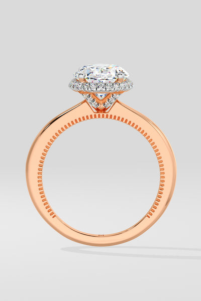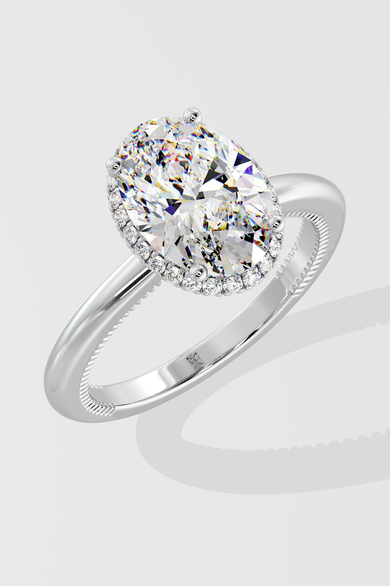 The 2 Ct Oval Halo Ring features a dazzling 2 Ct Oval center Diamond, encircled by a Halo of smaller diamonds for added brilliance. A milgrain on the face of the shank is an added detail.