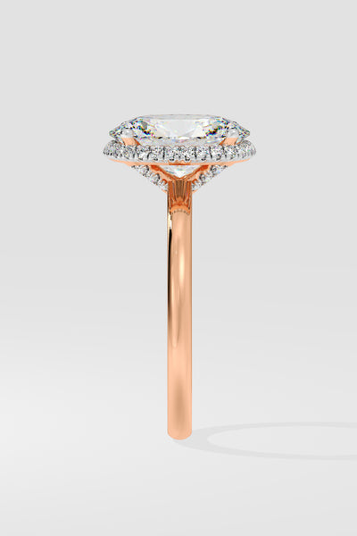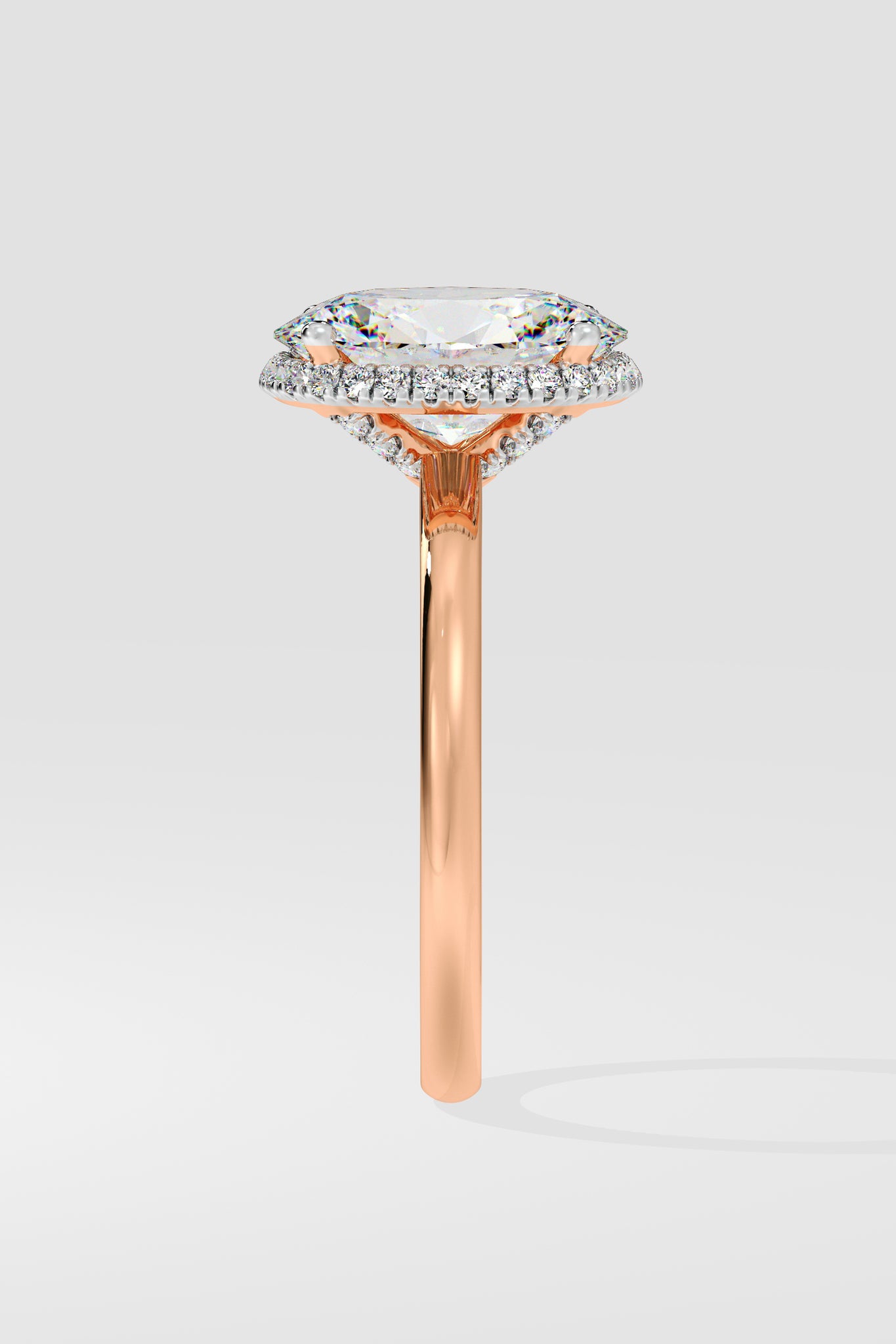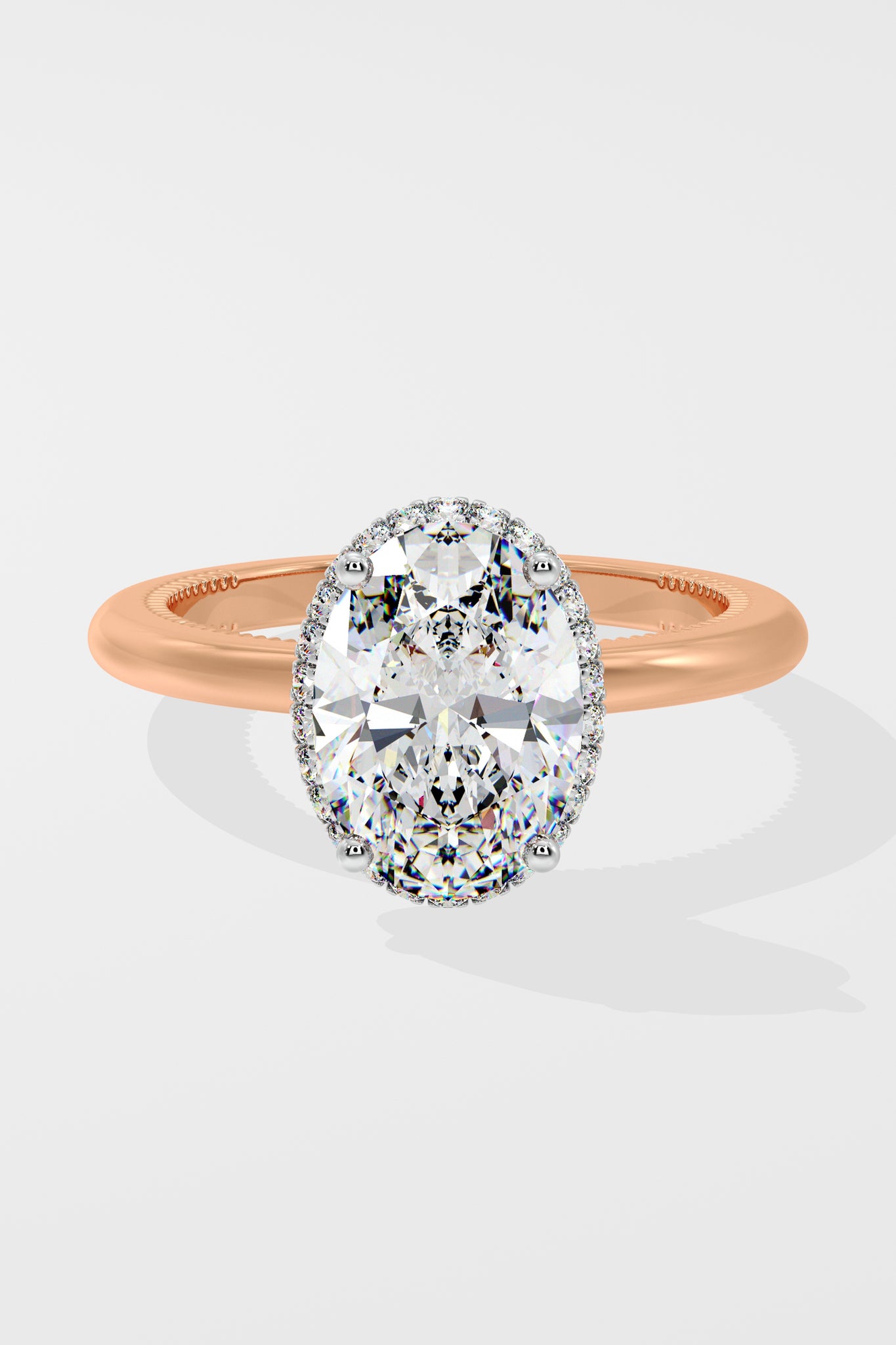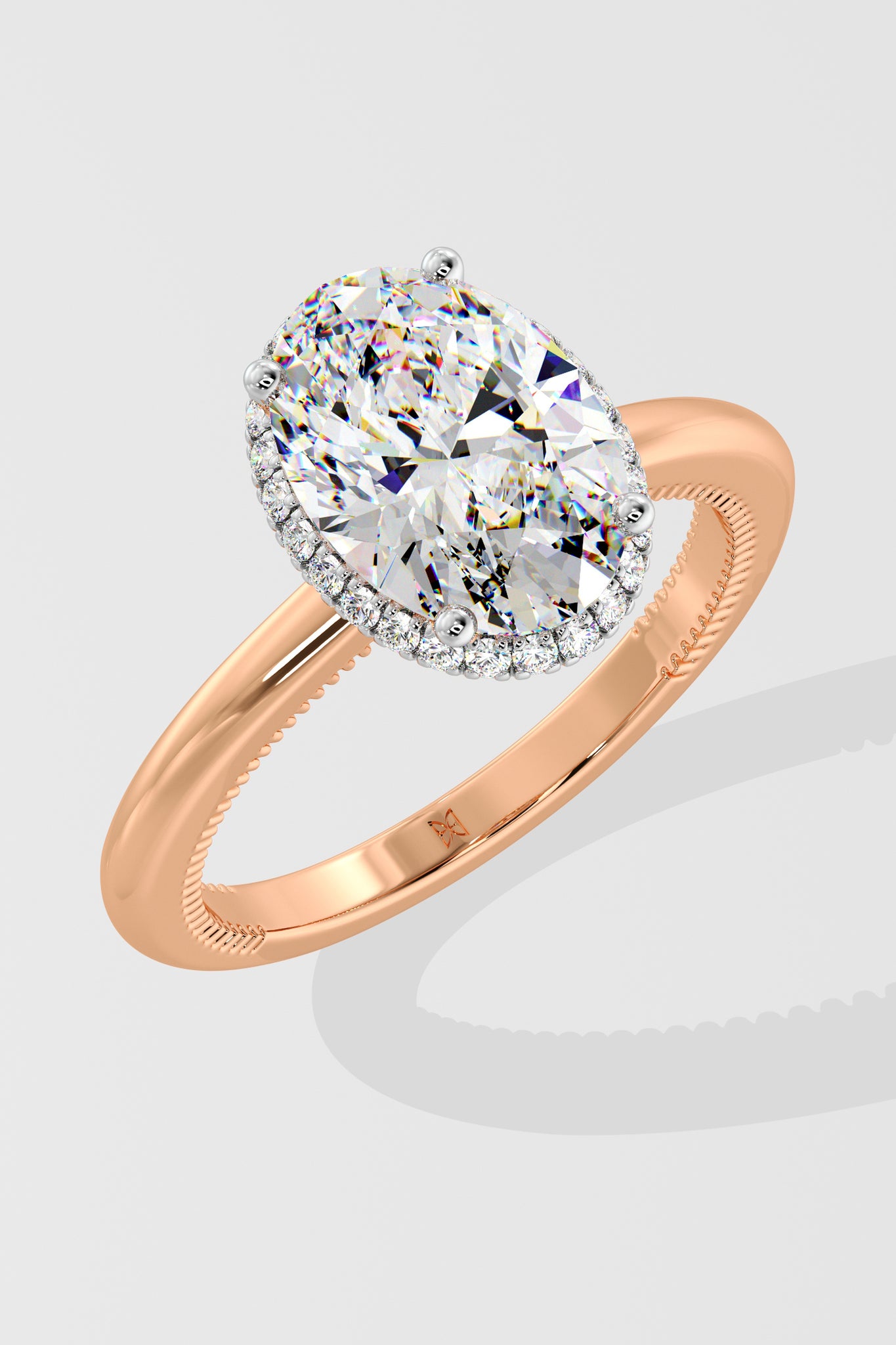 The 2 Ct Oval Halo Ring features a dazzling 2 Ct Oval center Diamond, encircled by a Halo of smaller diamonds for added brilliance. A milgrain on the face of the shank is an added detail.