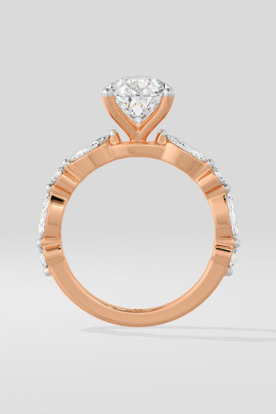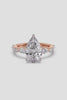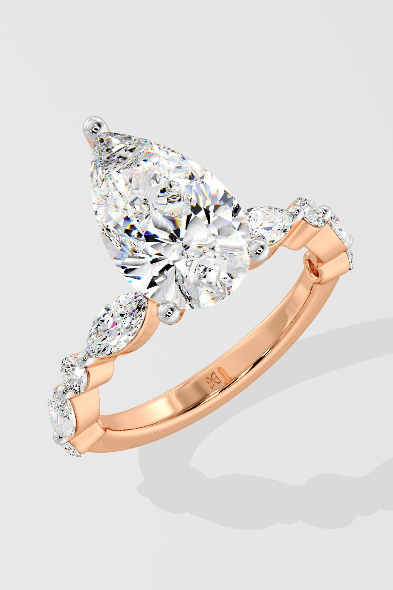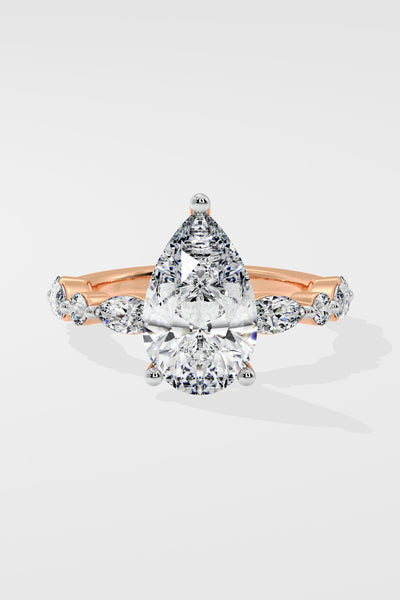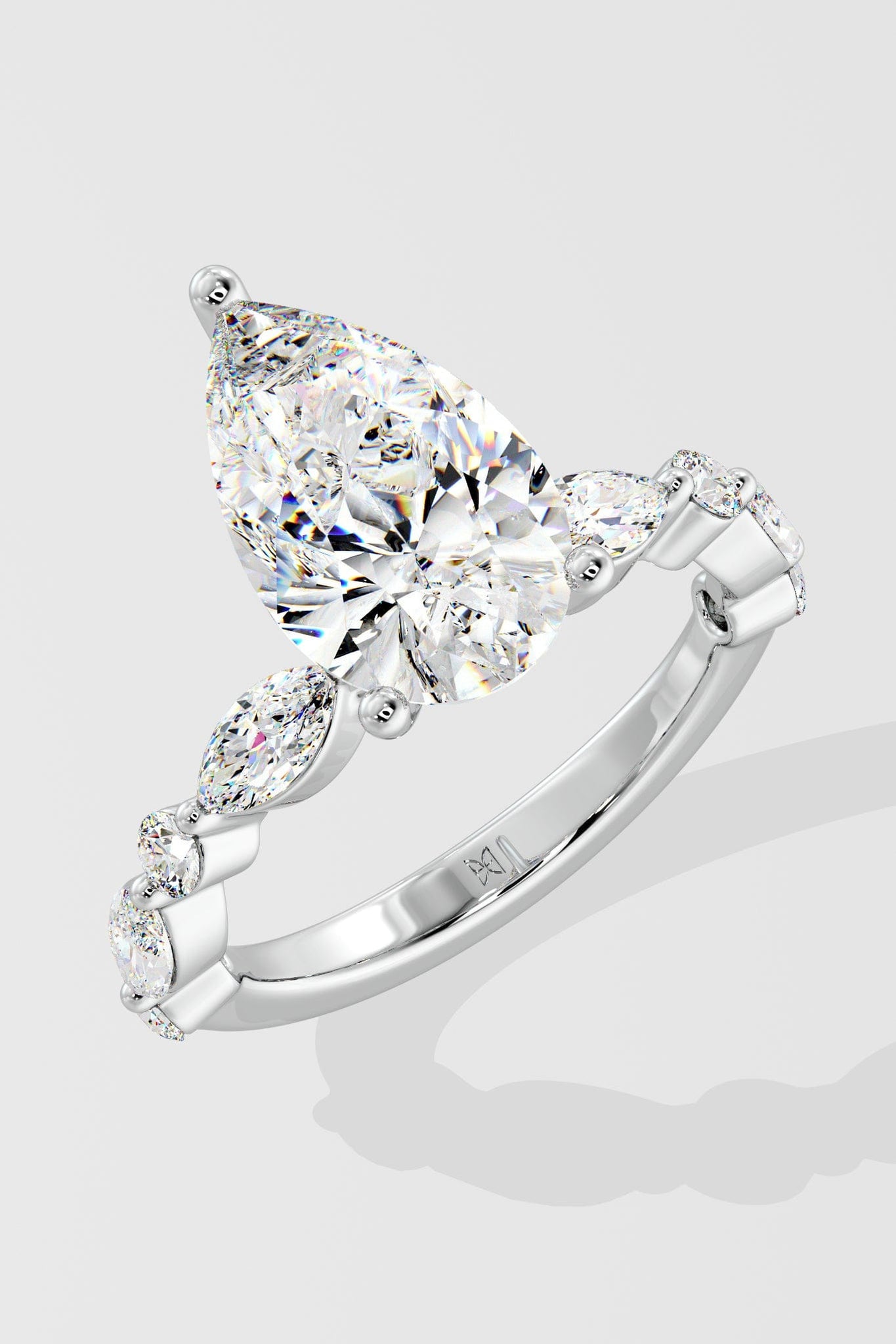 The 2 ct Pear Askew Ring features a pear-shaped diamond set atop the favourite askew band: lined with marquise and round diamonds. An instant 'fall in love' style.