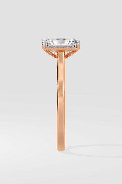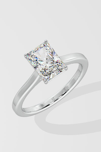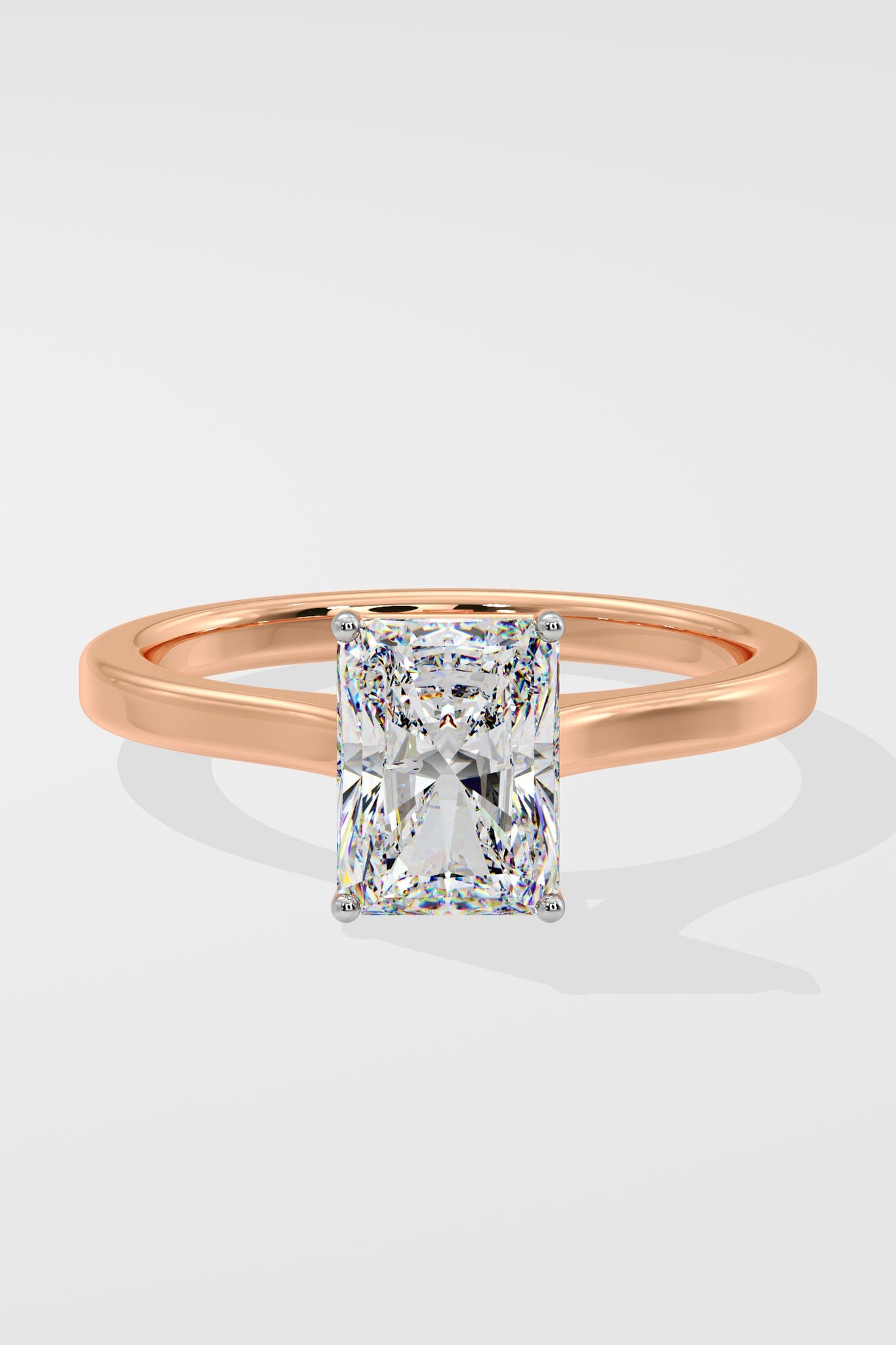 Lab Grown Diamond Radiant Solitaire Ring featuring a classic 2 ct radiant-cut center, designed with a minimal setting to keep the focus entirely on the solitaire. Looks equally stunning in rose gold. Pair it with an eternity band to create your own timeless stack.
