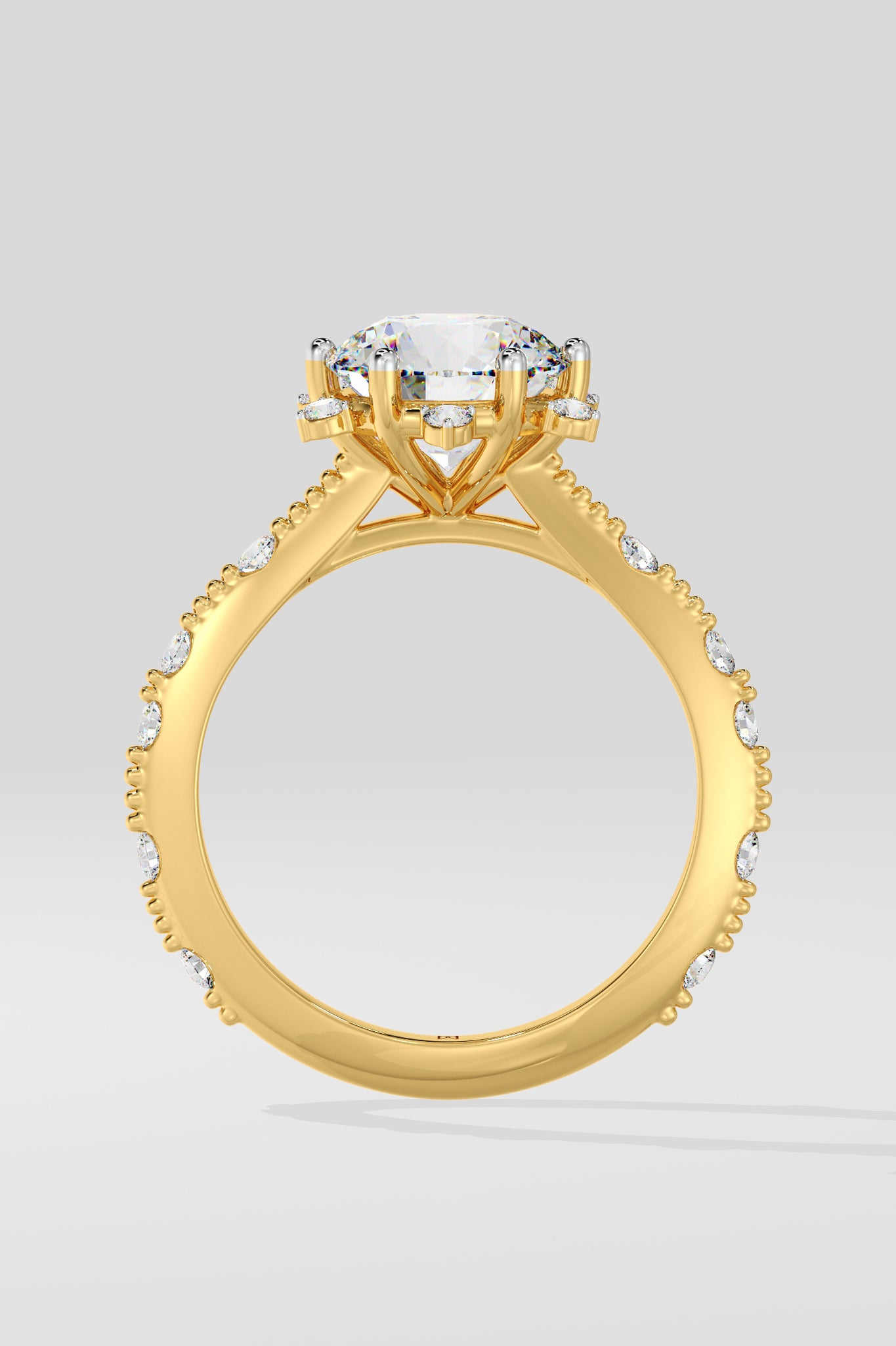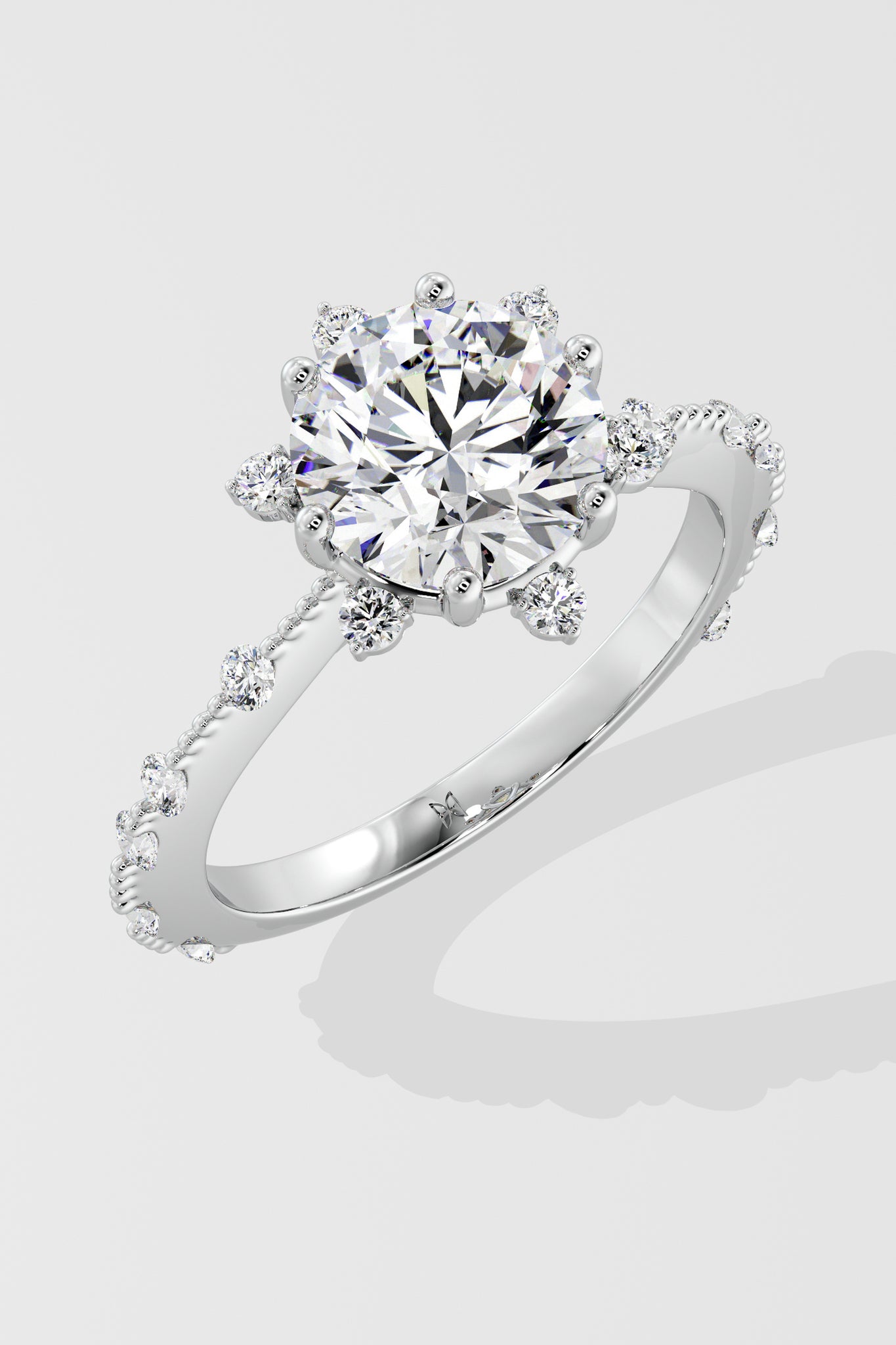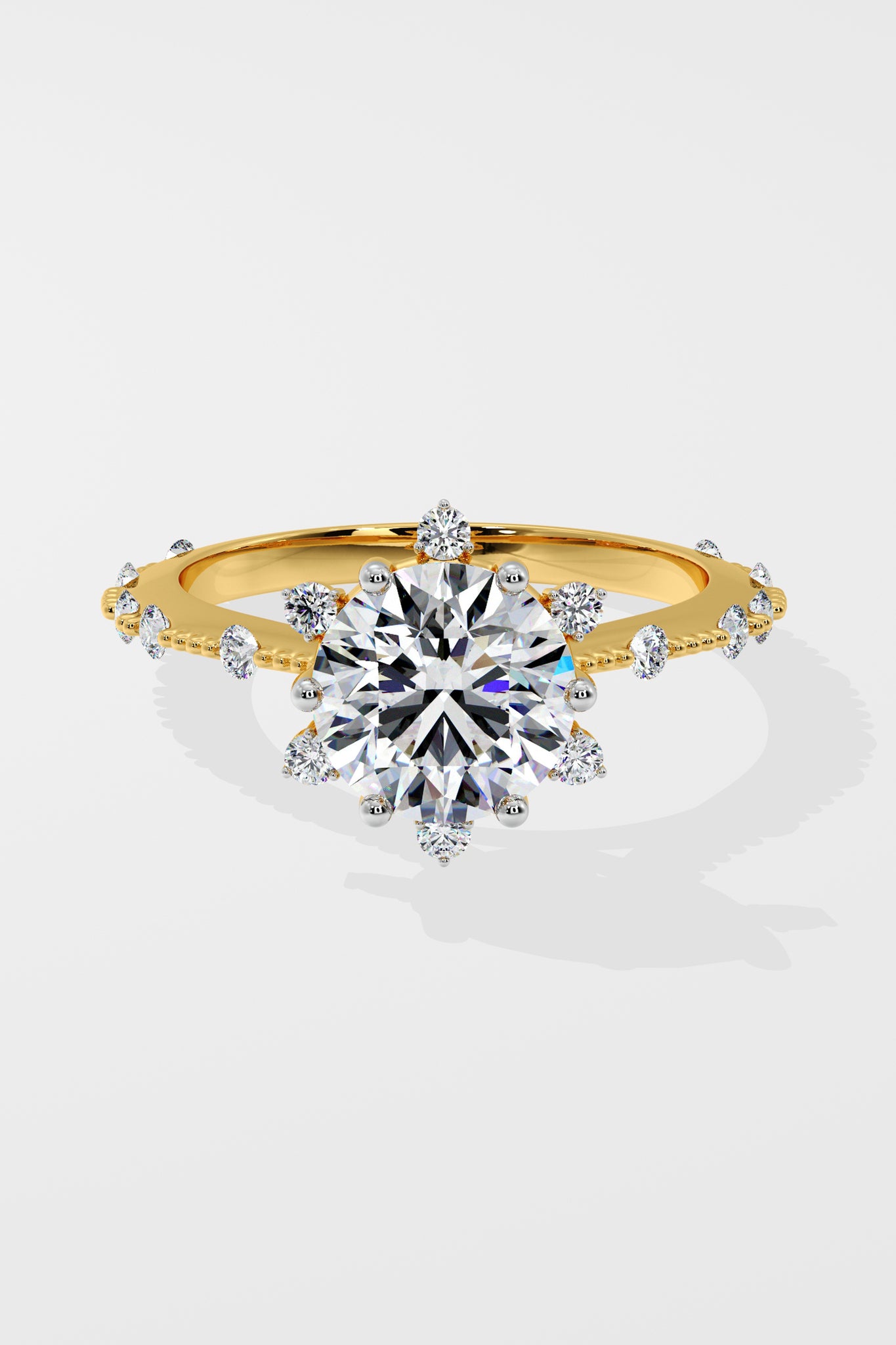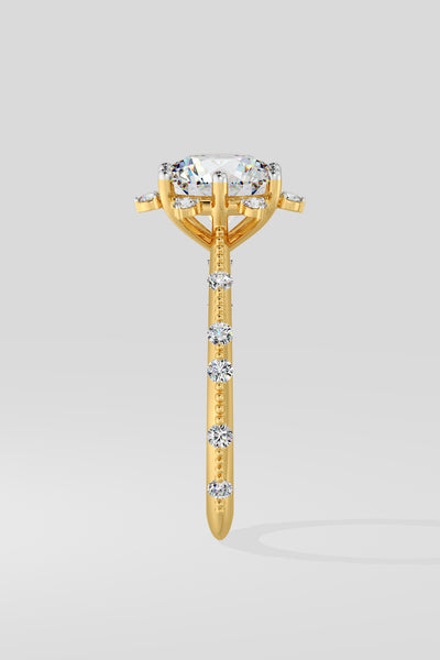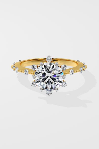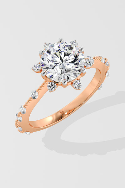 Lab Grown 2 Ct Starlight Solitaire Ring, featuring a Round center Diamond that is embraced by a star-like design at every angle. Delicate diamonds adorning the shank add a touch of uniqueness.