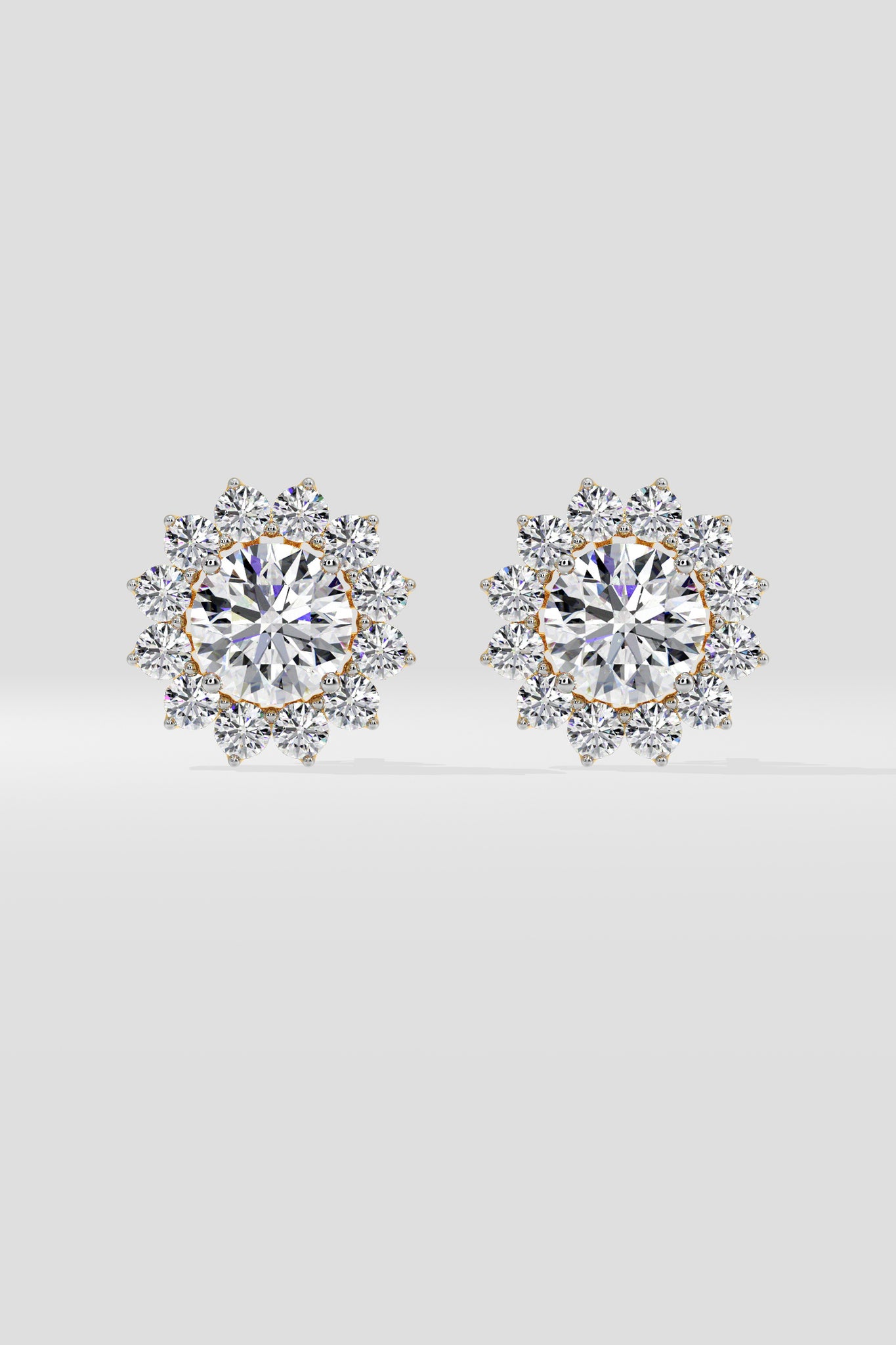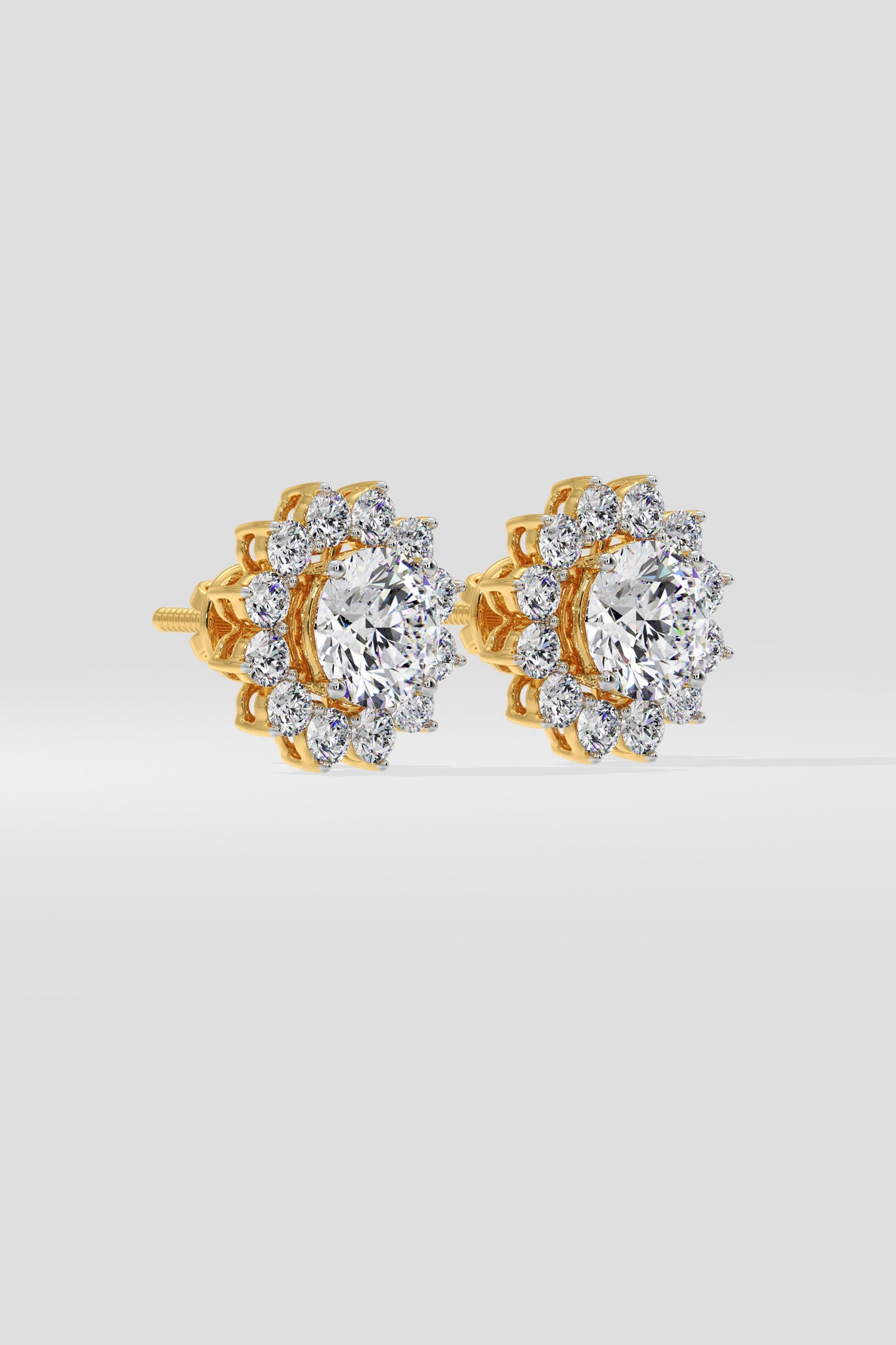 The Sunflower Halo Studs feature 1 ct centers. A delicate halo of 0.04 ct each diamond forms the beautiful and radiant sunflower halo. Opt for a detachable halo to have the option of going classic solo as well.