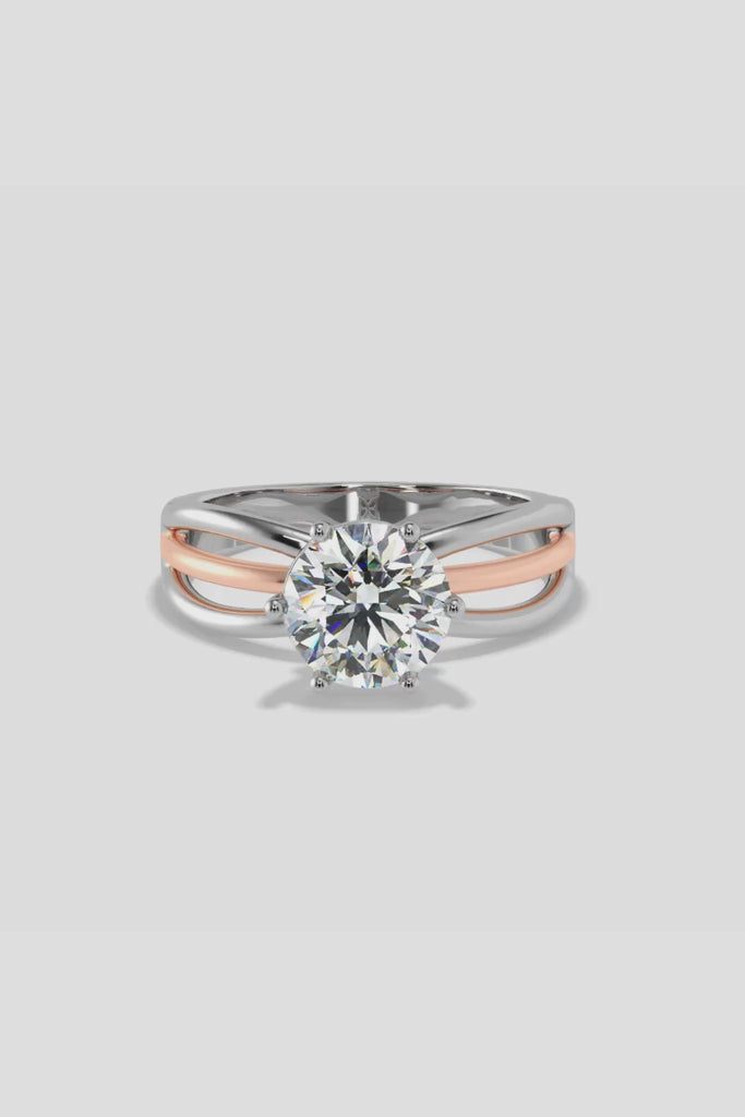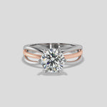 Lab Grown 2 Ct Ring is one for the fans of a fuller broader band look. Featured here is in two-tone with the center one in rose gold. Also, a beautiful nuance to this ring is the hidden rope halo, in the bold single solitaire ring with a playful mix of the gold.