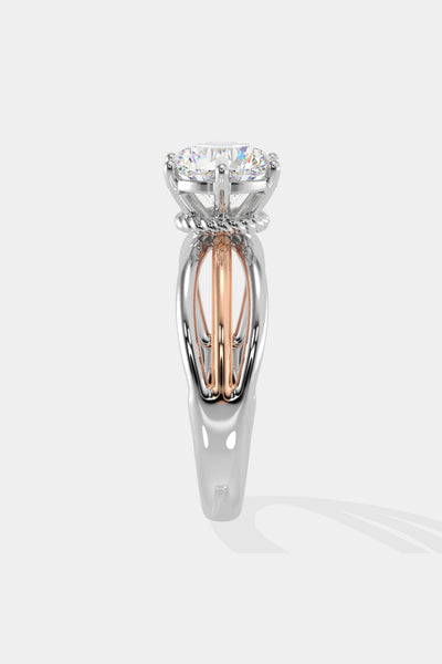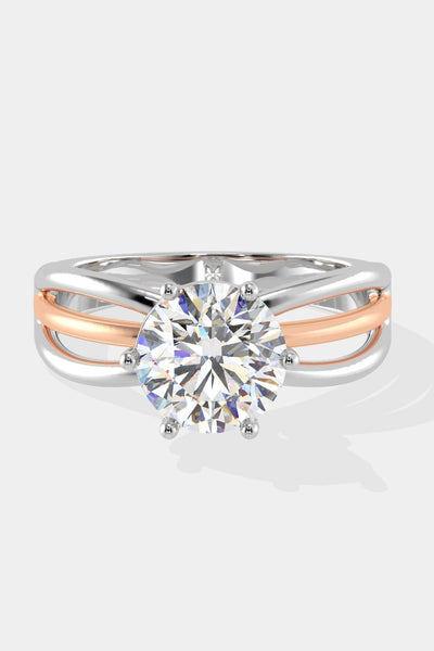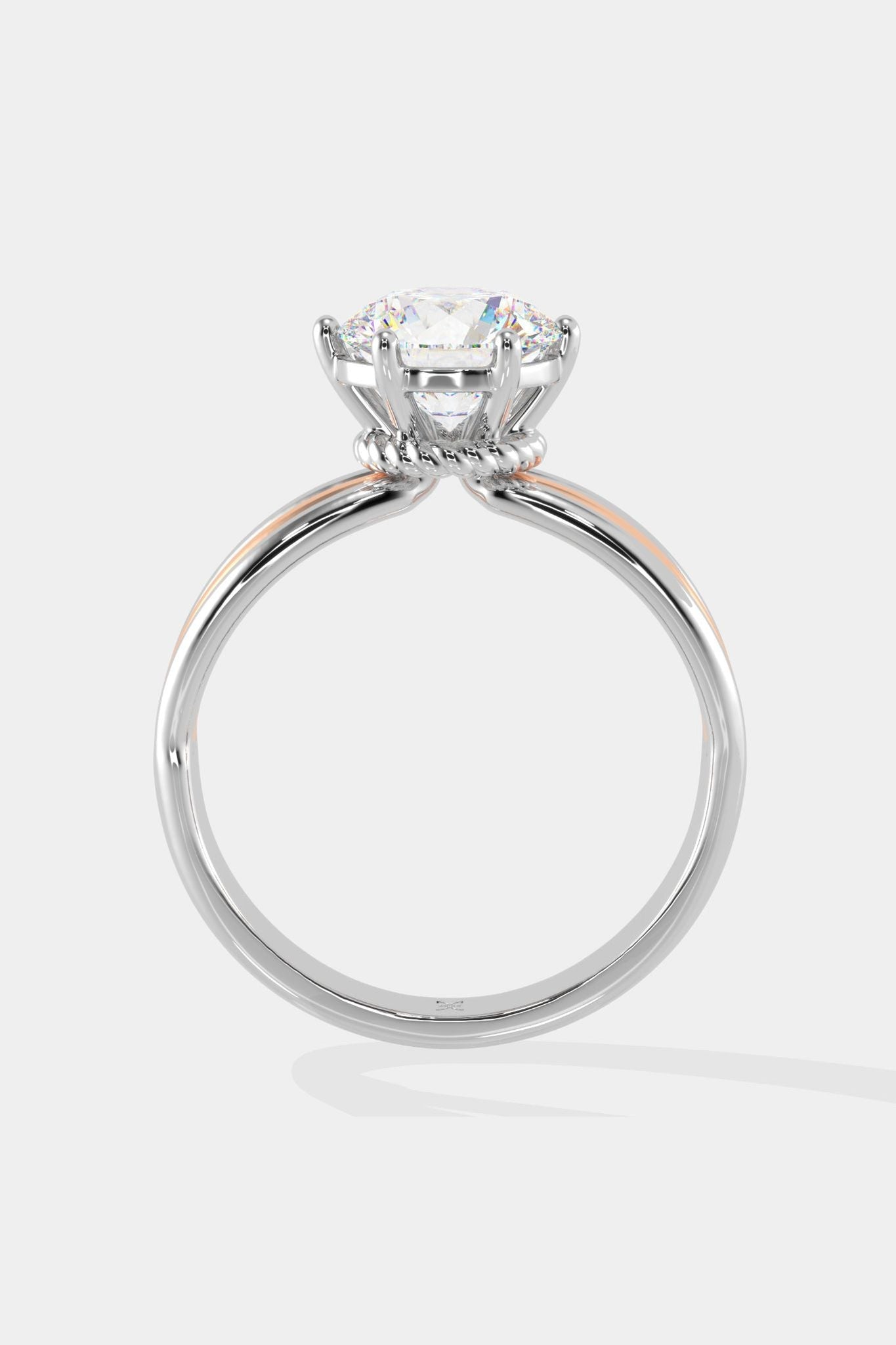 Lab Grown 2 Ct Ring is one for the fans of a fuller broader band look. Featured here is in two-tone with the center one in rose gold. Also, a beautiful nuance to this ring is the hidden rope halo, in the bold single solitaire ring with a playful mix of the gold.