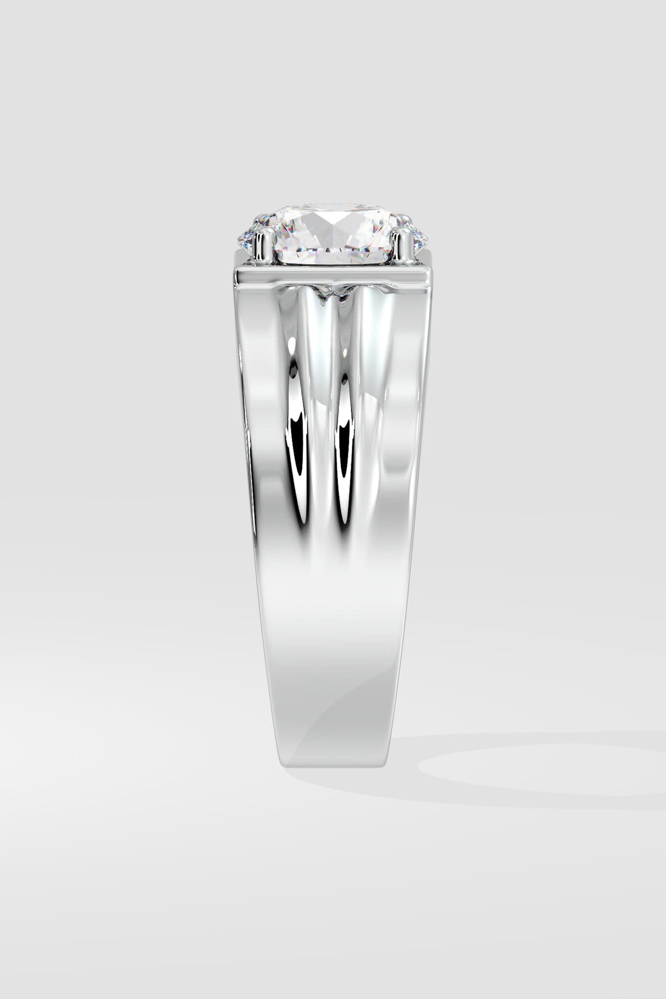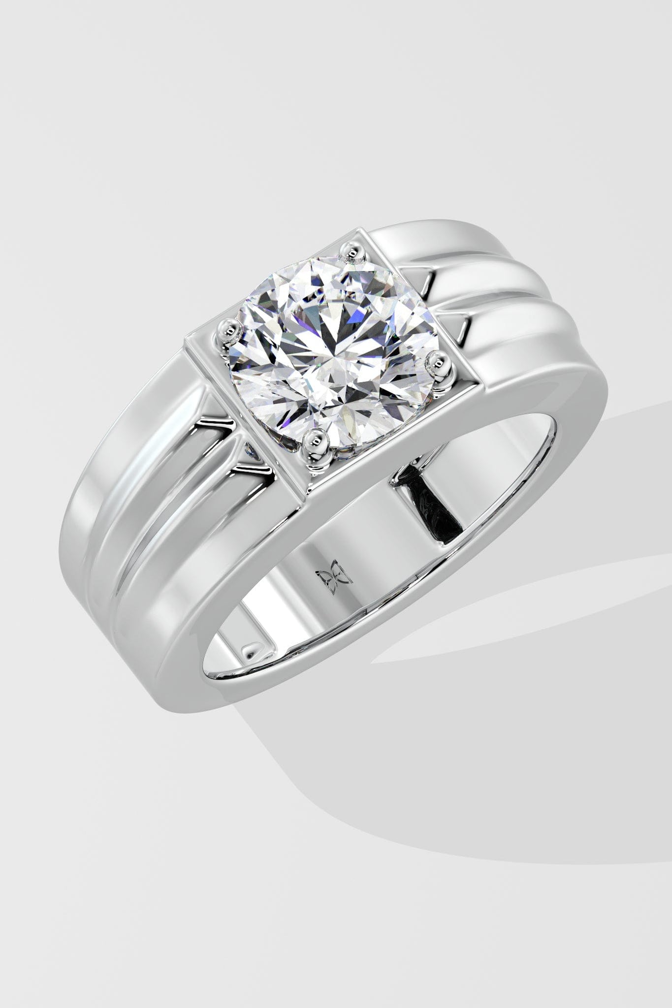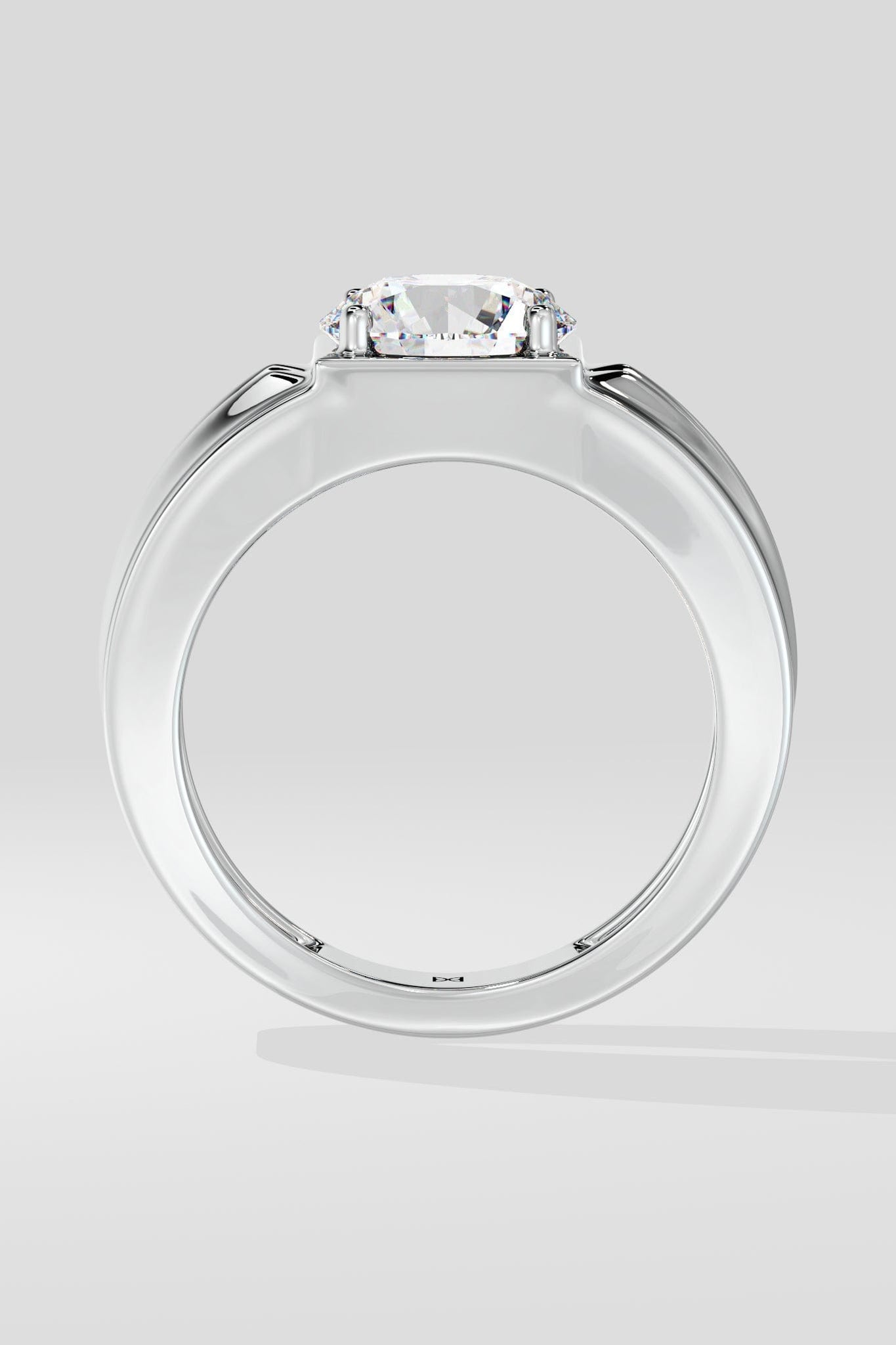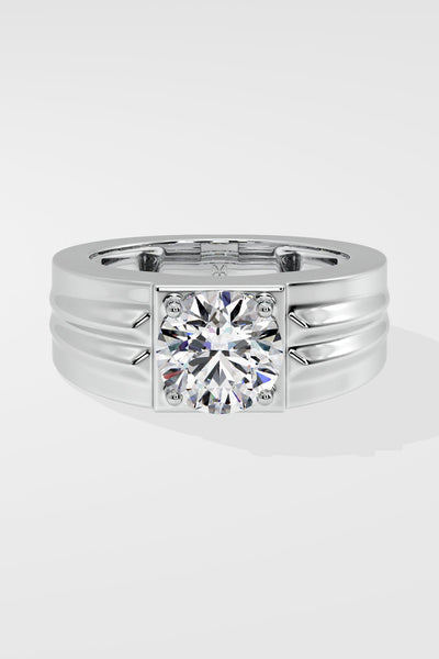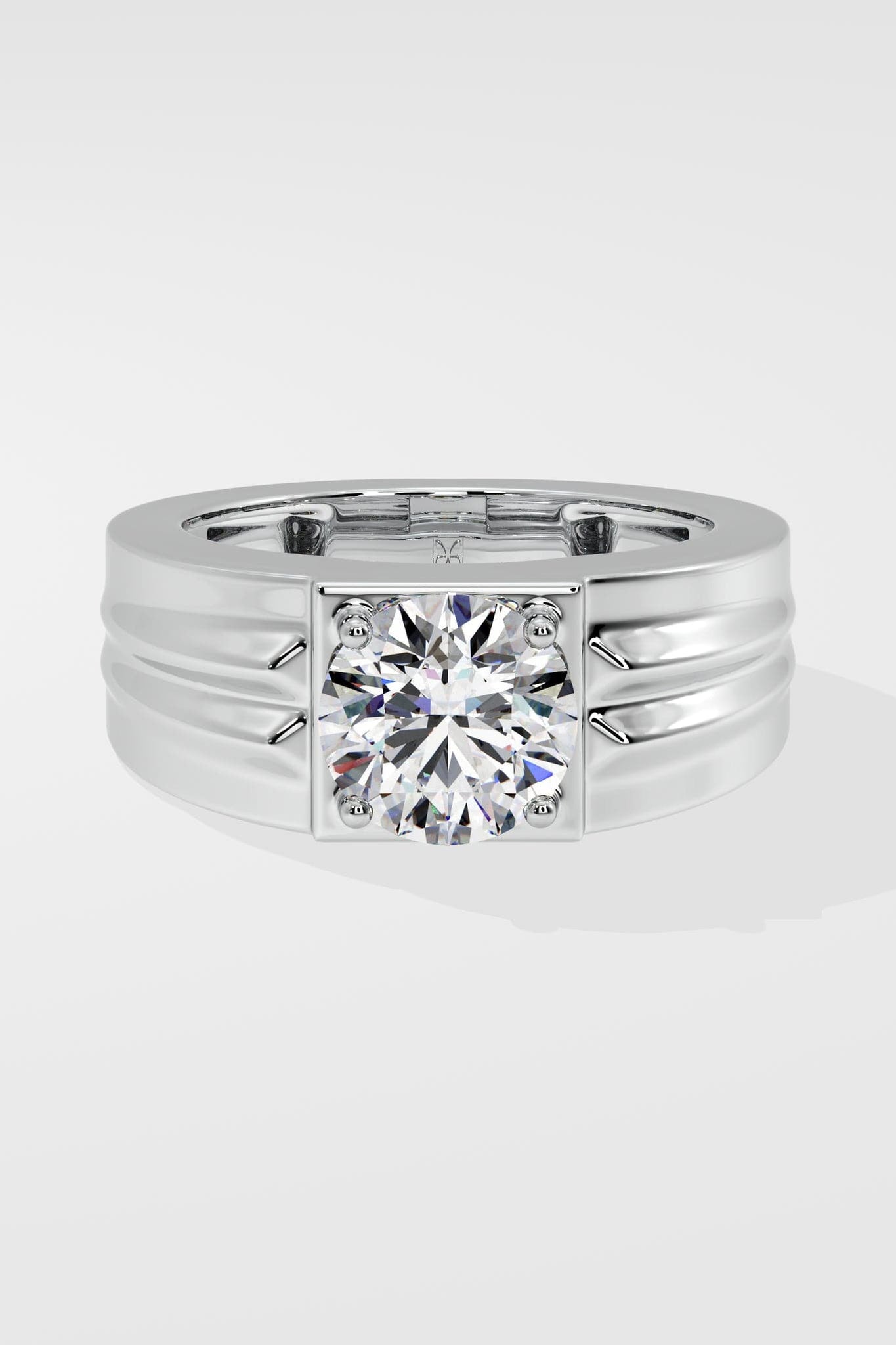 The 3 Ct Avalon Ring features a Round Diamond set in a solid, polished band. Clean grooves on the band add structure and detail, giving it a modern and robust look.