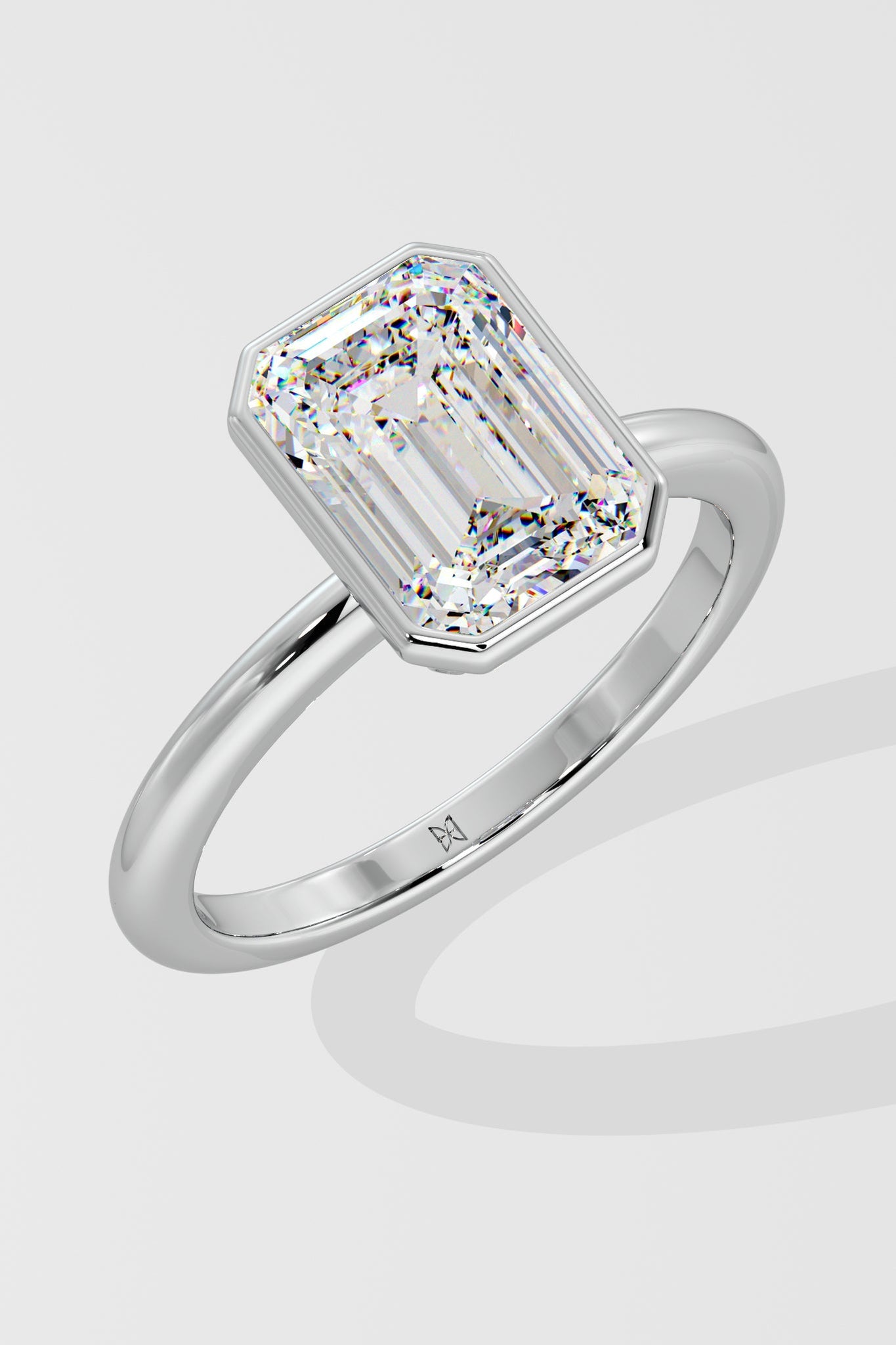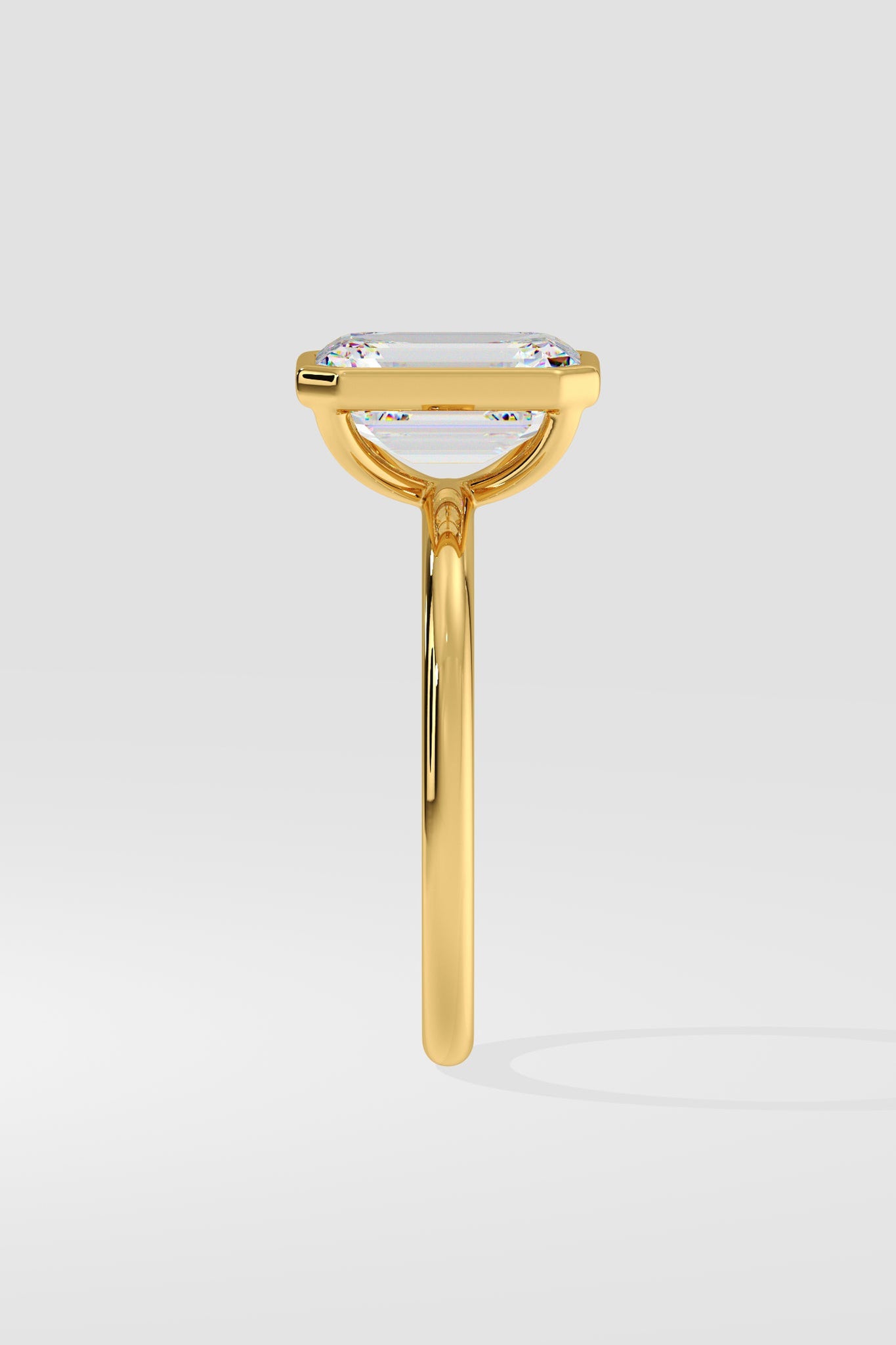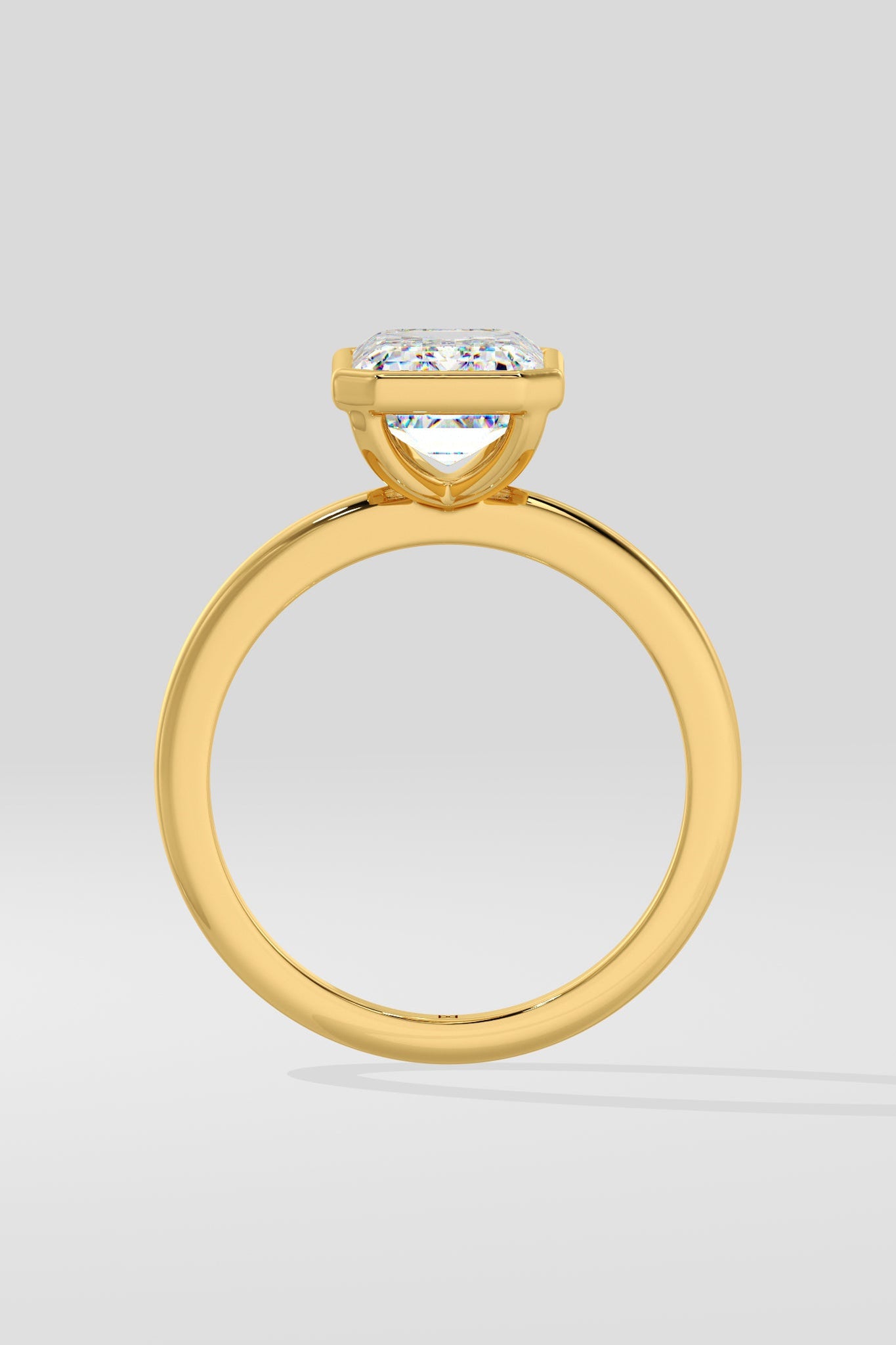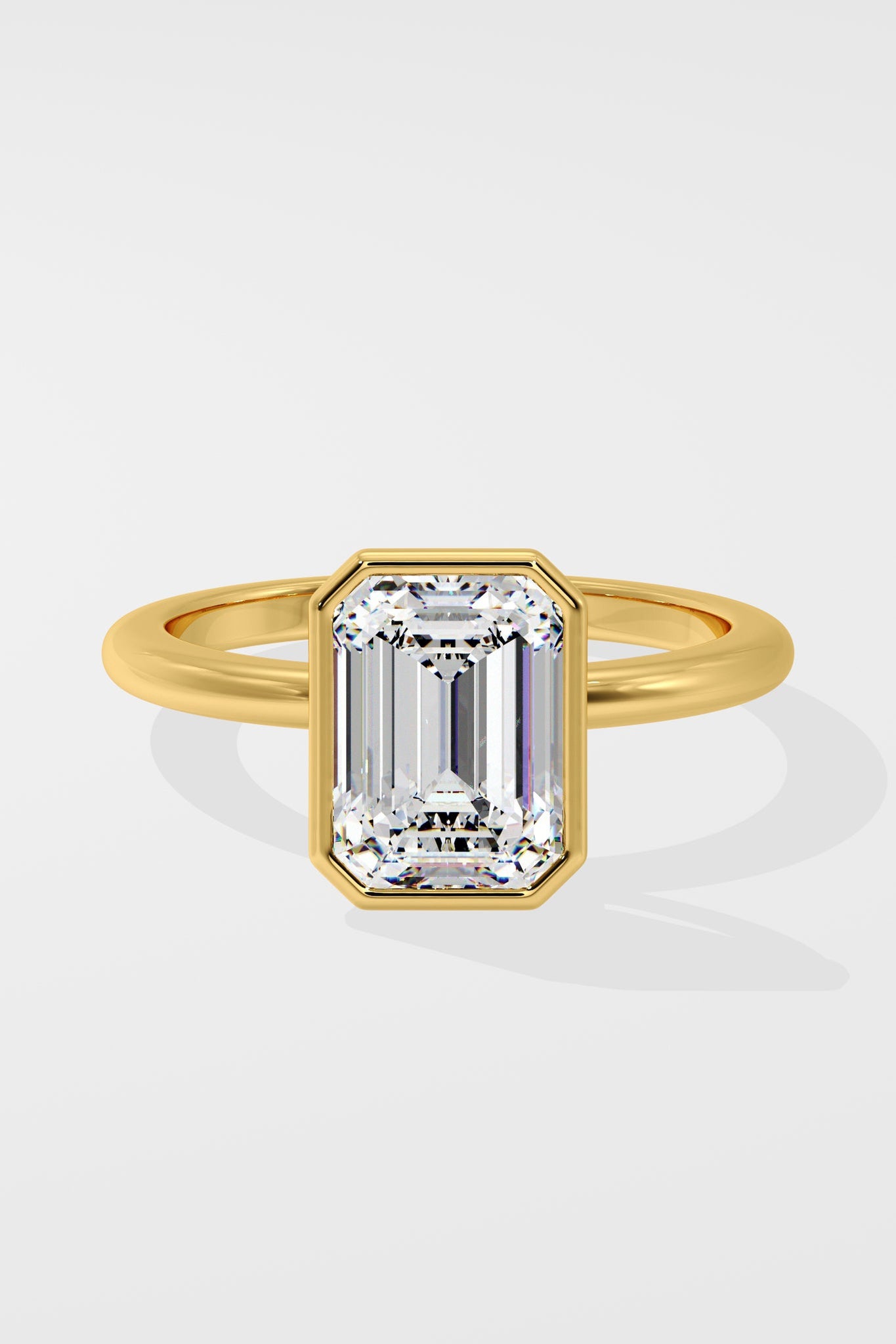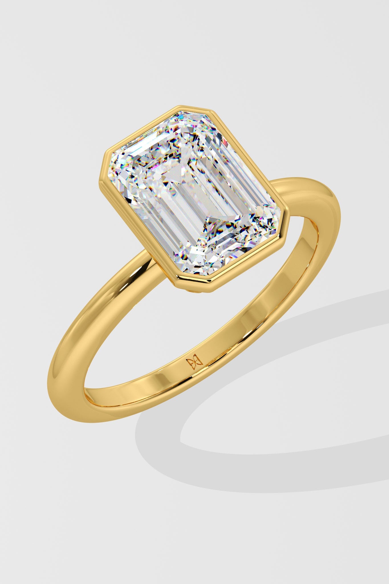 The Ring features a stunning 3 ct Emerald cut diamond, securely set in a gold bezel. The bezel setting amplifies the diamond's brilliance while offering a sleek, modern look.