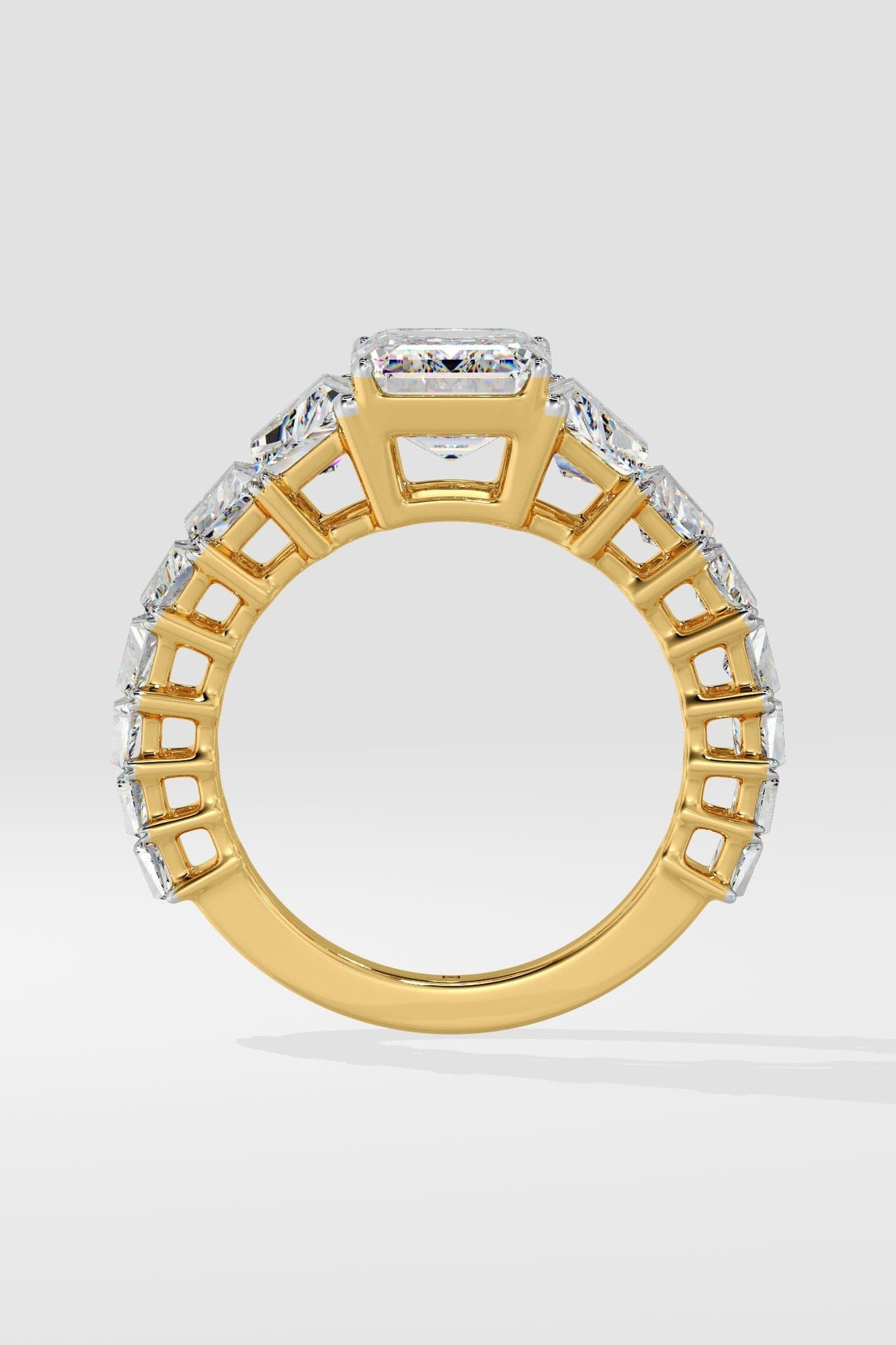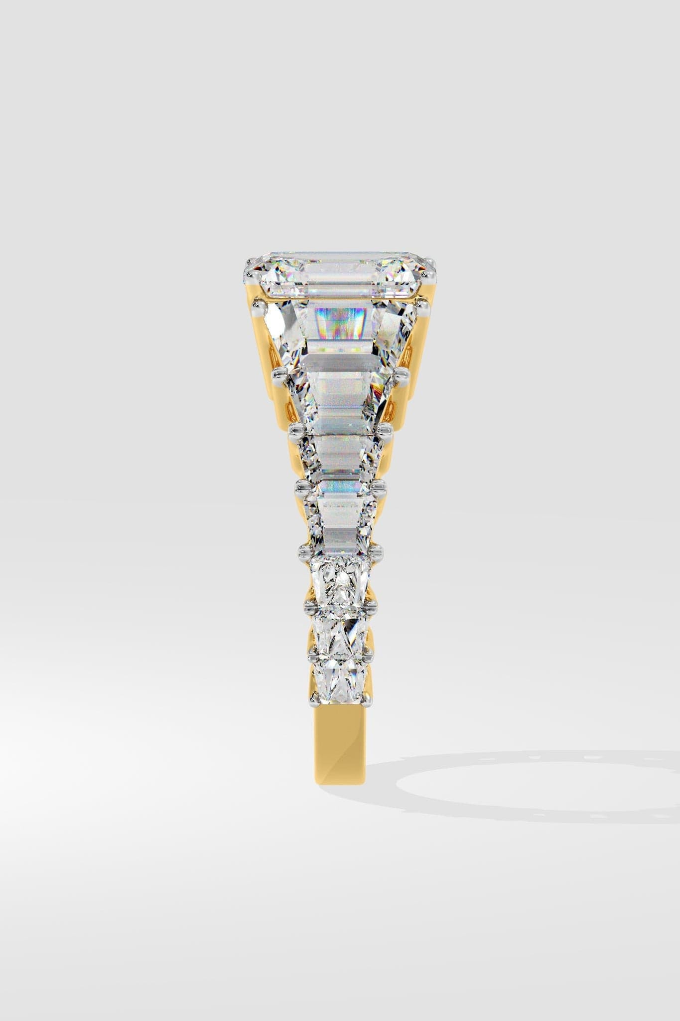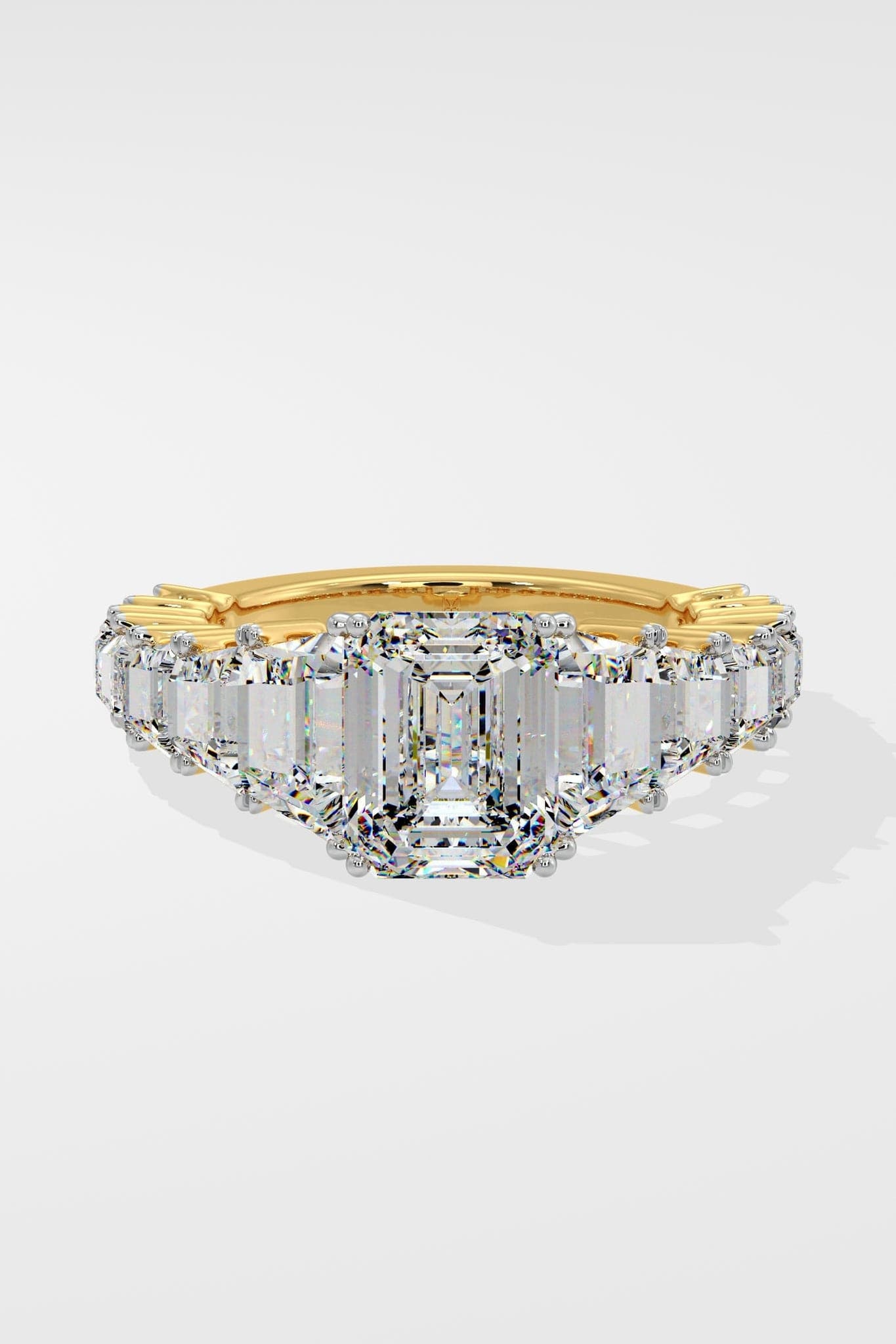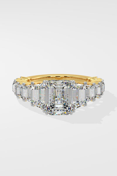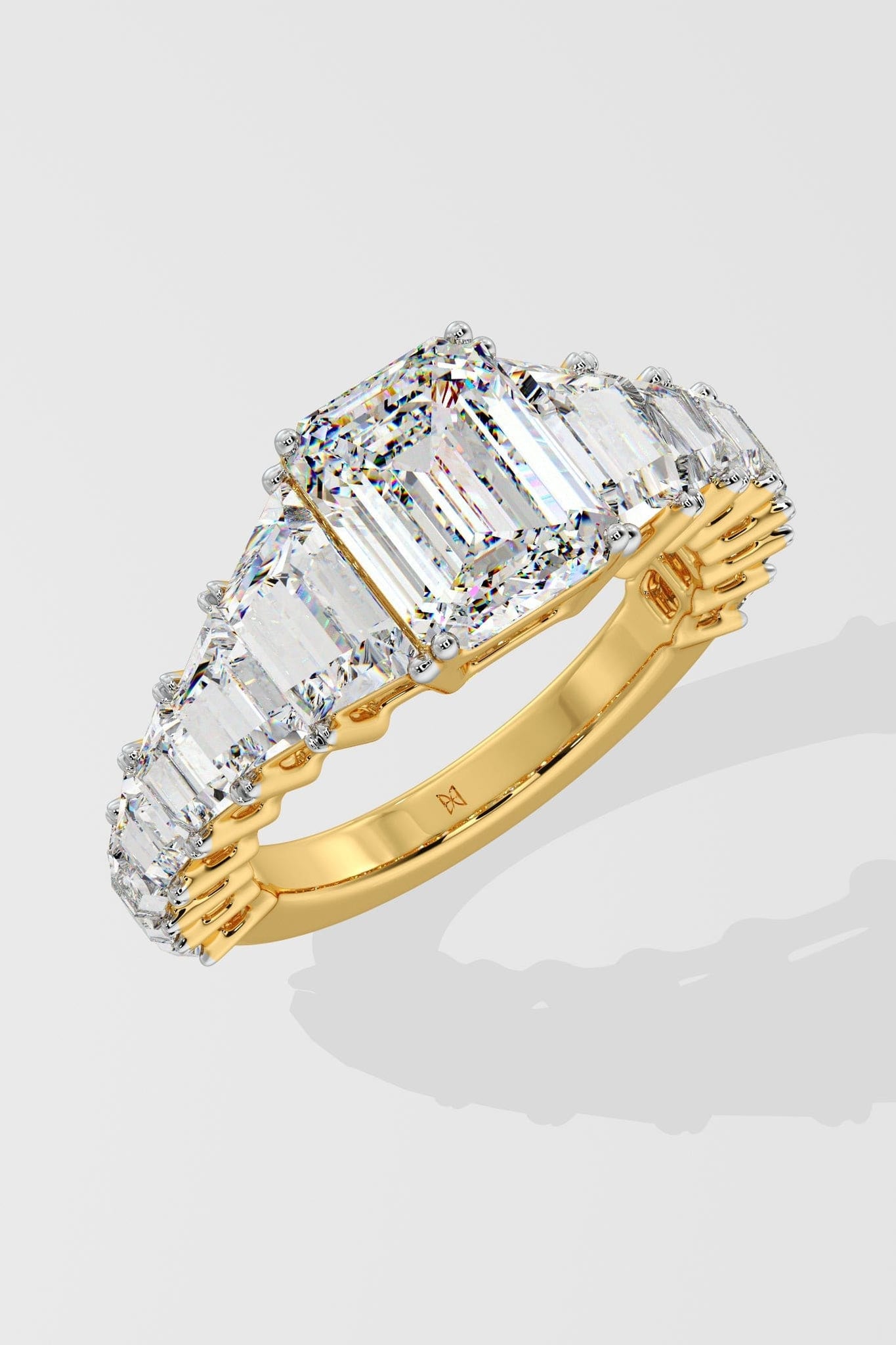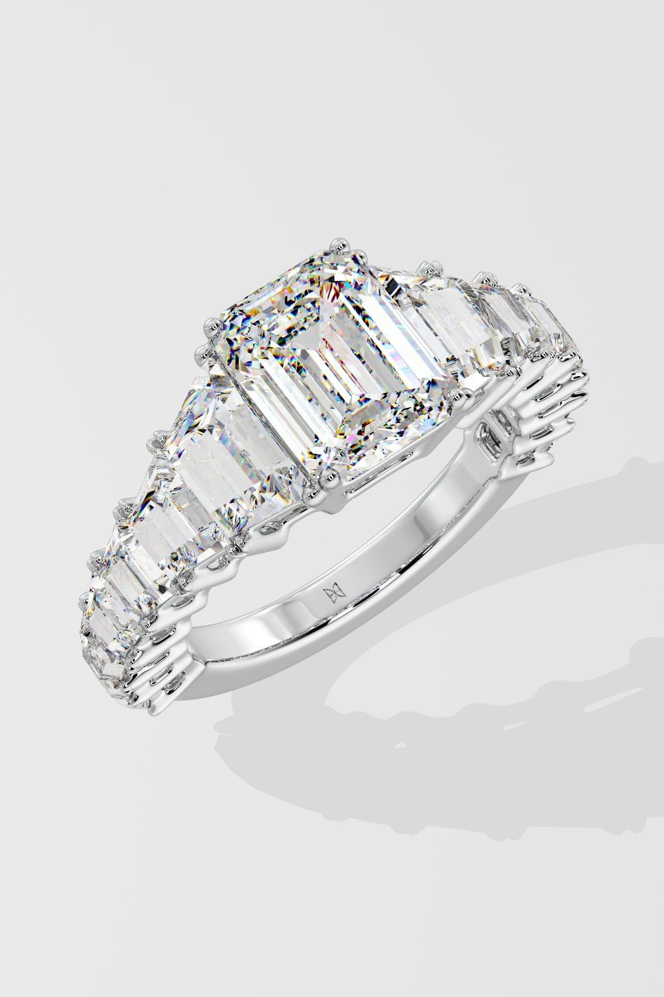 The 3 ct Emerald Grandeur Lab Grown Diamond Ring is a modern masterpiece. It features a bold 3 ct solitaire at the centre, flanked by specially cut 0.50 ct trapezoids in perfect balance. A ring unlike any other, it embodies flair, elegance, and true grandeur.