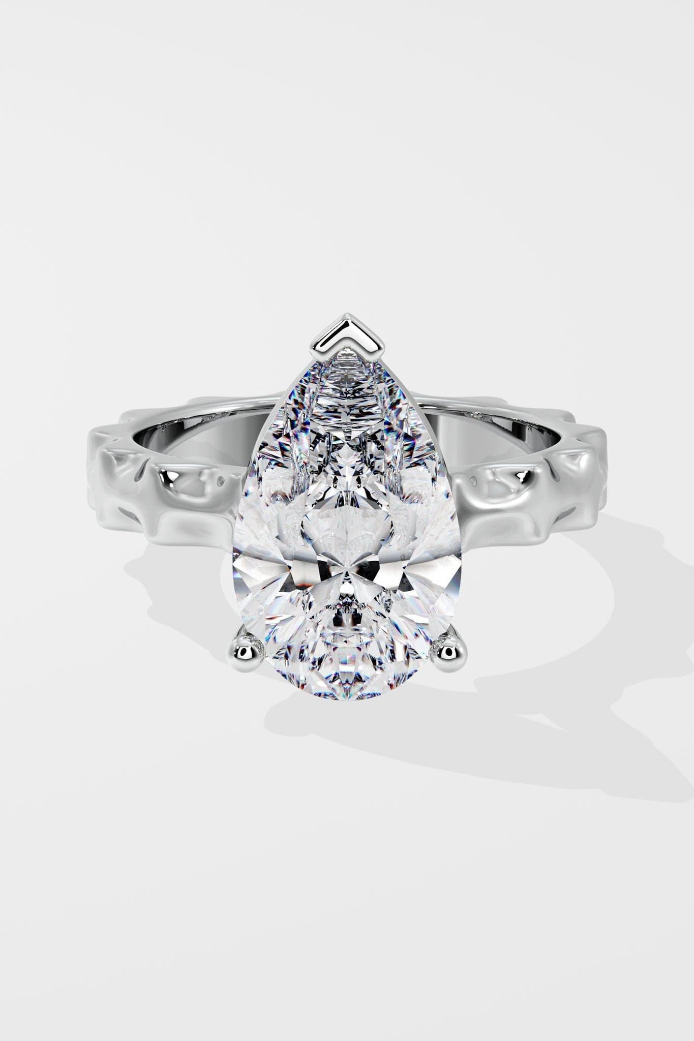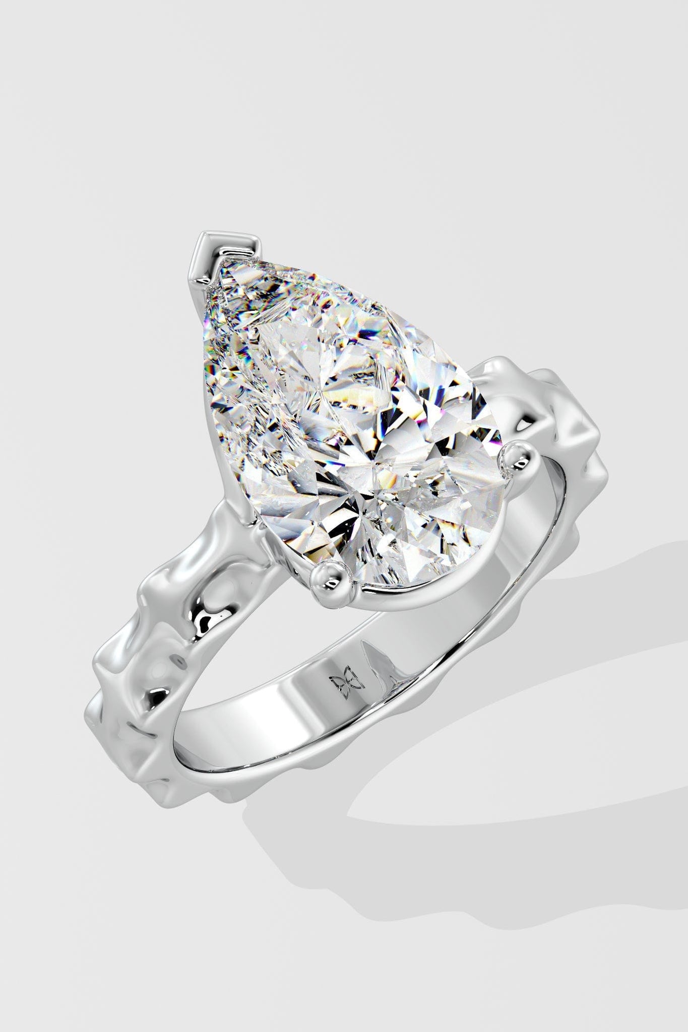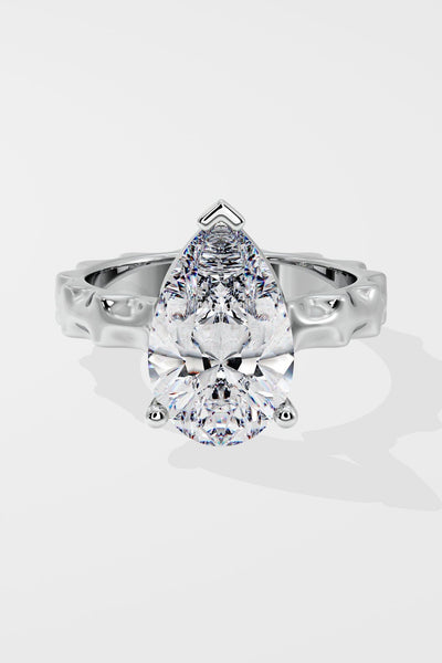 Featuring a stunning 3-carat pear-shaped diamond at its center, the Inegale ring is set on a distinctive hammered band that adds texture and individuality. The stand out shank combine with the dazzling pear makes this one of a kind.