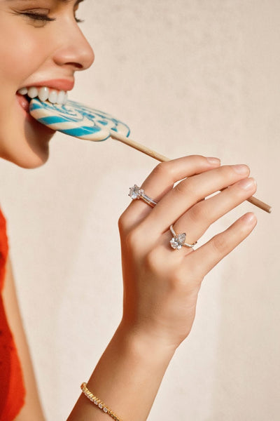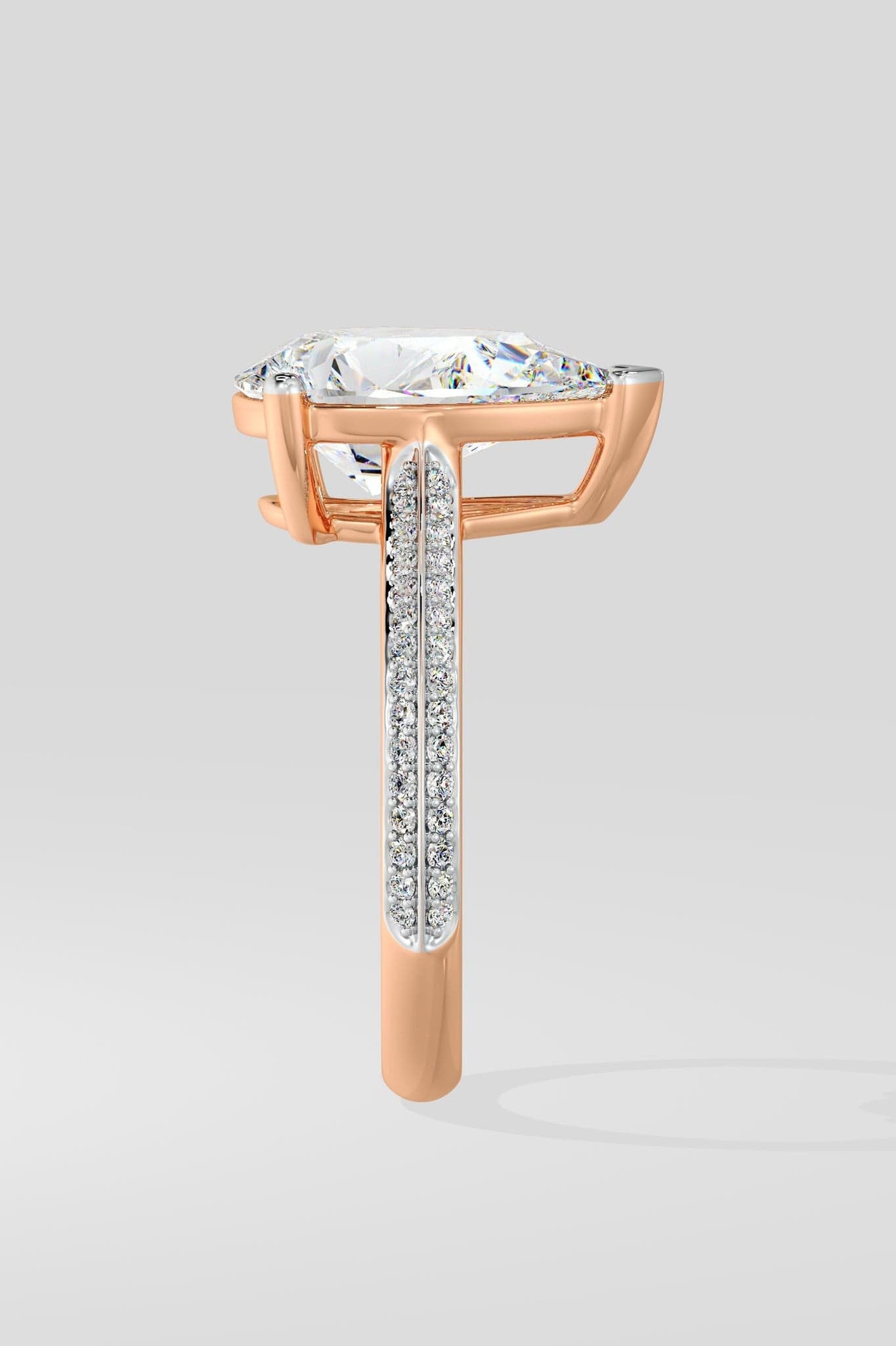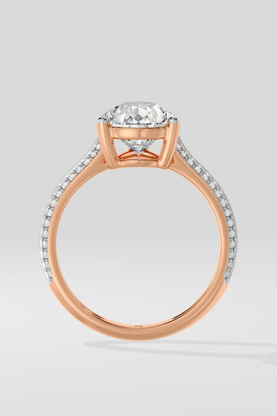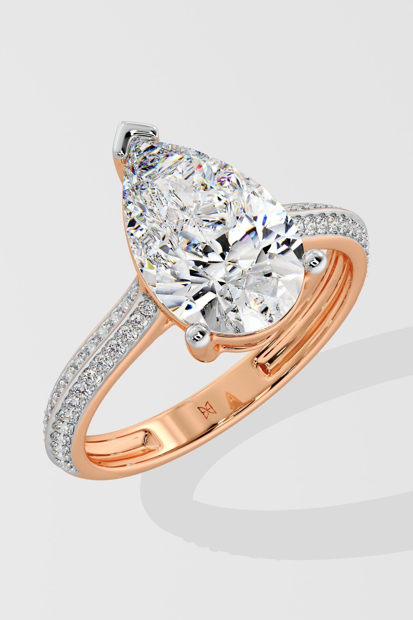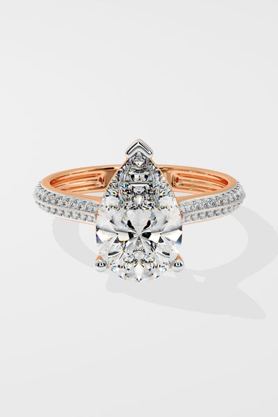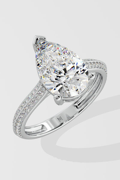 The Pear Ritz Ring features a 3 ct center Pear set beautifully with a 3 prong setting. The striking feature of this ring the double knife edge band studded with small round brilliants. A melange of sophistication and modern elegance, this is one of our personal favourites.