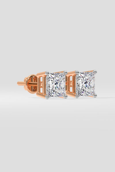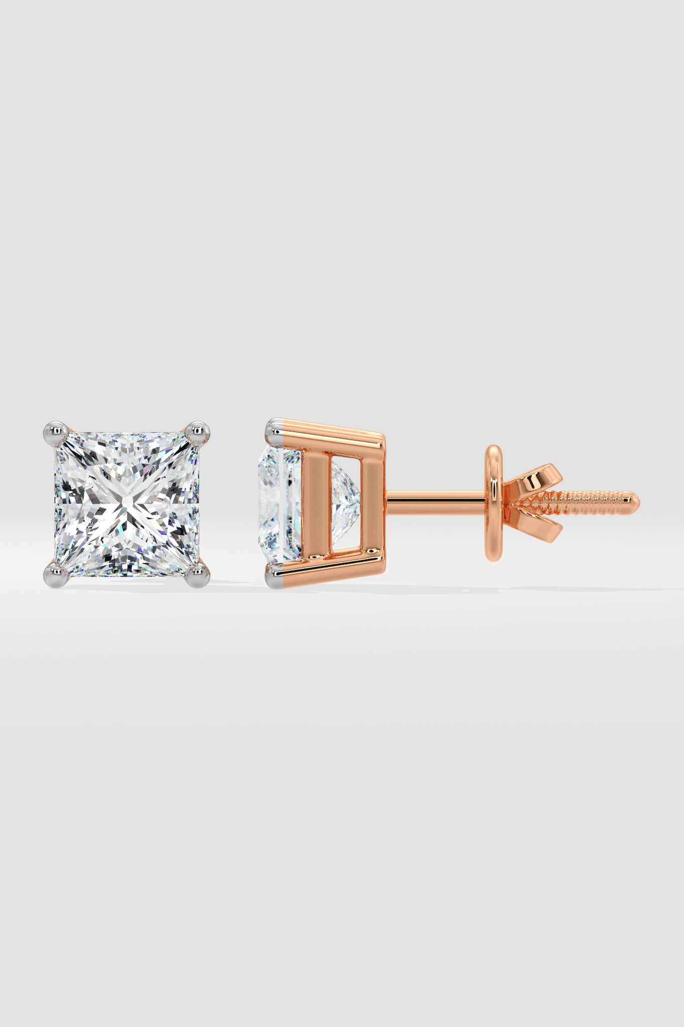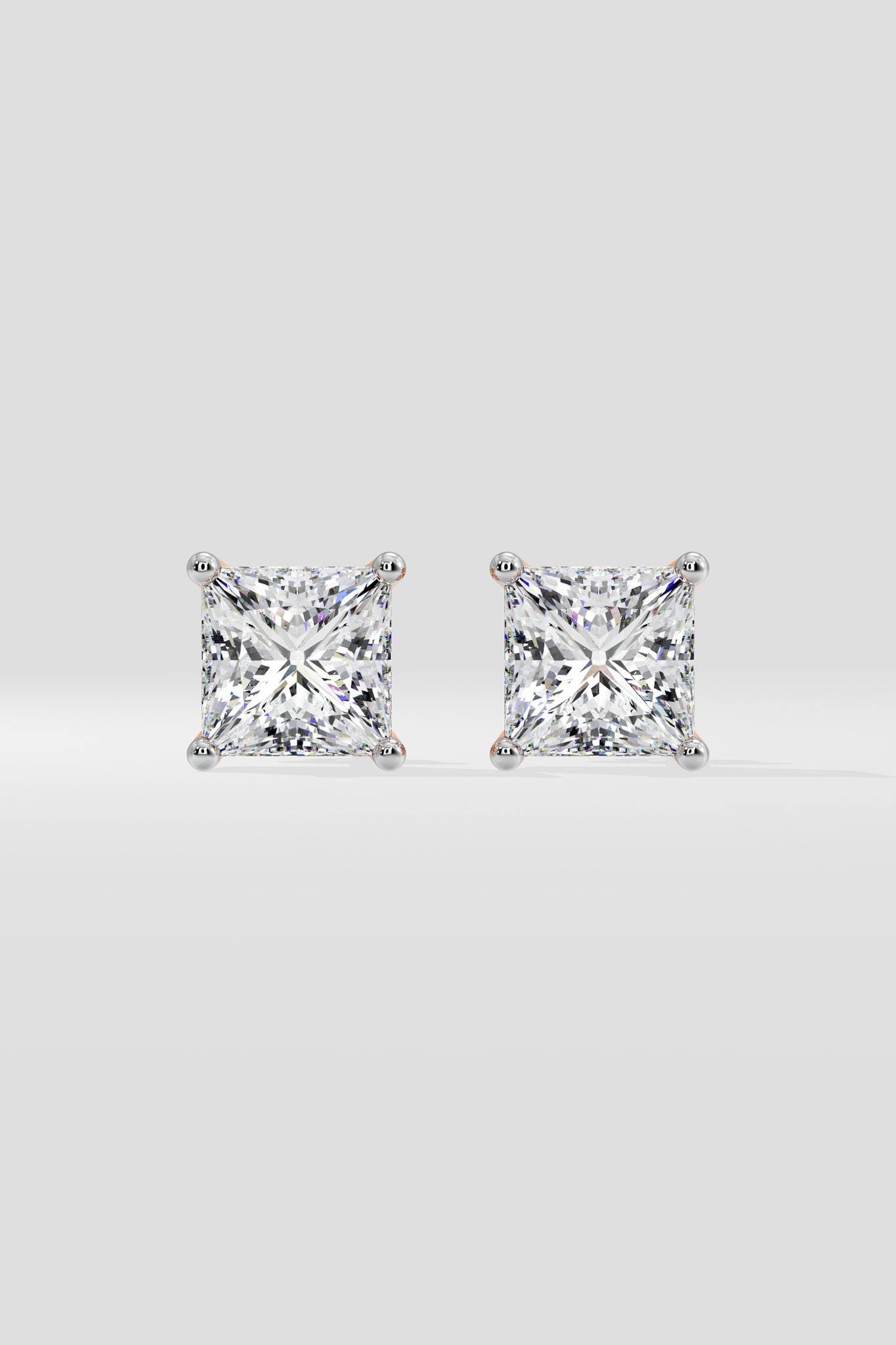 The classic Princess studs, set in 4 prongs are 1.5 ct each diamond. Princess has a bolder, edgier look and breaks away from the classic round to make a stronger yet classic statement. Princess continues to hold high sparkle and combines everyday work and play effortlessly. Customizable in rose or white gold options as well.