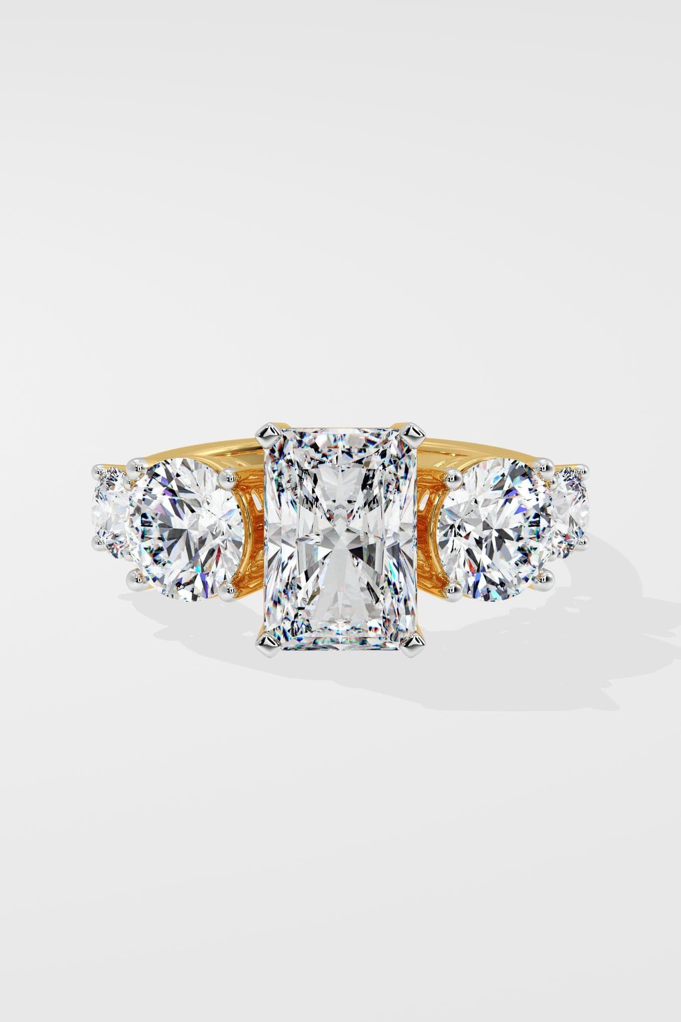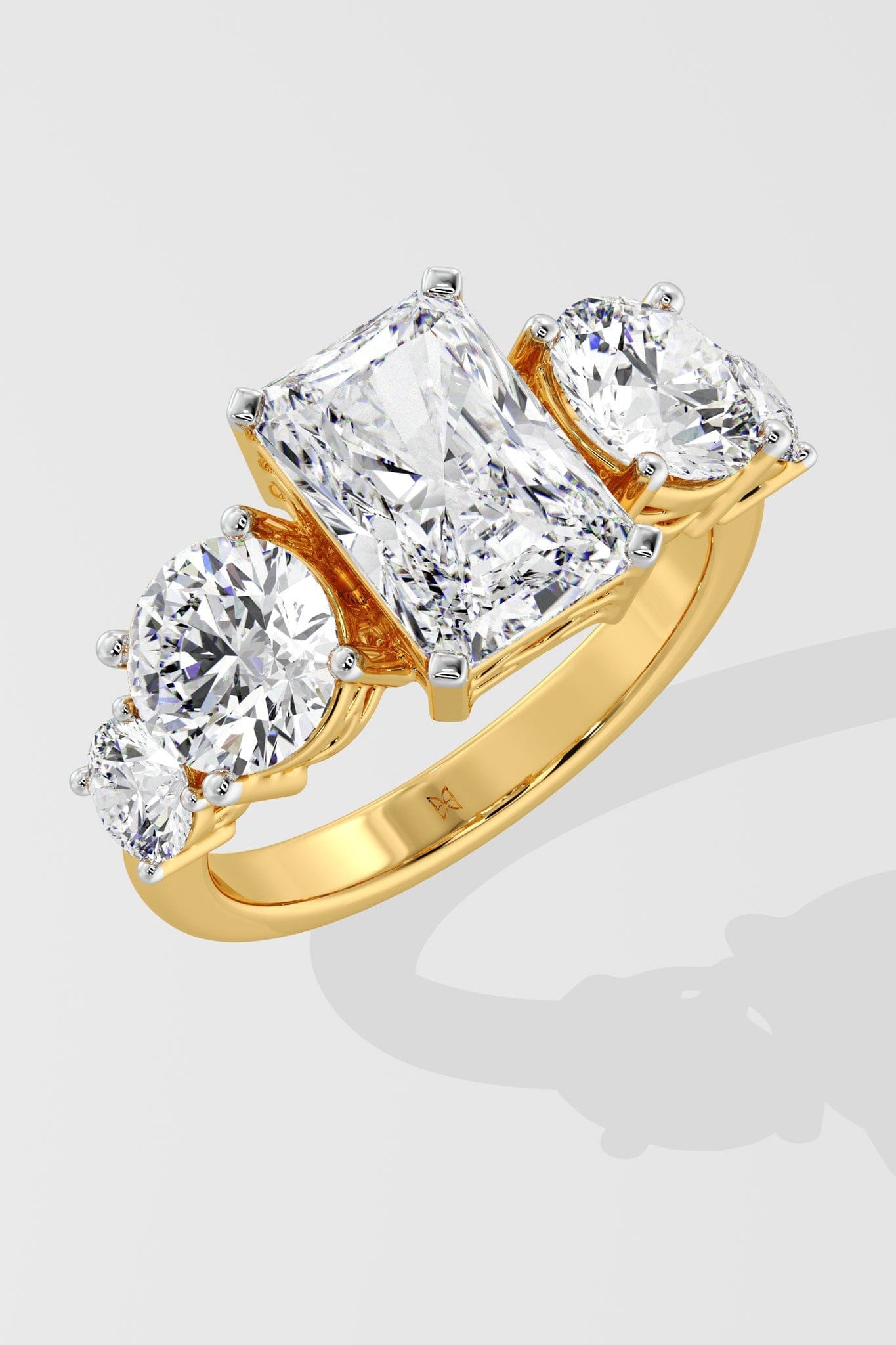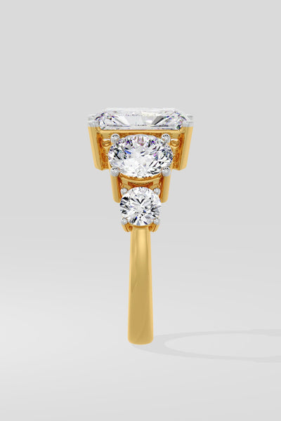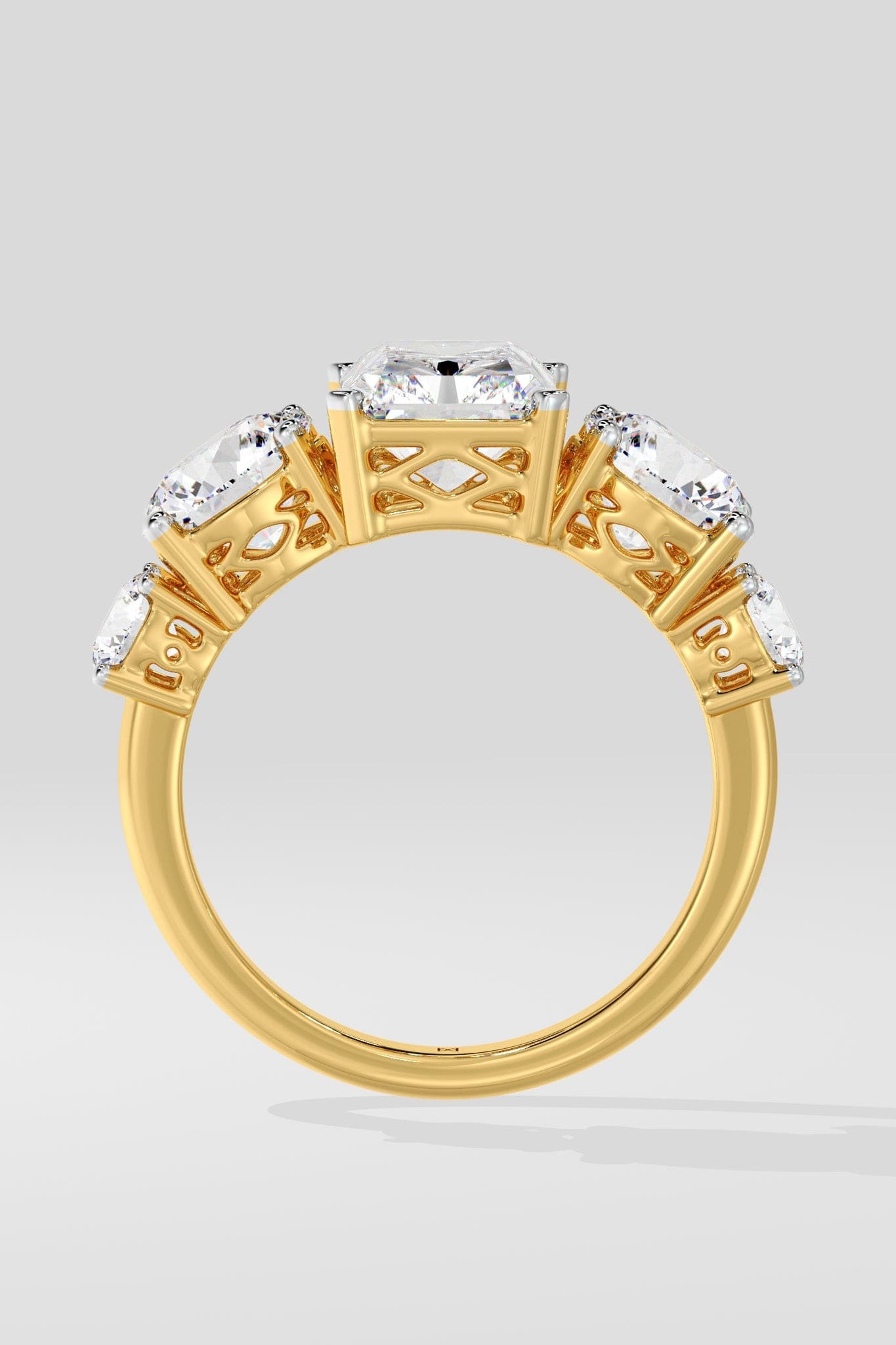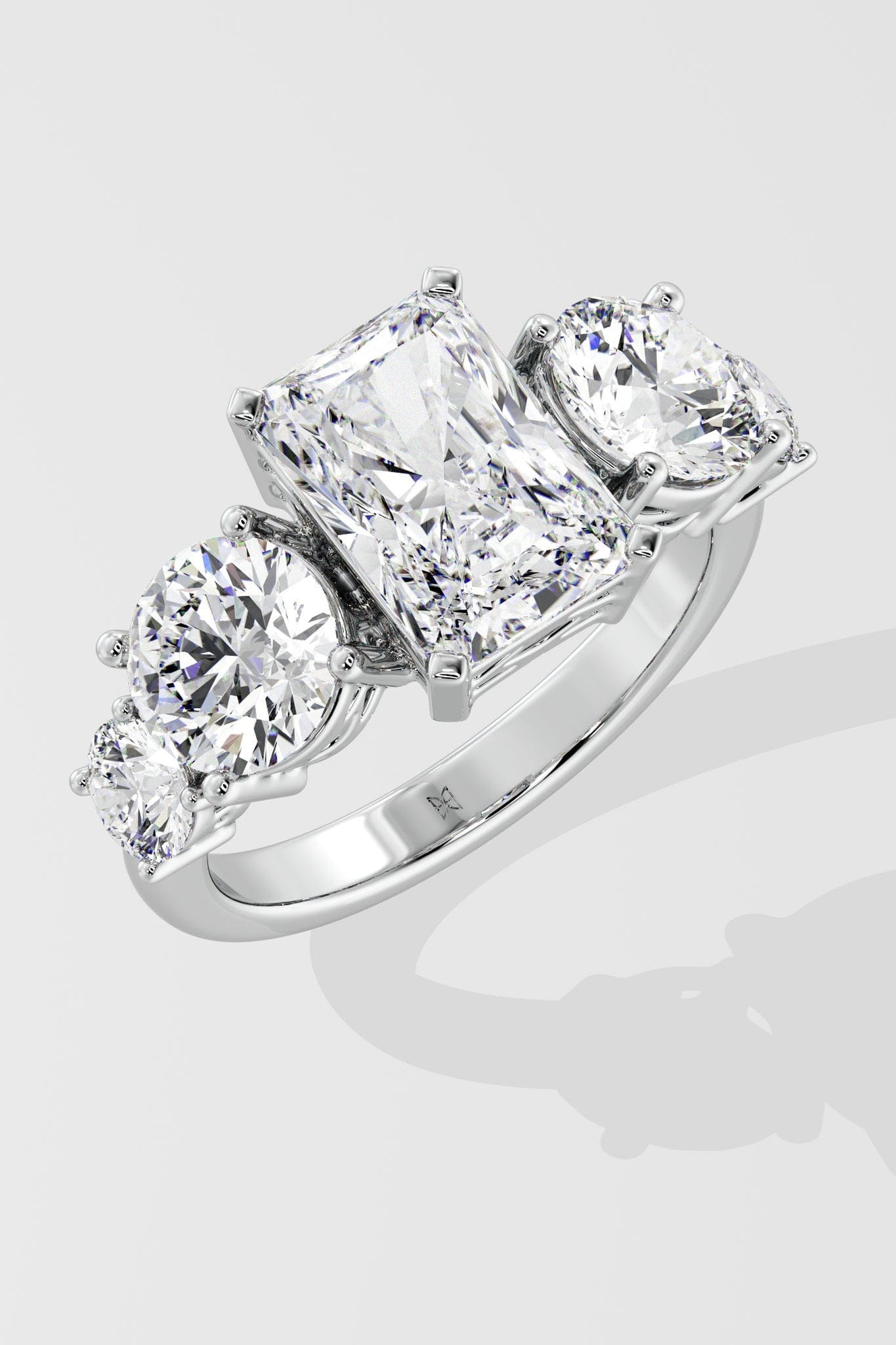 The Sloane Solitaire Lab Grown Diamond Ring is a stunning 5-stone arrangement. It features a sparkling radiant cut in a bold 3 ct center, 1 ct each round brilliants on the sides, and 0.25 ct each at the ends. This design balances brilliance, elegance, and timeless charm.