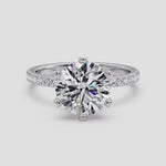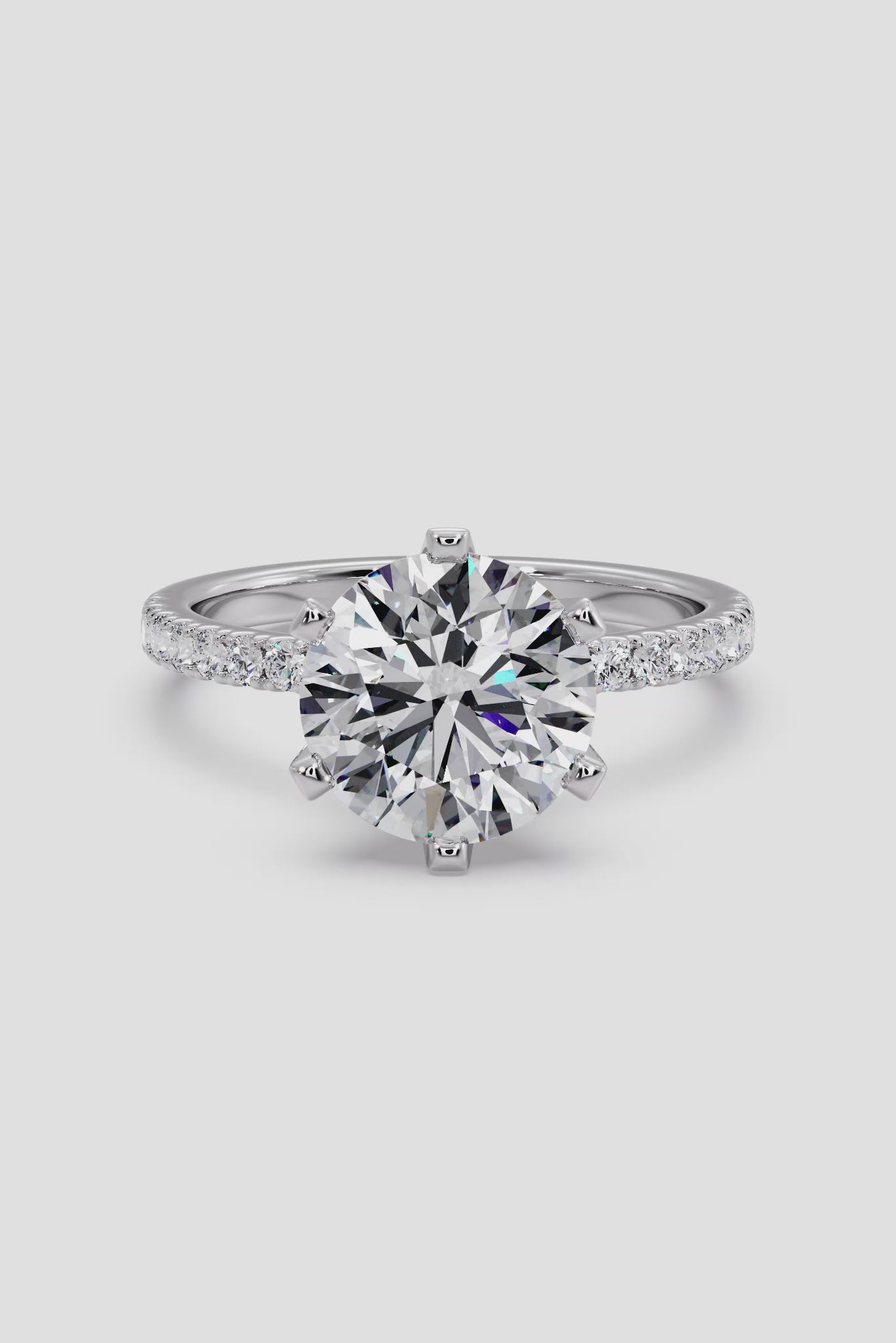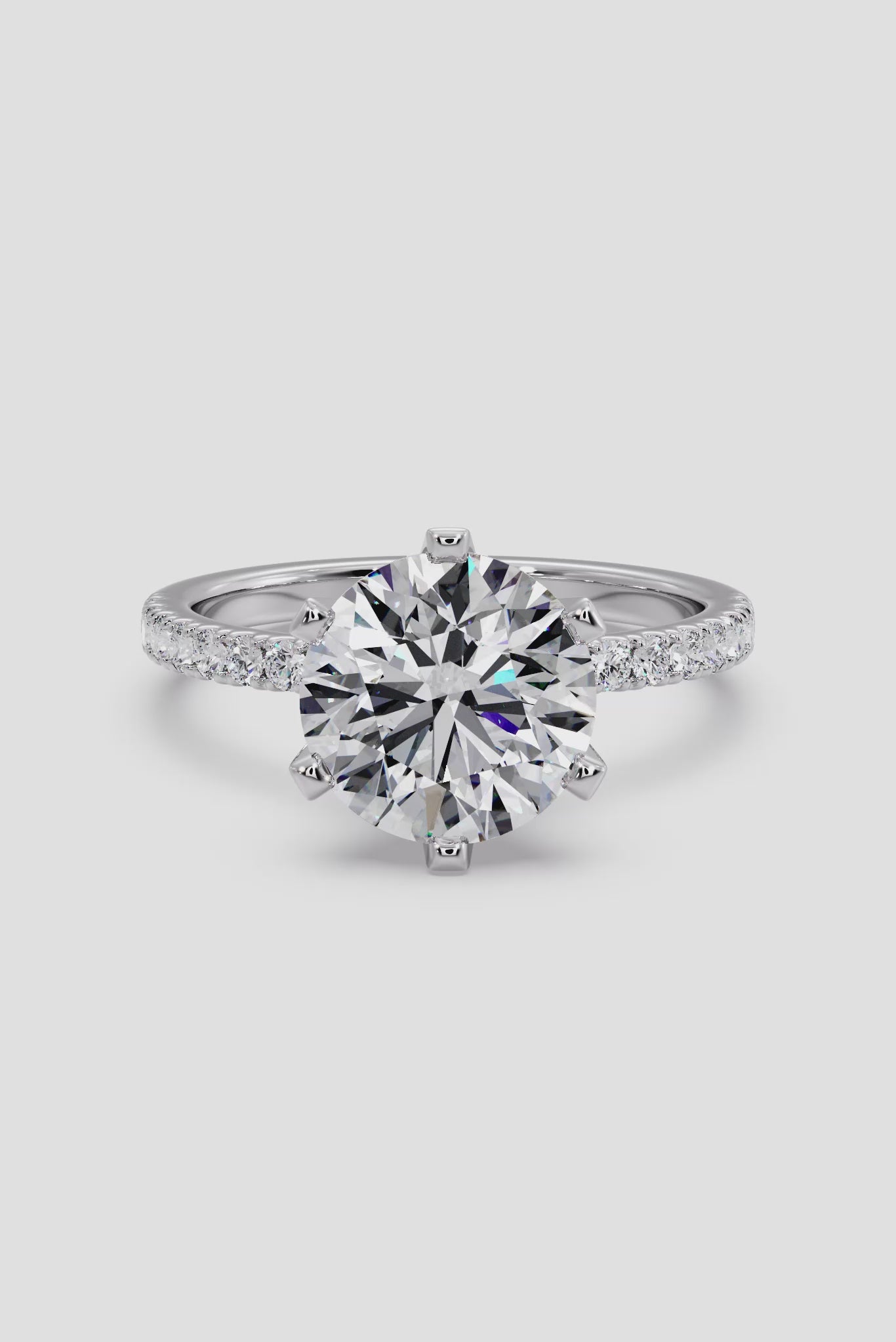 The 3 Ct Solitaire Crown Lab Grown Diamond Ring is a modern marvel. Part contemporary due to the elevated crown and part classic because of the beautiful 6 prong. The studded shank completed the all diamond look. A timeless engagement ring or a memorable anniversary ring, will look stunning in white gold.
