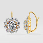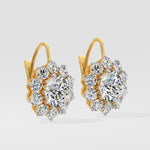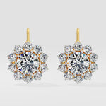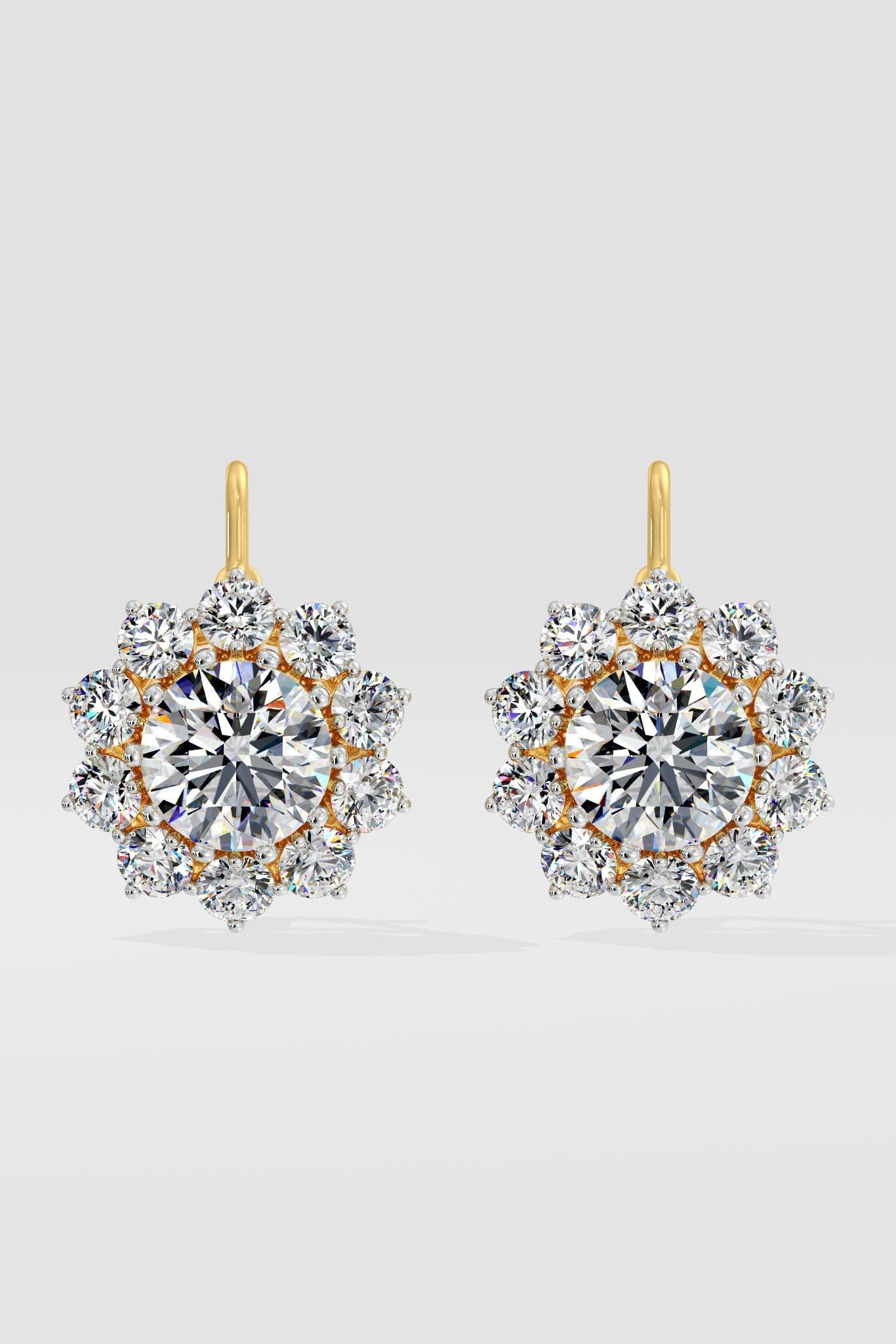 The 4 ct Fleur Earrings feature shining 2 ct centers, encircled by 10 pointer round brilliants. Bold, classic and dazzling, this piece is an heirloom. The leverback enables for a classic minimal dangle, a refreshing twist from the normal studs.