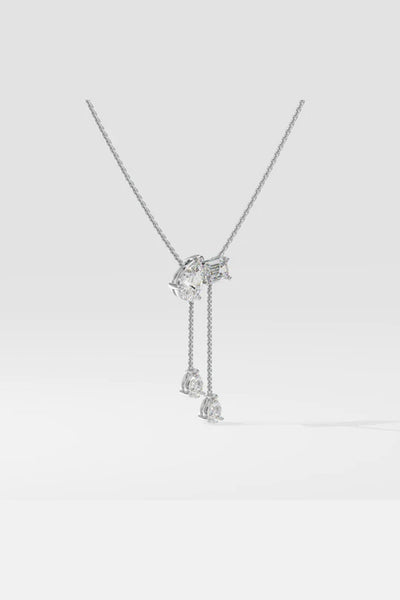 The 2 Stone Solitaire Necklace features 1 ct Solitaires each, in Emerald and Pear. An enhancement of the classic solitaire pendant, these 2 stone diamonds drops sit well on the collarbone.