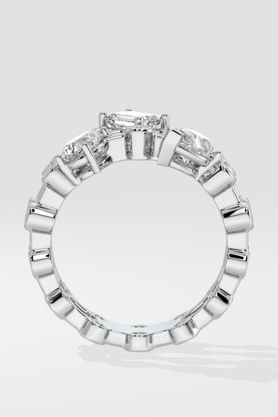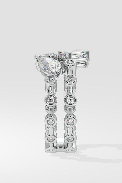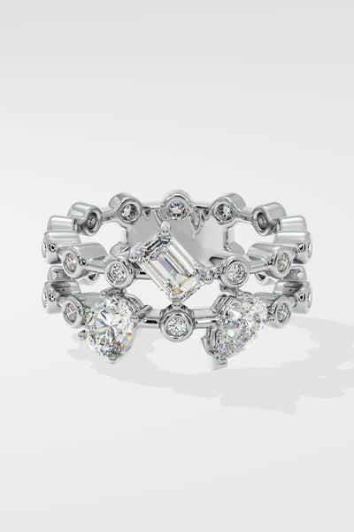 The 3 Stone Double Ring features 1/3 ct Emerald, Oval & Pear solitaires. Get the best of all shapes studded over two rows of flush set diamonds with this style. Add flair to your cocktail rings collection.