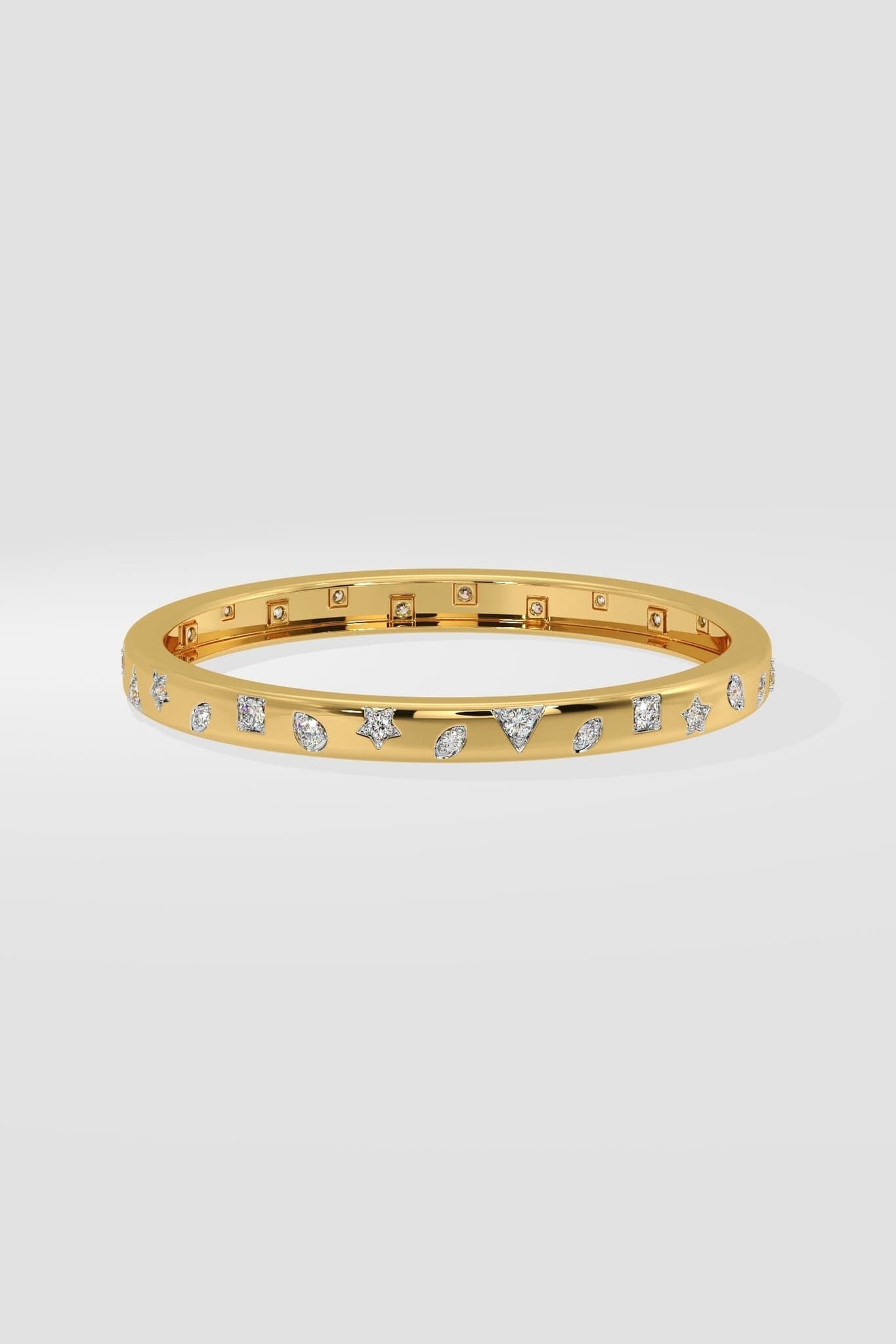 Presenting our Askew Sparkle Bangle, where bling meets playfullness. Adorned with 0.10 ct diamonds in multi-shapes, each set delicately within the bold gold bangle. A solid gold style with playful diamond accents, this one contemporary bangle can do it all.