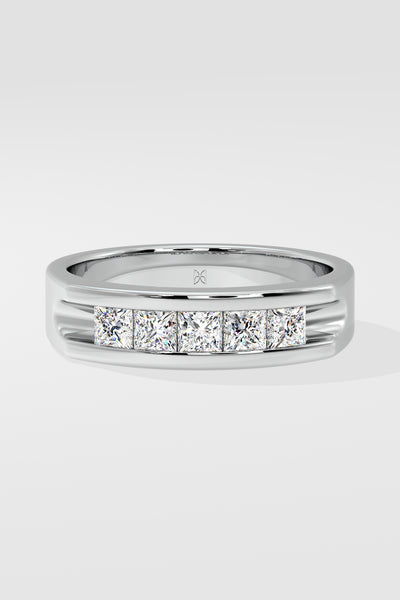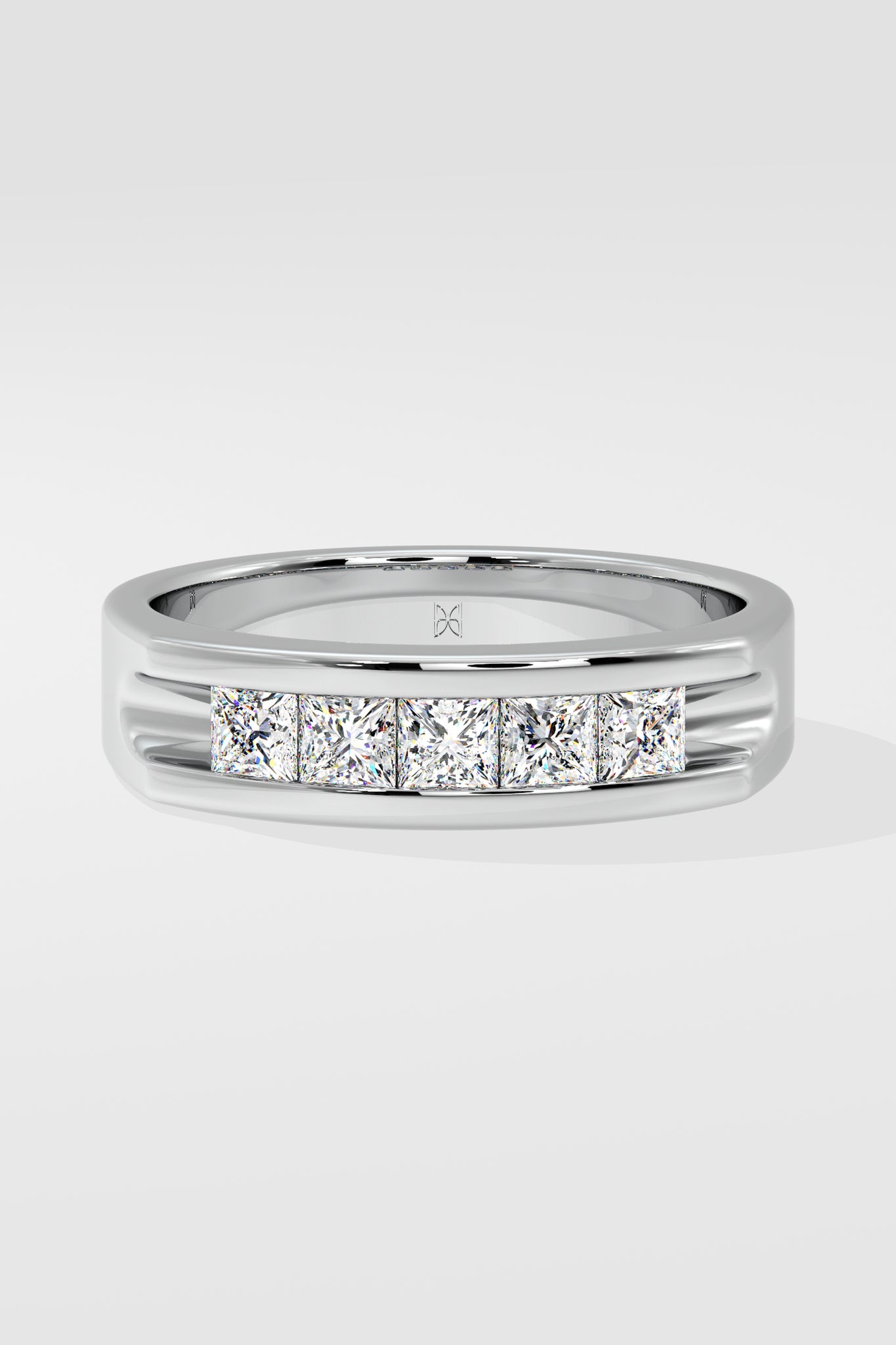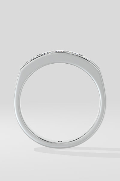 The Celtic band features 0.20-carat princess-cut diamonds in a sleek channel setting. Crafted in polished white gold, its bold yet refined design symbolizes strength and elegance. It is a perfect modern classic.