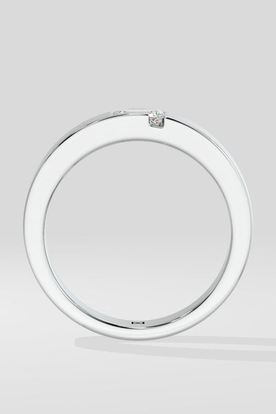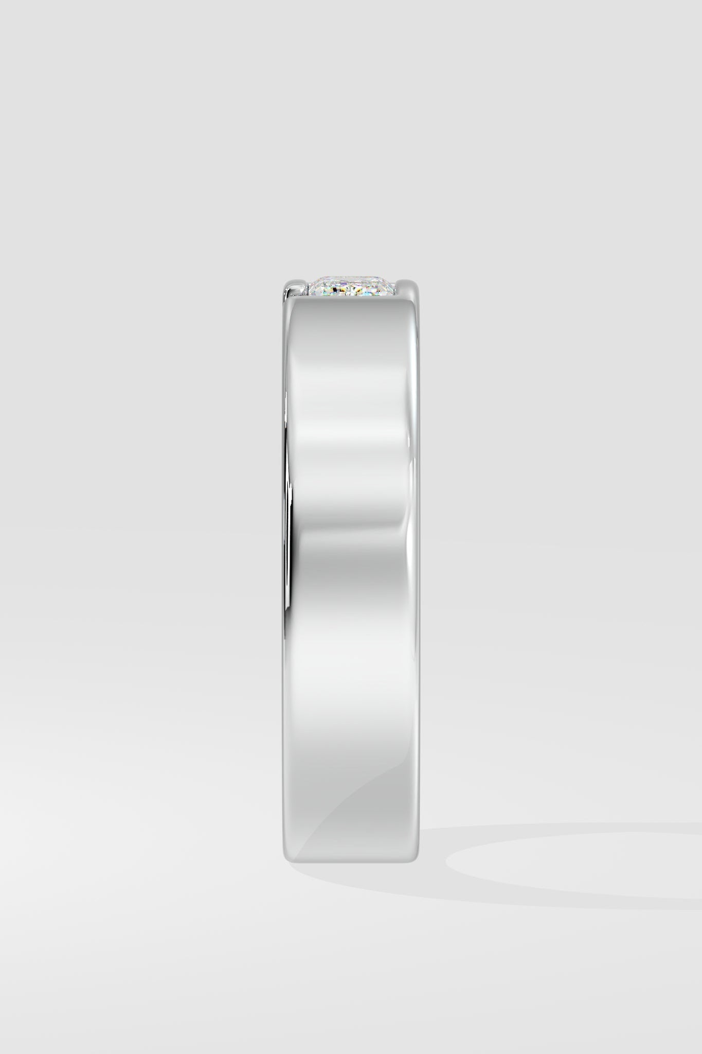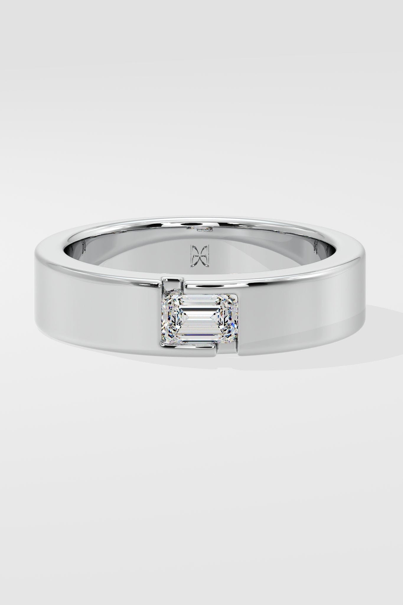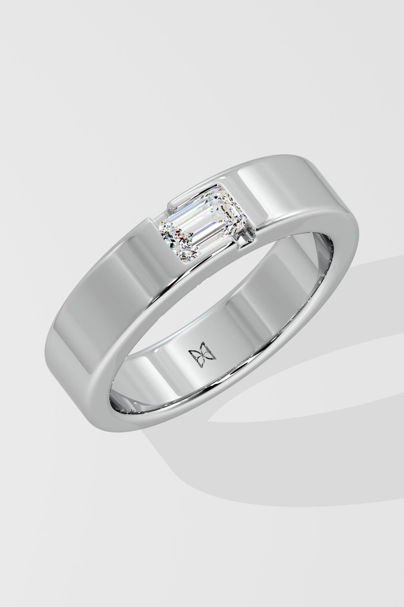 The East-West Emra Band features a 1 ct Emerald is bezel set. A classic Men's band with a slight twist in the form of corner gap. Perfect for everyday wear.