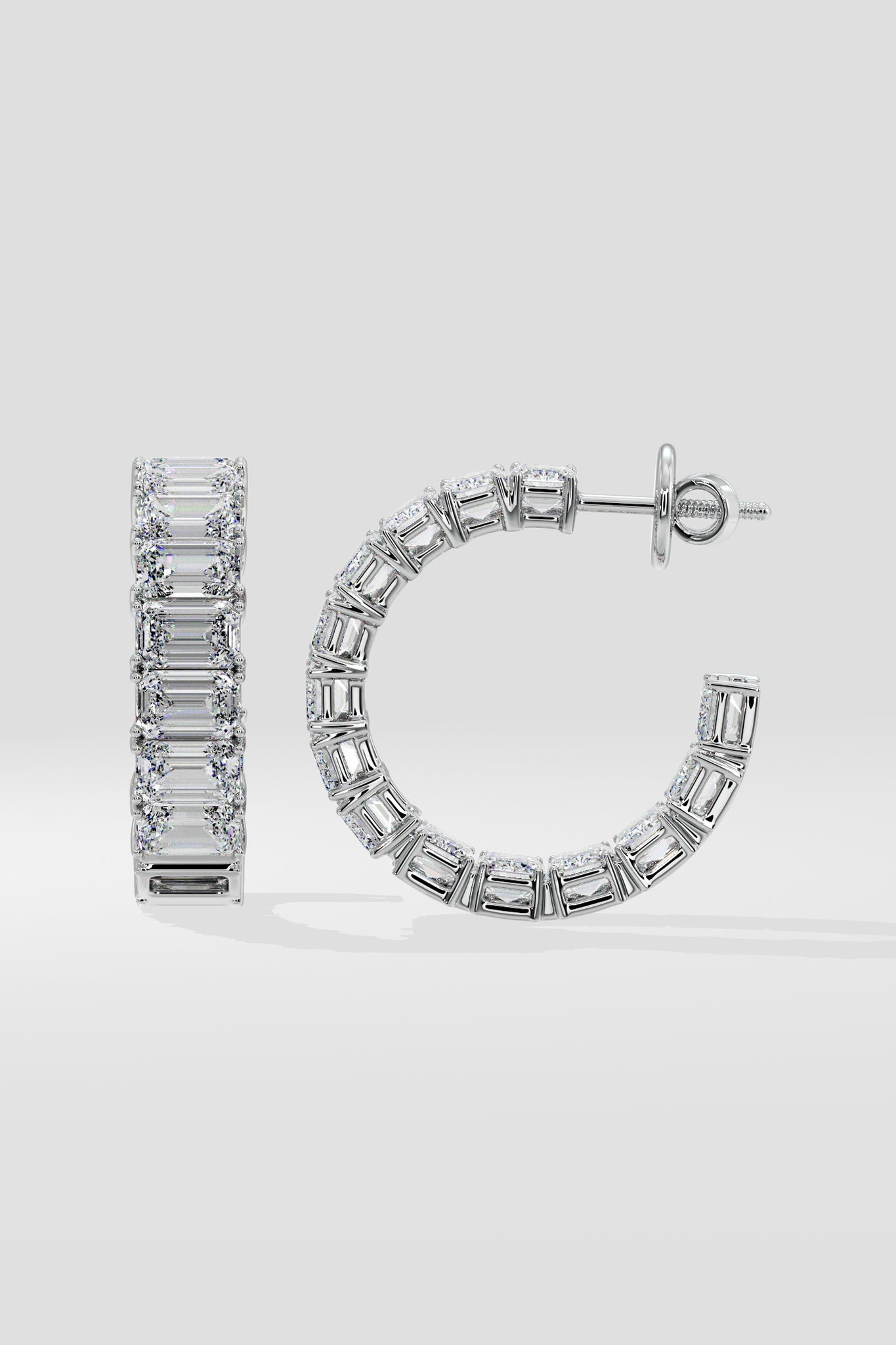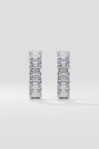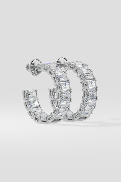 Elegant and timeless, these Emra Hoops feature 30 pointer emerald-cut diamonds, they are set in a gleaming 18k gold frame. Each earring showcases an array of emerald diamonds set on the outside and inside of the earring giving an all diamond look. Perfect for both day and night, these hoops are classic.