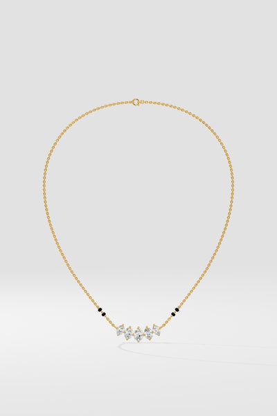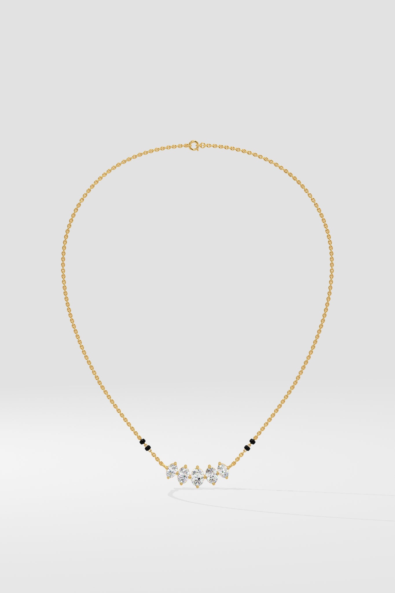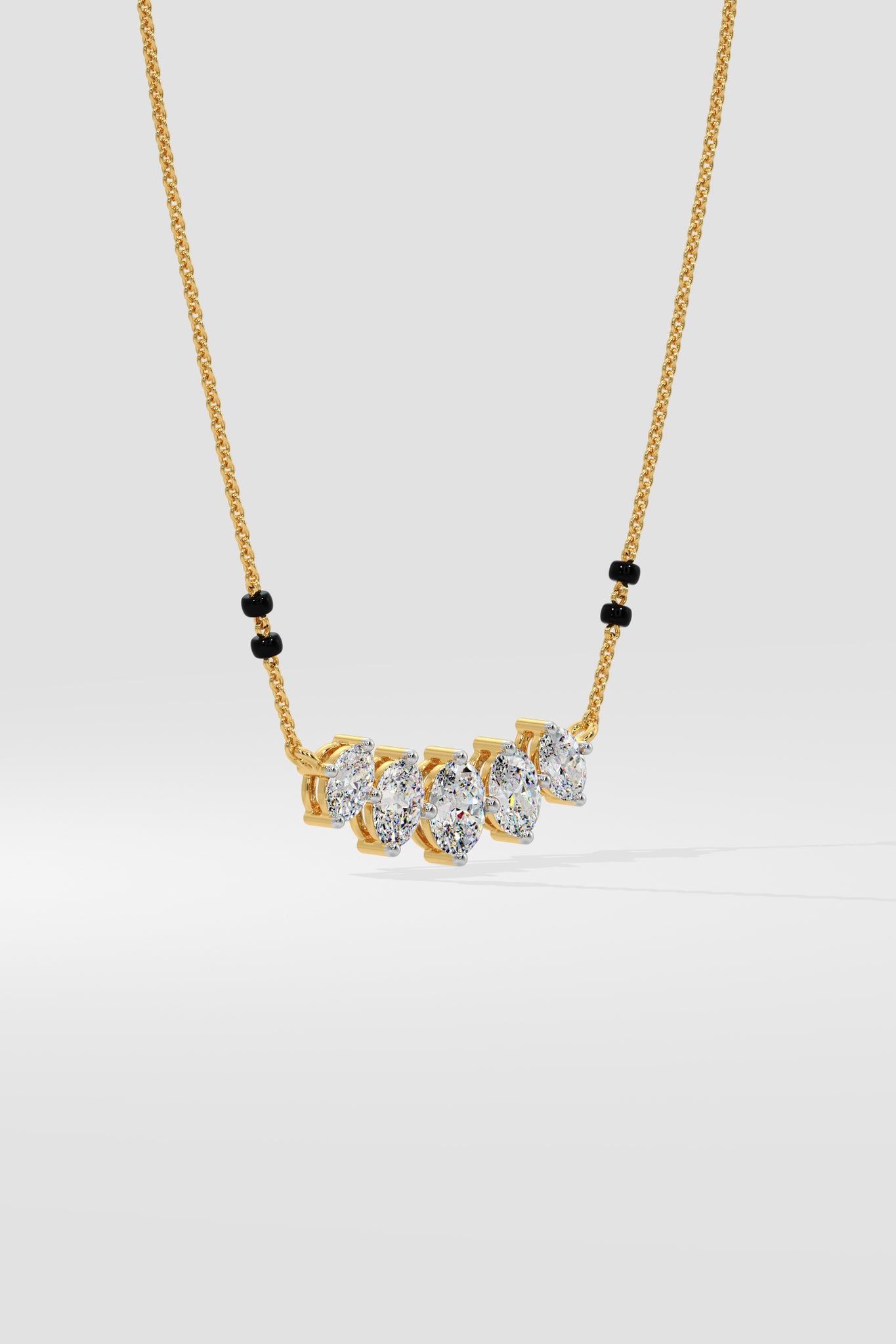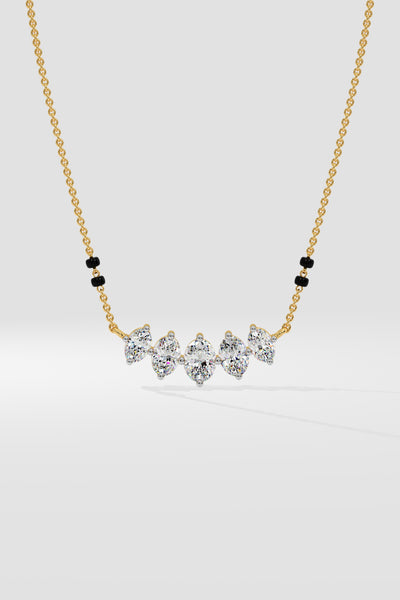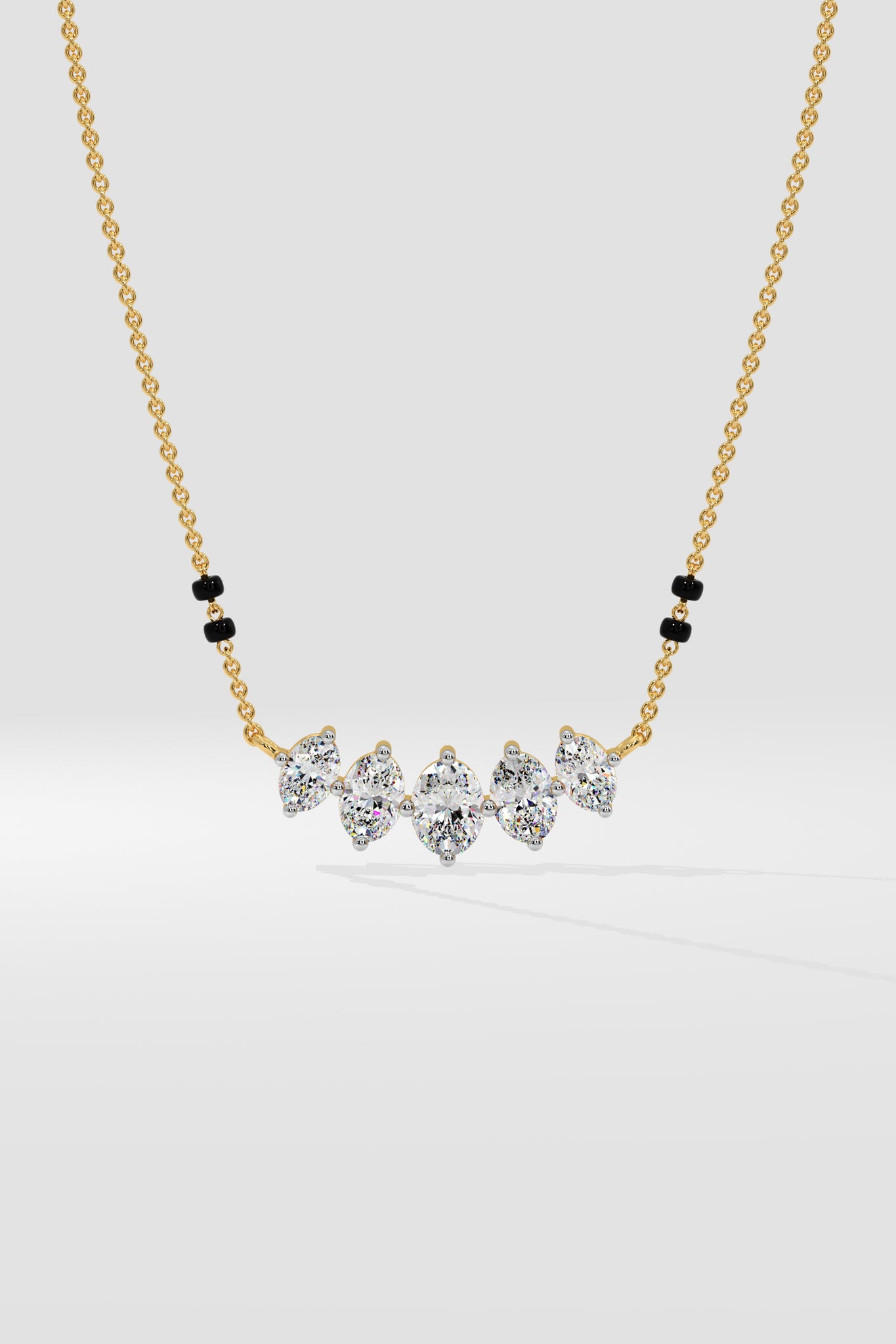 The Graduating Oval Mangalsutra features a 0.50 ct oval diamond at the center, with two smaller Oval -shaped diamonds on the sides, creating a graduating effect.