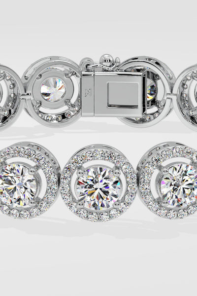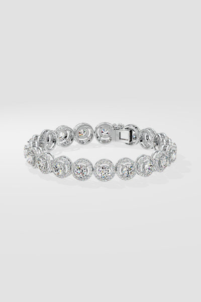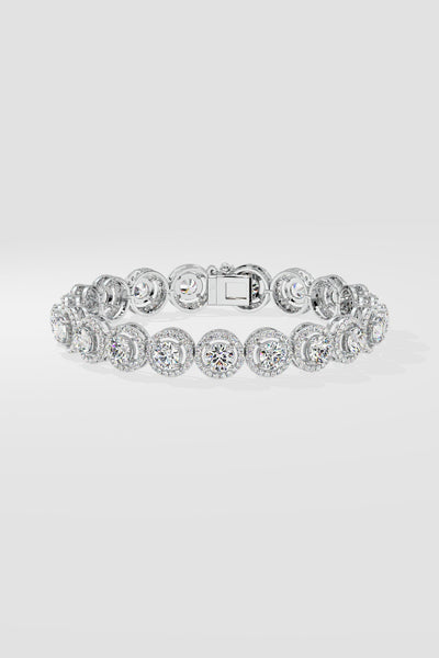 The Marina Bracelet is a stunning 16 ct Diamond Bracelet with 0.90 ct each diamond center with a halo. Shine, radiate, and illuminate the room with this magnificent stunner on your wrist.