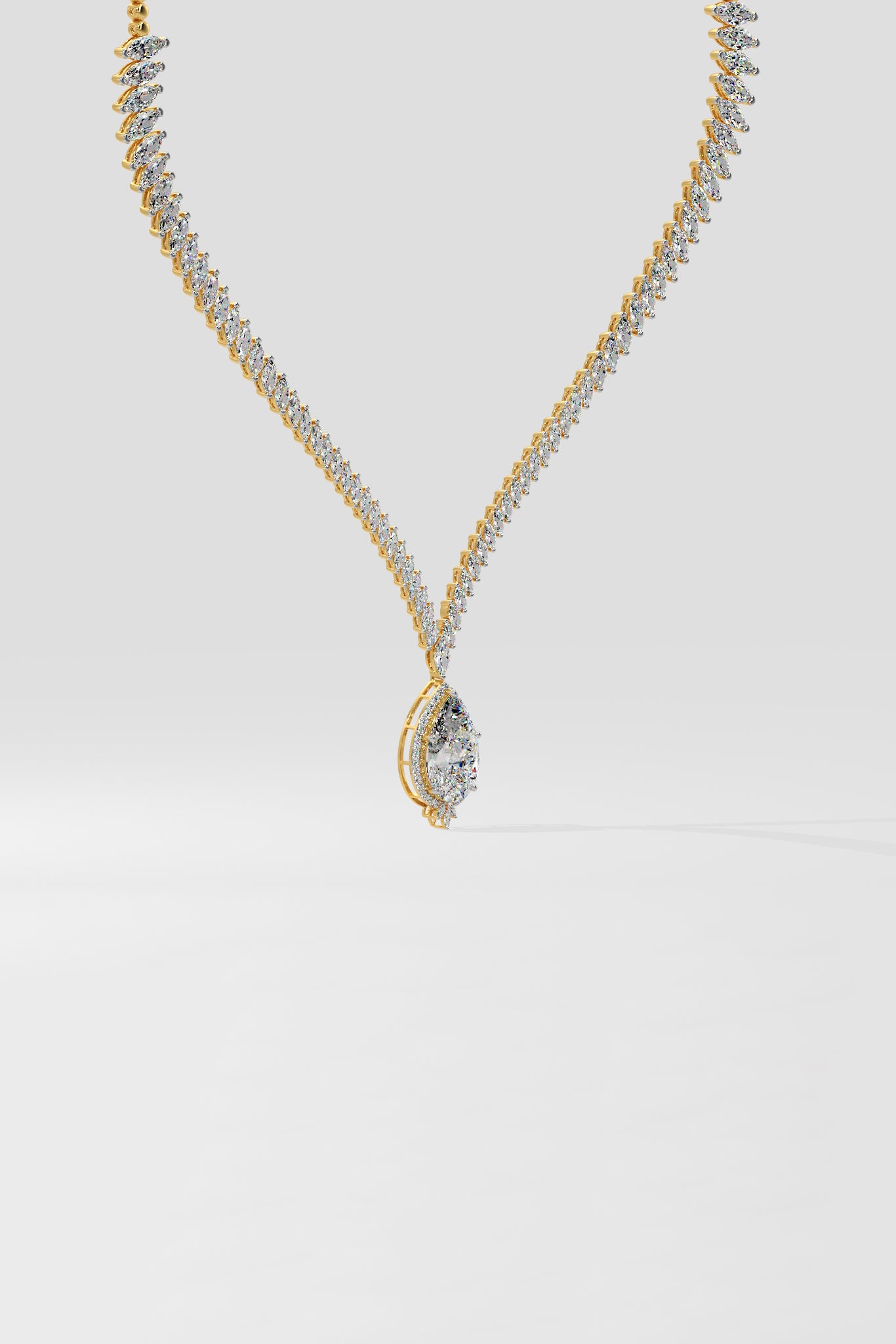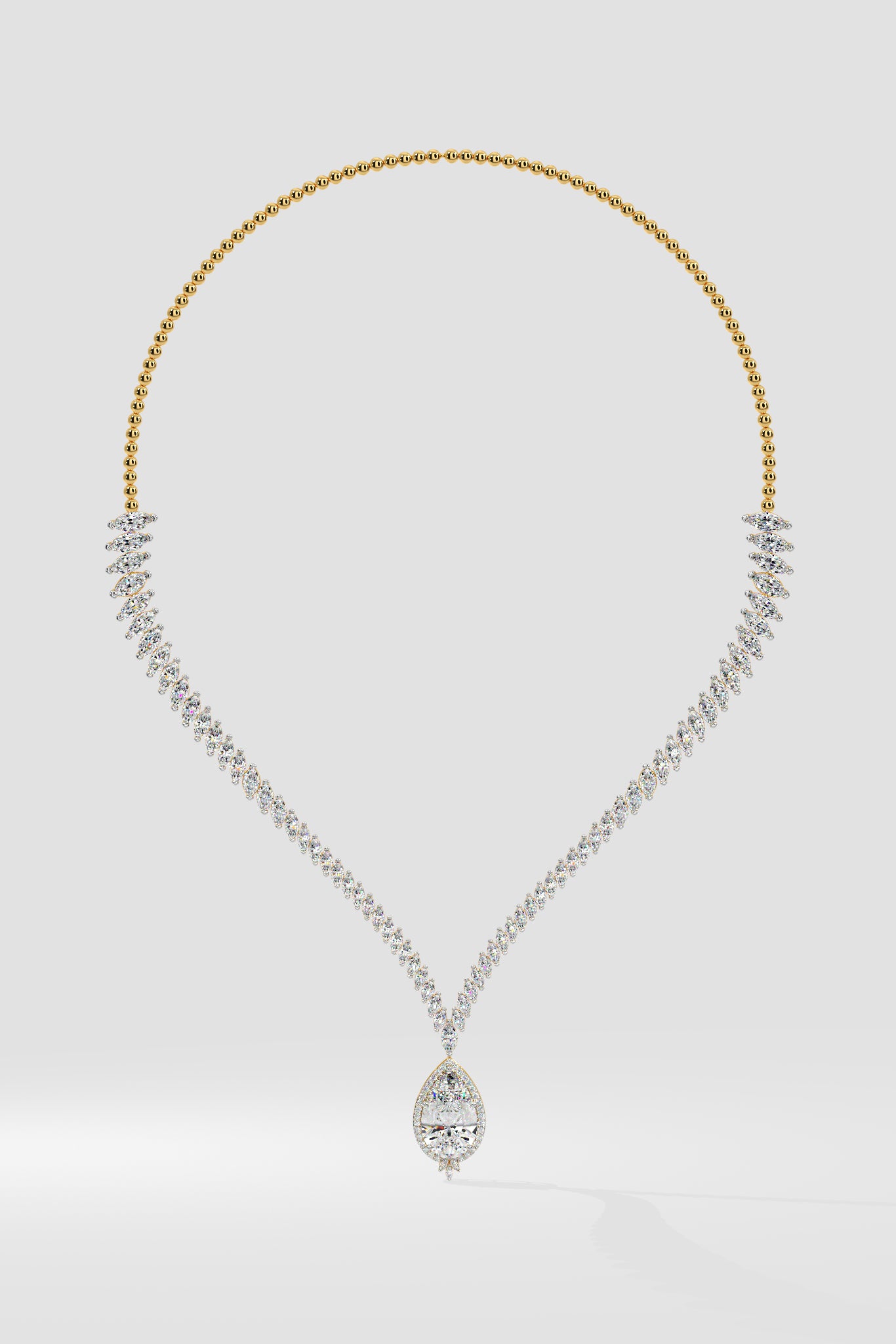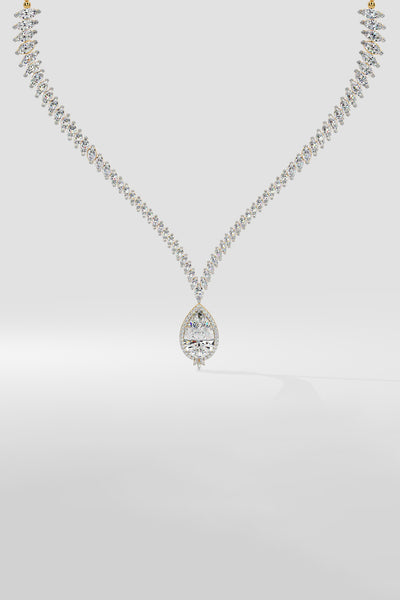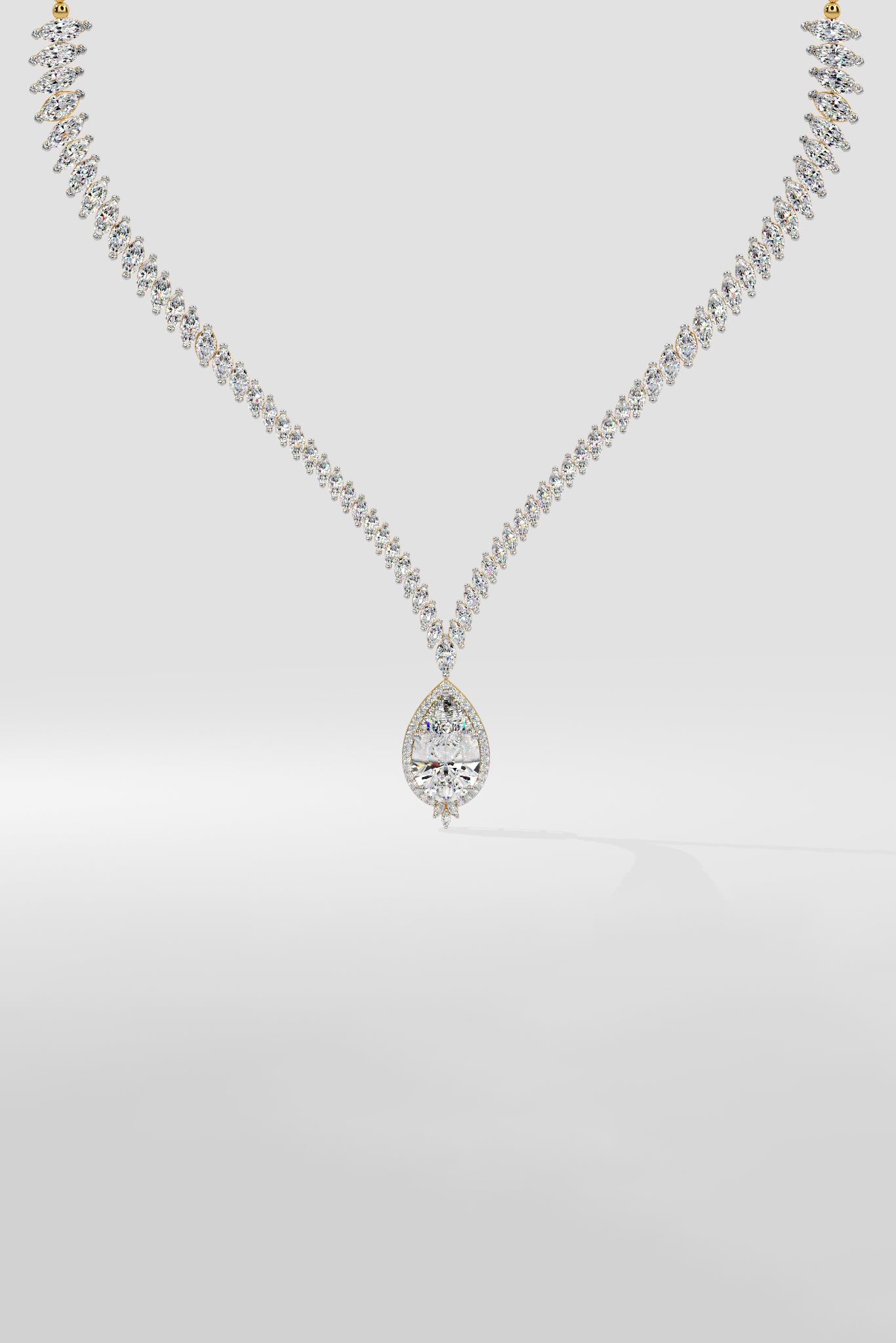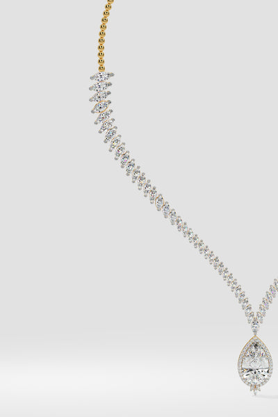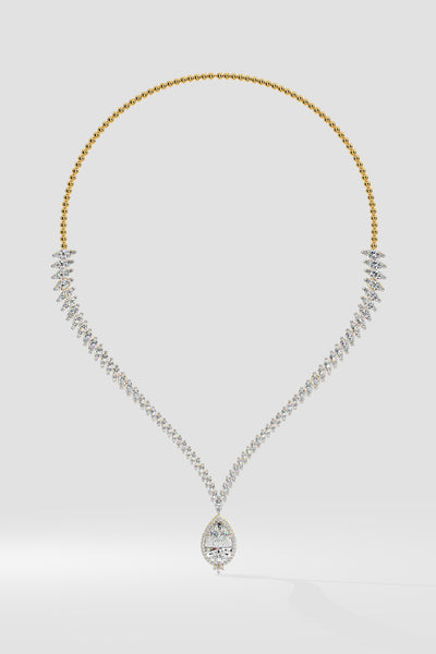 The Marquesa Necklace is a breathtaking statement piece. The unique feature of this masterpiece is the reverse graduation of the marquise diamonds, only outshined by the stunning 10 ct pear-shaped center halo drop.