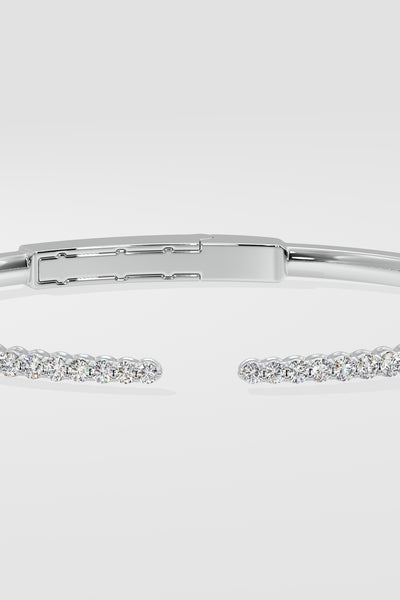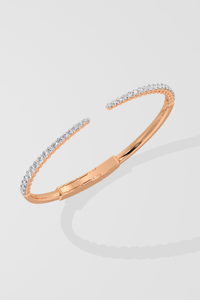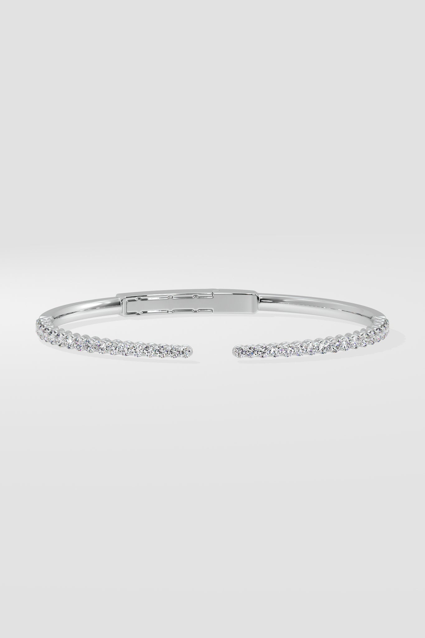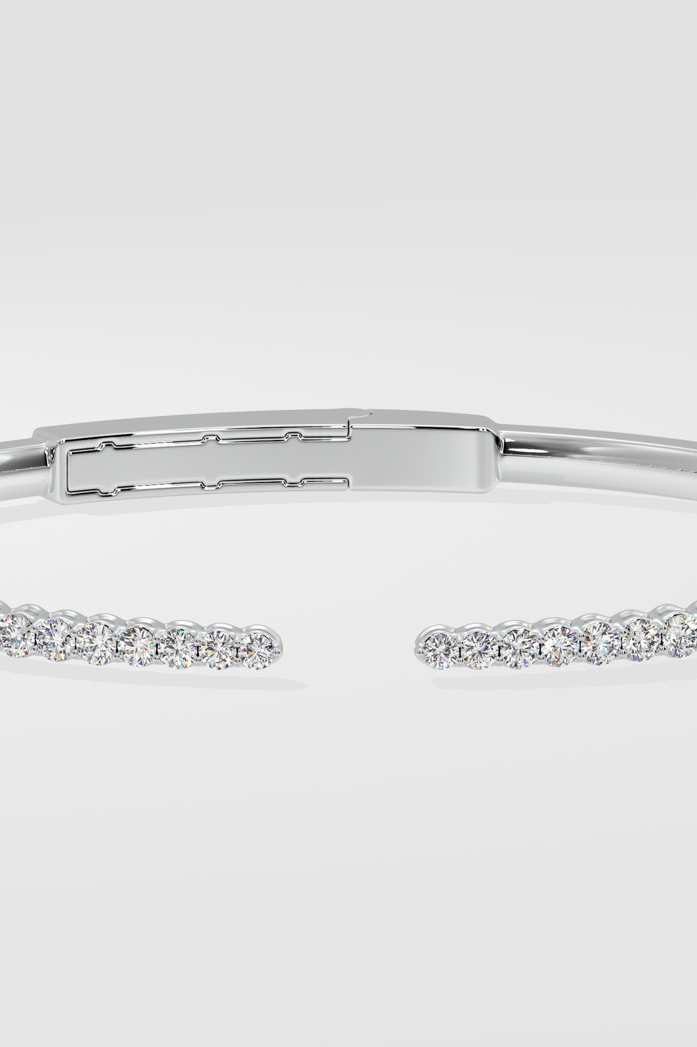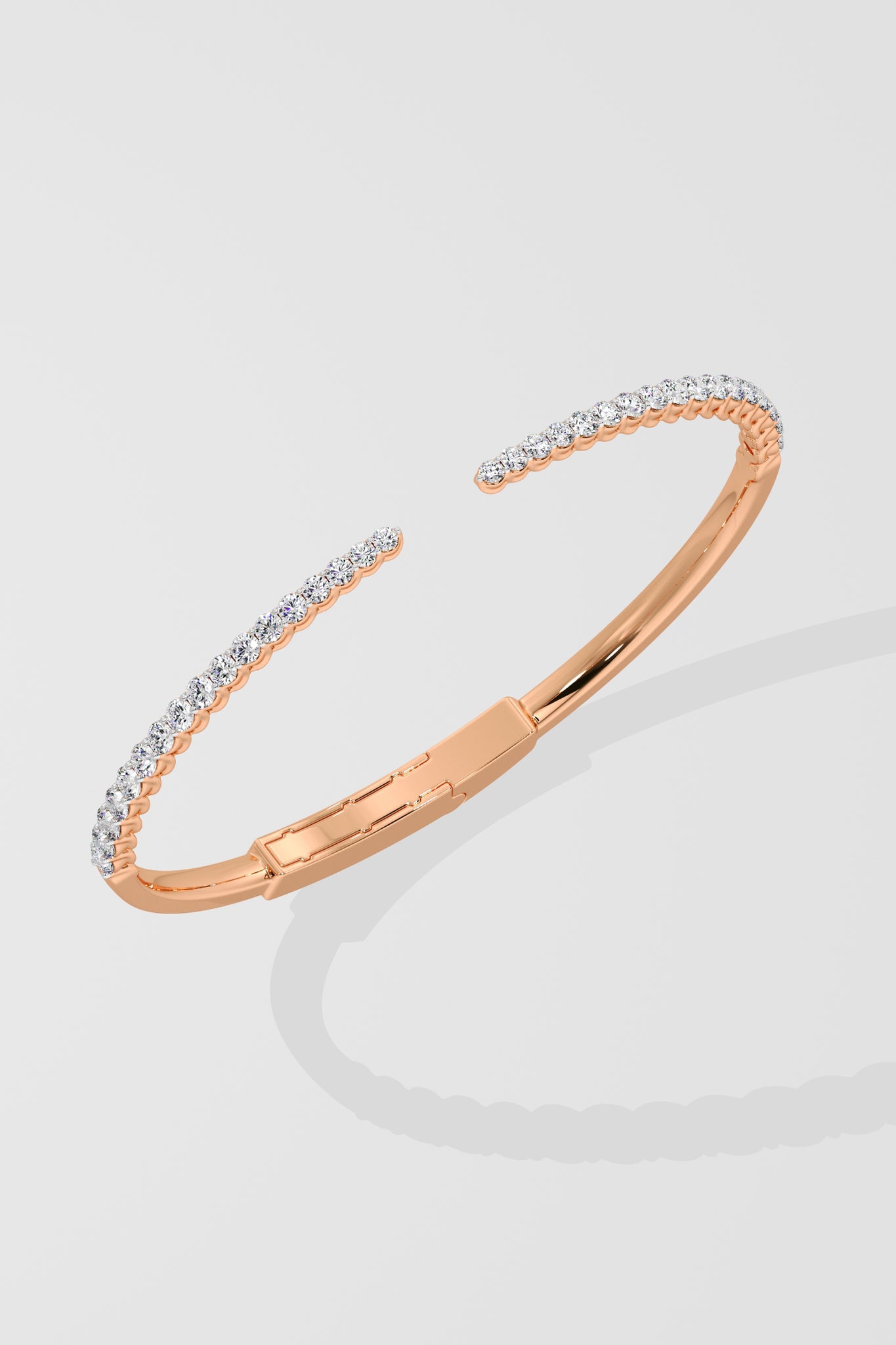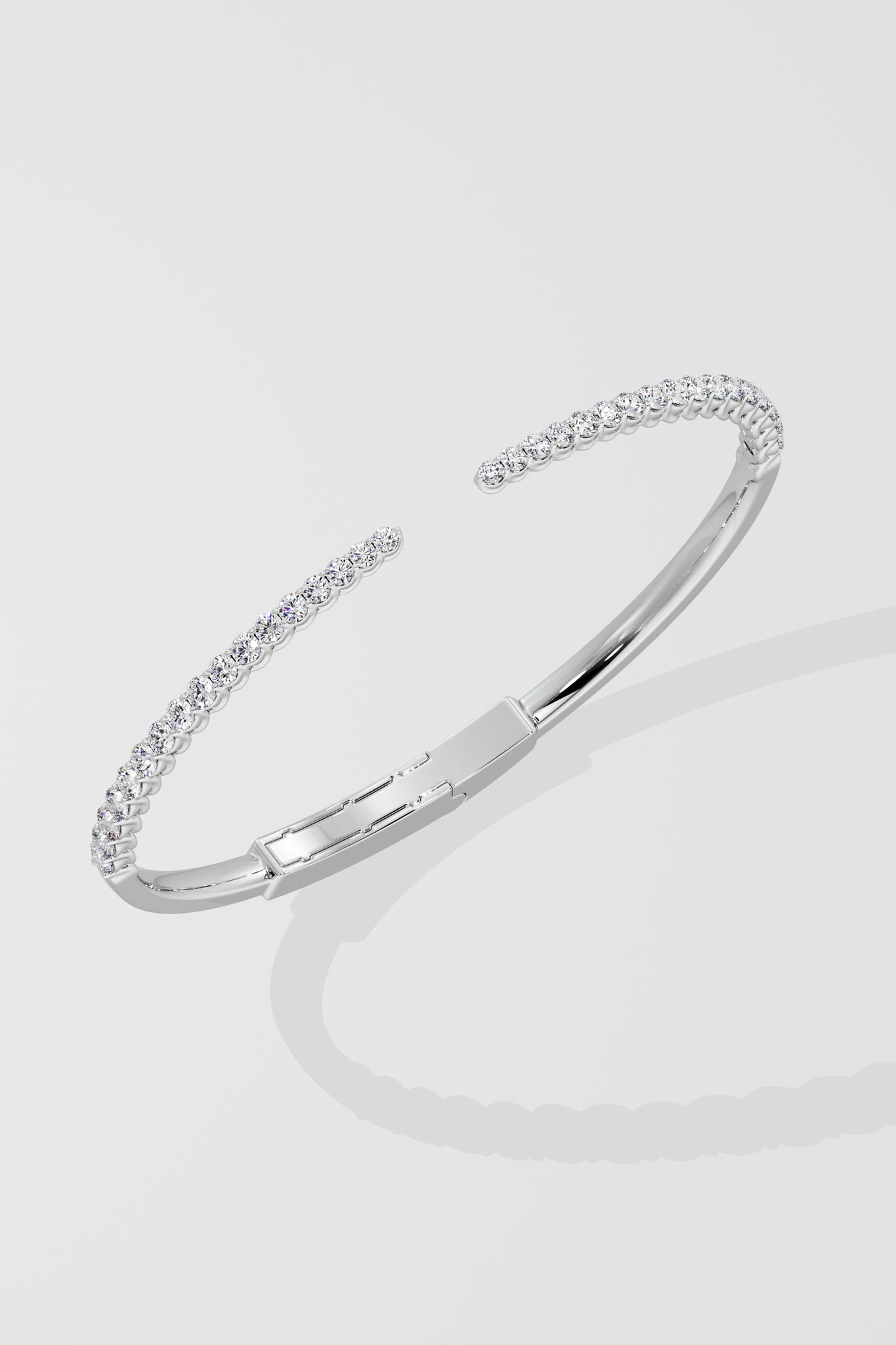 An oval bangle set with round diamonds, narrowing at the ends into a clean open gap. Reverse taper. Opens split from the bottom. Perfect addition to your wrist stack.