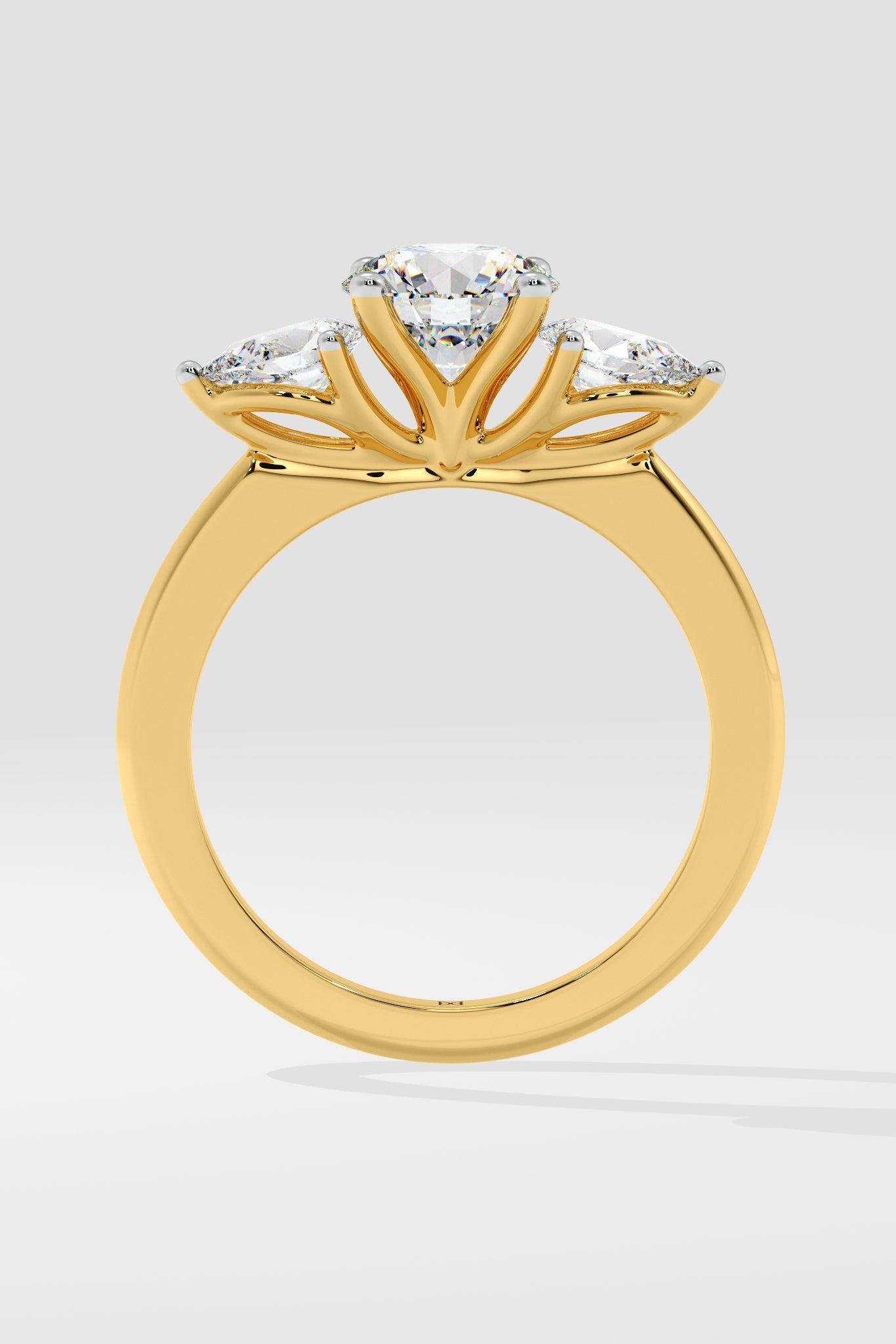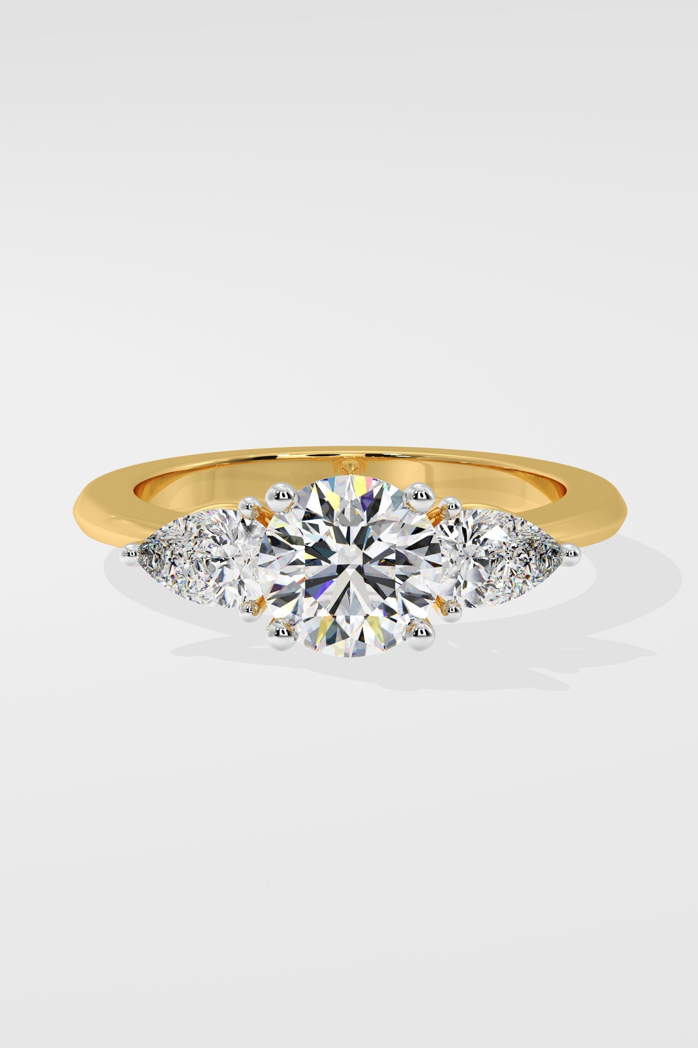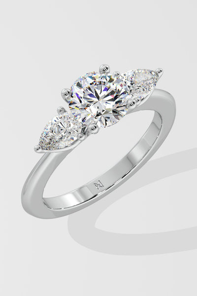 Lab Grown Diamond Opera Three Stone Ring featuring a 1.5 ct solitaire center diamond with 0.30 ct pear-shaped side stones. A fresh twist on the classic three-stone style, this design brings an edgy, modern flair.