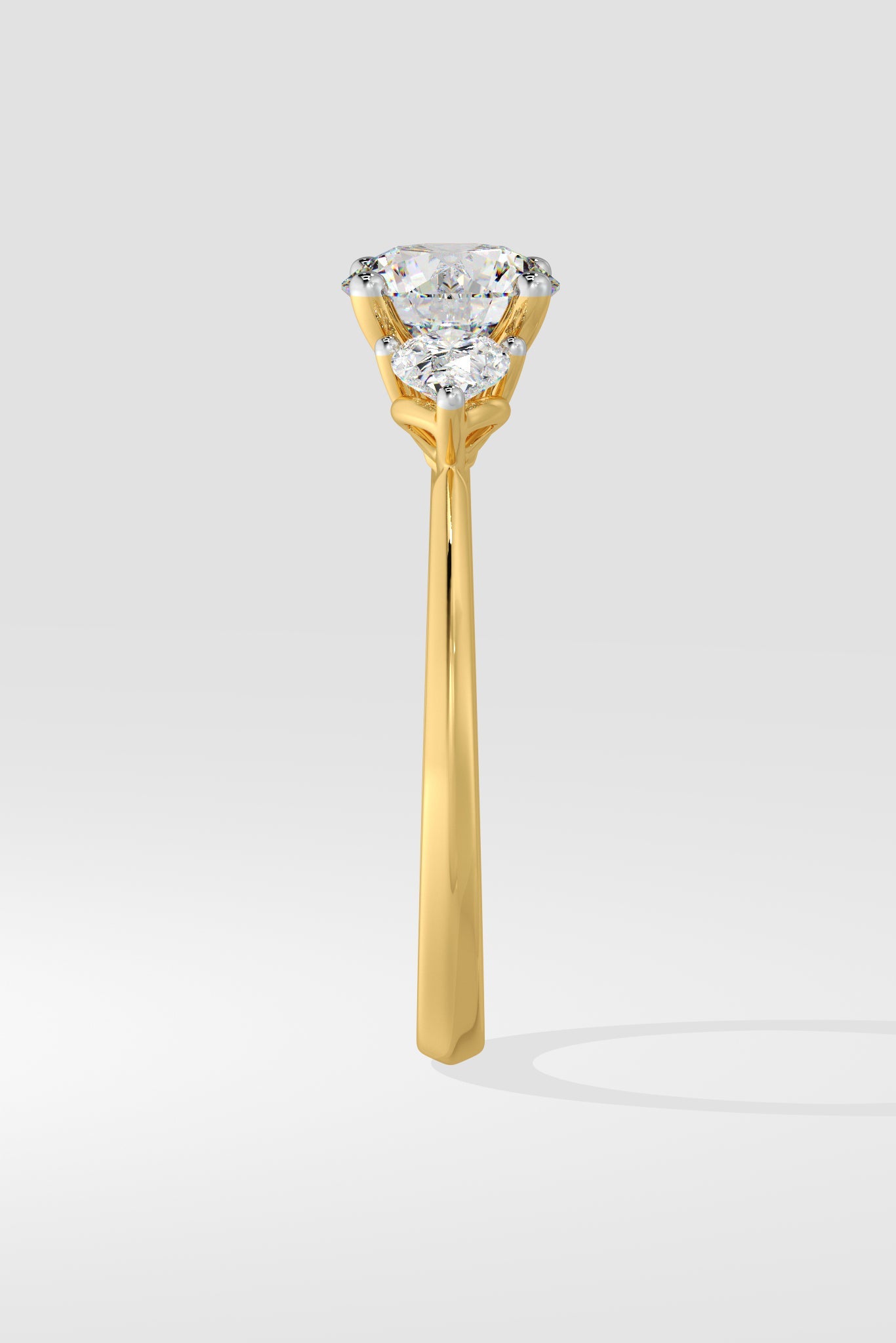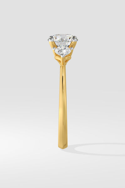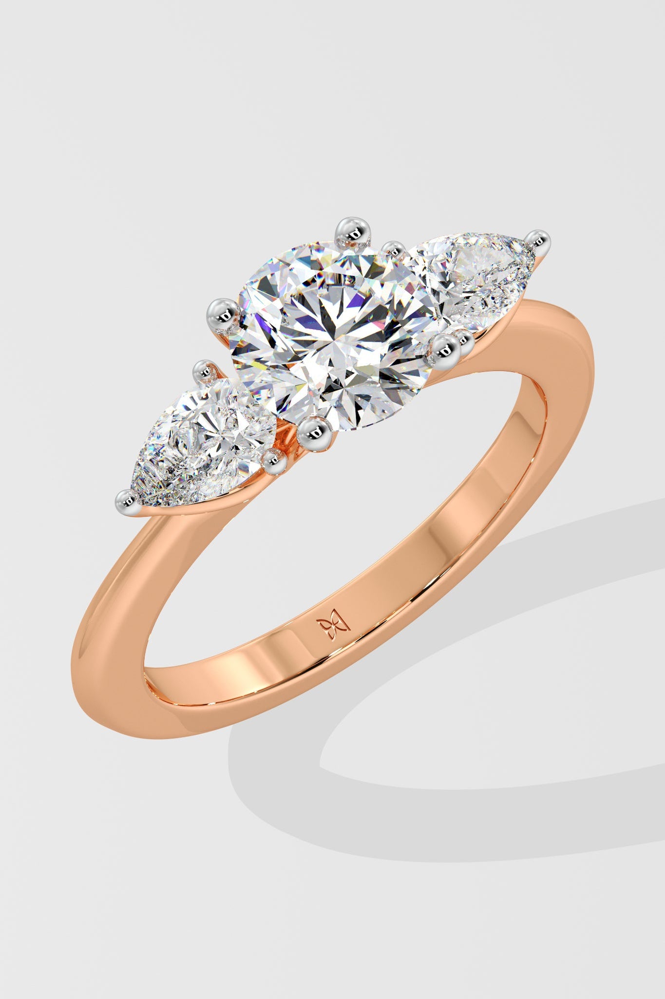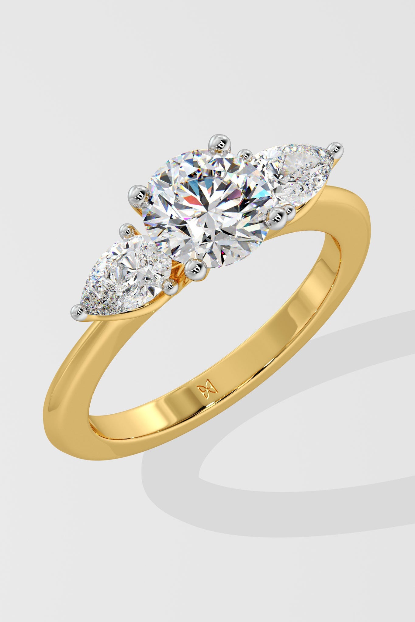 Lab Grown Diamond Opera Three Stone Ring featuring a 1.5 ct solitaire center diamond with 0.30 ct pear-shaped side stones. A fresh twist on the classic three-stone style, this design brings an edgy, modern flair.