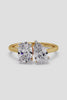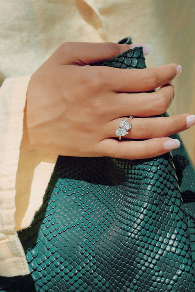 This Toi et Moi Ring features a stunning pairing of a 2 ct Oval and a 1.75 ct Pear shaped Diamond. Two stone rings are simple yet elegant symbol of togetherness.