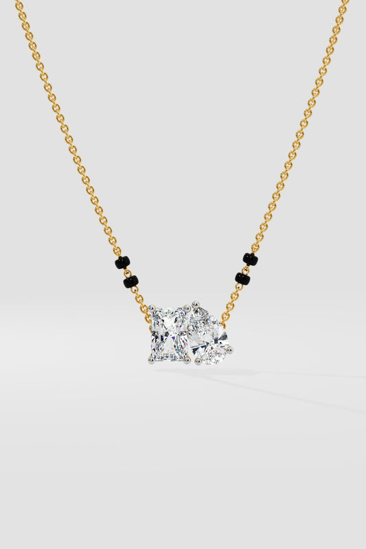 Our Petal Solitaire Mangalsutra, features a 0.50 ct center solitaire with halo, complemented by delicate 0.15 ct pear-shaped diamonds on each side. Perfect for everyday elegance.