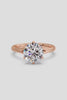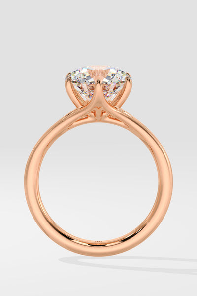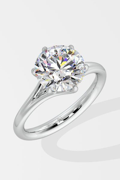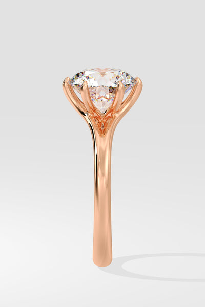 Lab Grown Diamond Flow Ring featuring a 2 ct round brilliant held in a 6-prong setting for maximum exposure and sparkle. The gold shank splits toward the crown, flowing seamlessly into elevated prongs that create an intricate and elegant silhouette. A perfect engagement ring or a stunning anniversary gift, this piece exudes pure sophistication.