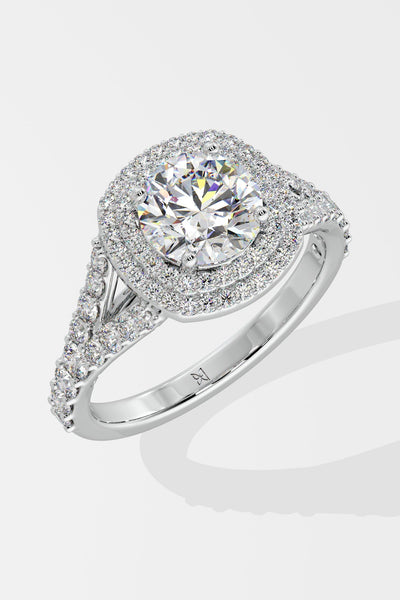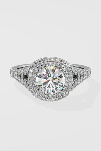 Lab Grown Diamond Double Halo Ring featuring a stunning 1.5 ct round brilliant at its center, encircled by a cushion-shaped double halo that elevates its brilliance. The Y-shaped split shank adds graceful structure and extra sparkle, making it a timeless design that radiates modern elegance.
