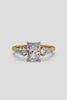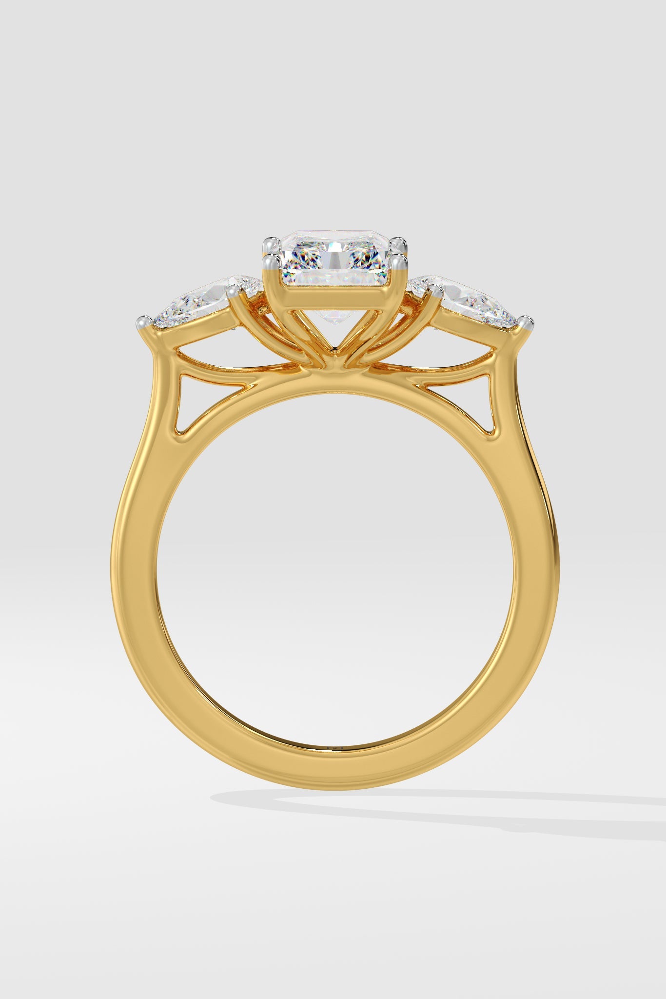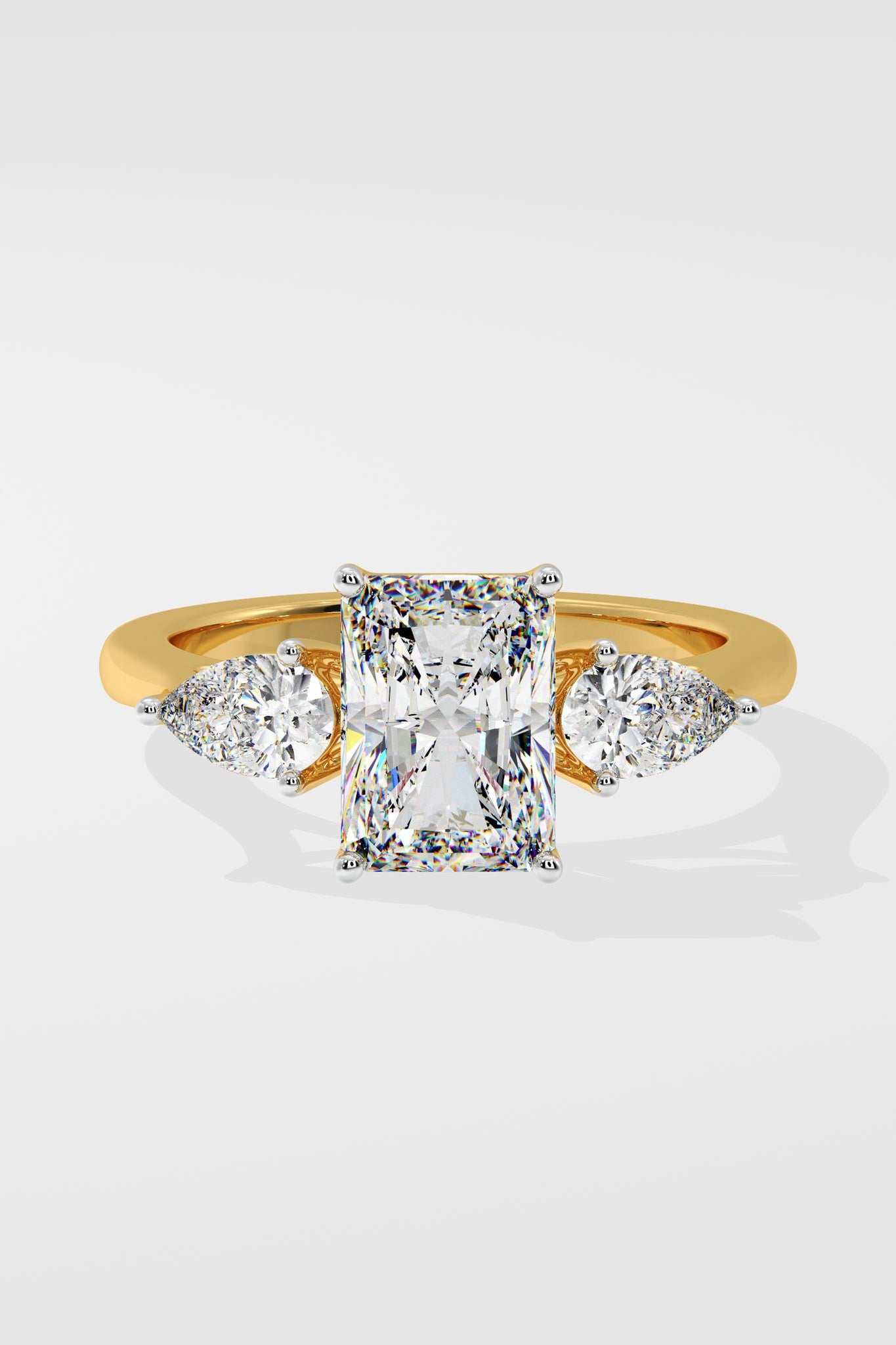 The symphony three-stone ring features 2 ct Radiant as a center diamond with 0.30 pointer pears on the side which gives it an elegant look. You can change the center stone with your desired shape.