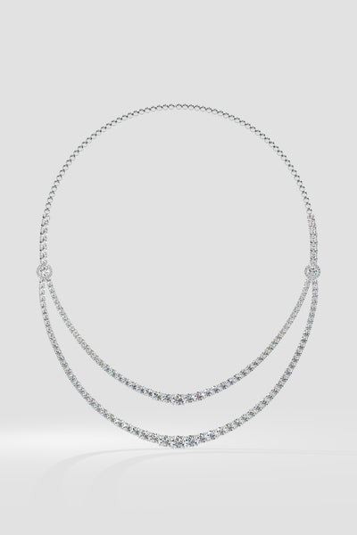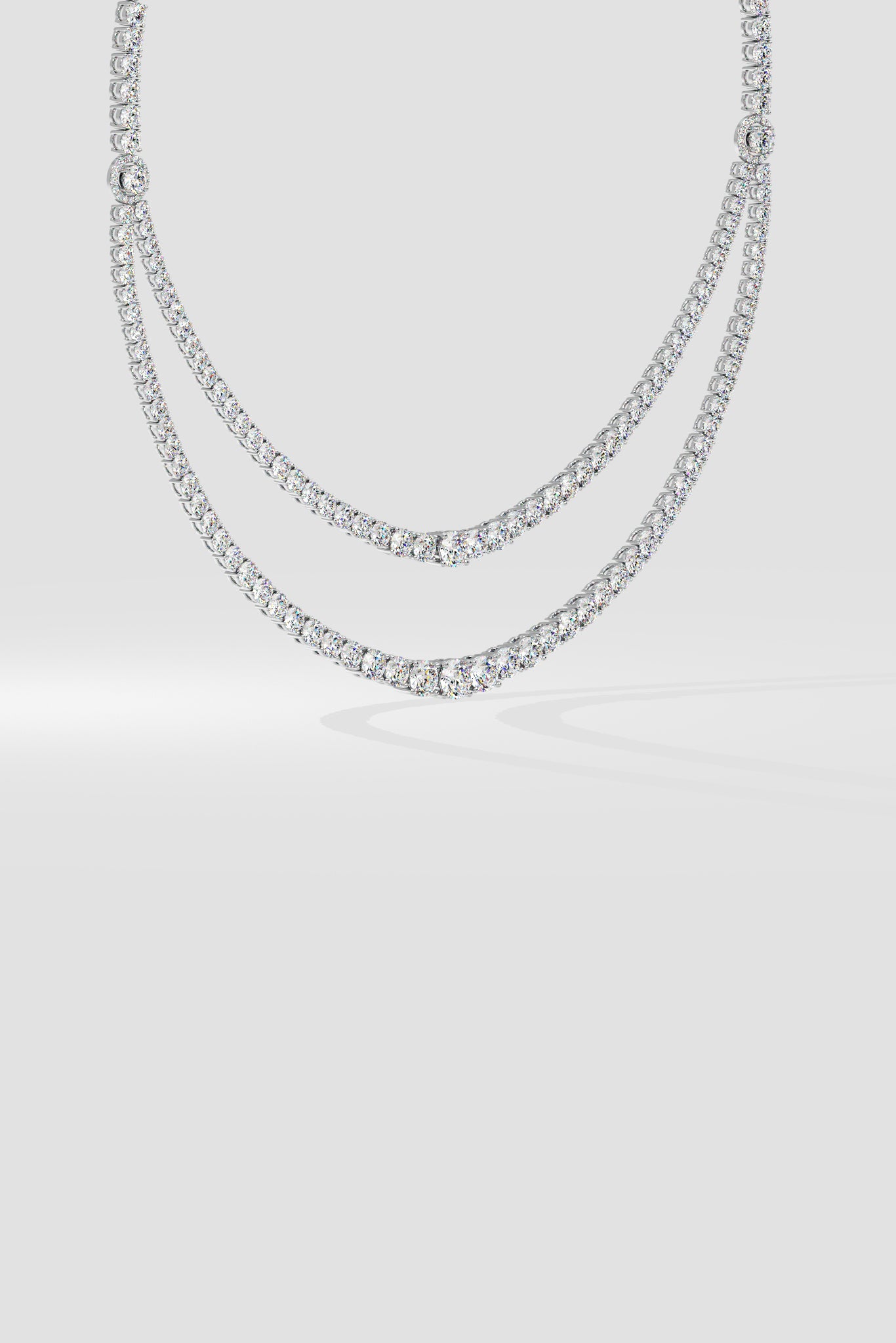 The Elise Necklace features two intricately crafted layers of diamonds, graduating in size to create a harmonious flow. At its heart, a stunning 0.75 ct center stone draws attention, while the smaller diamonds seamlessly enhance its brilliance.