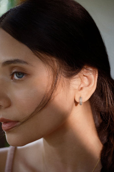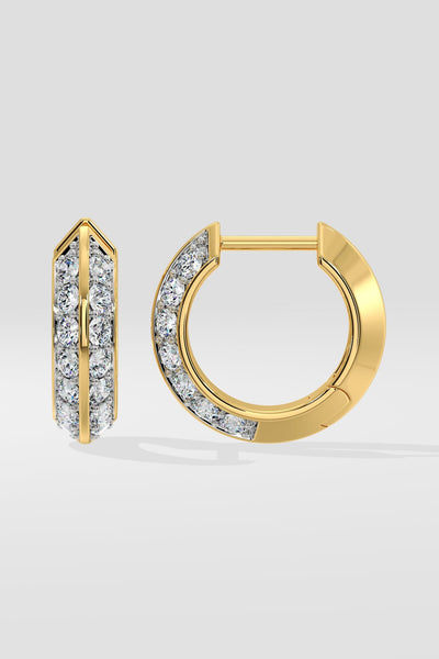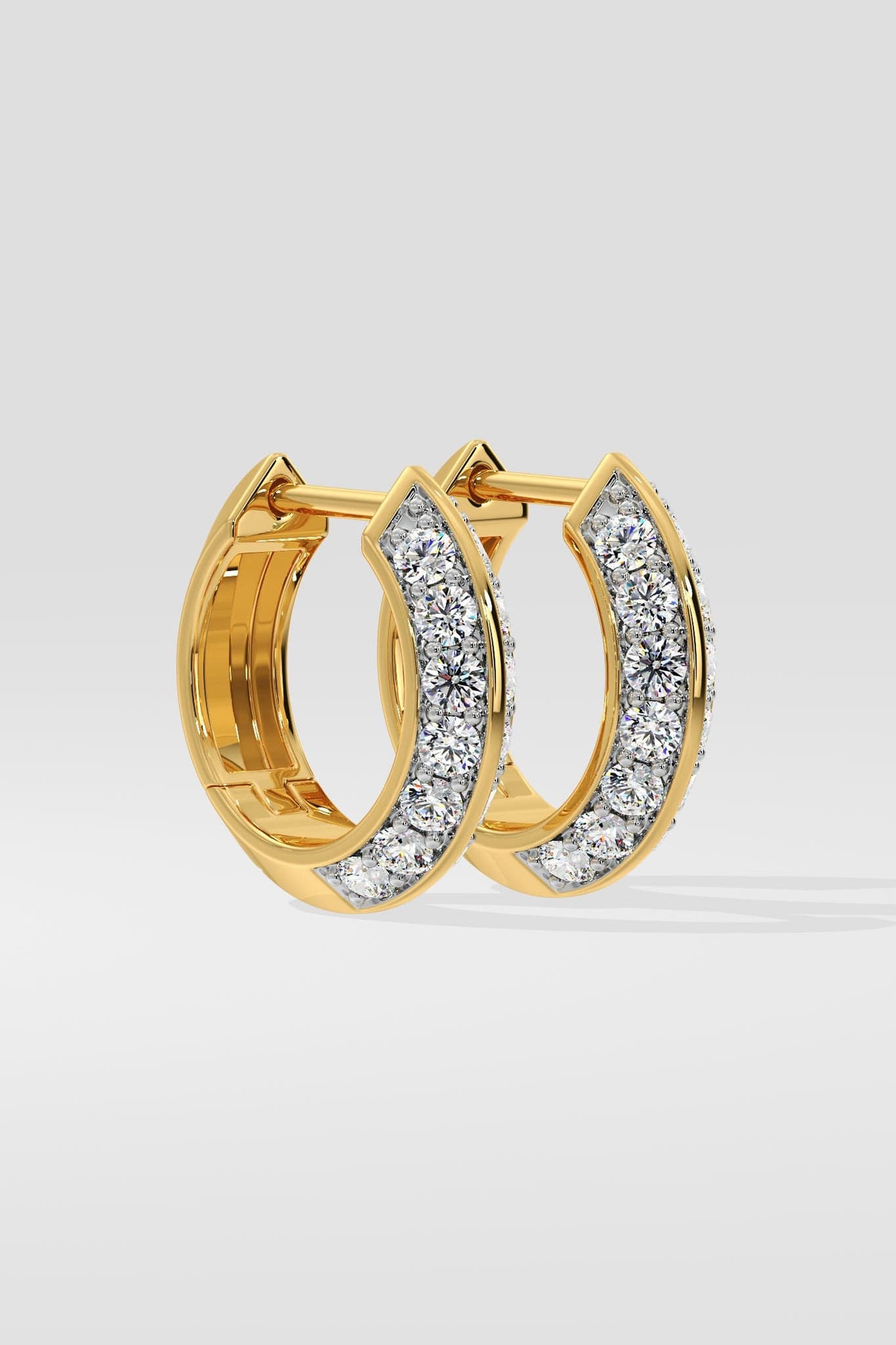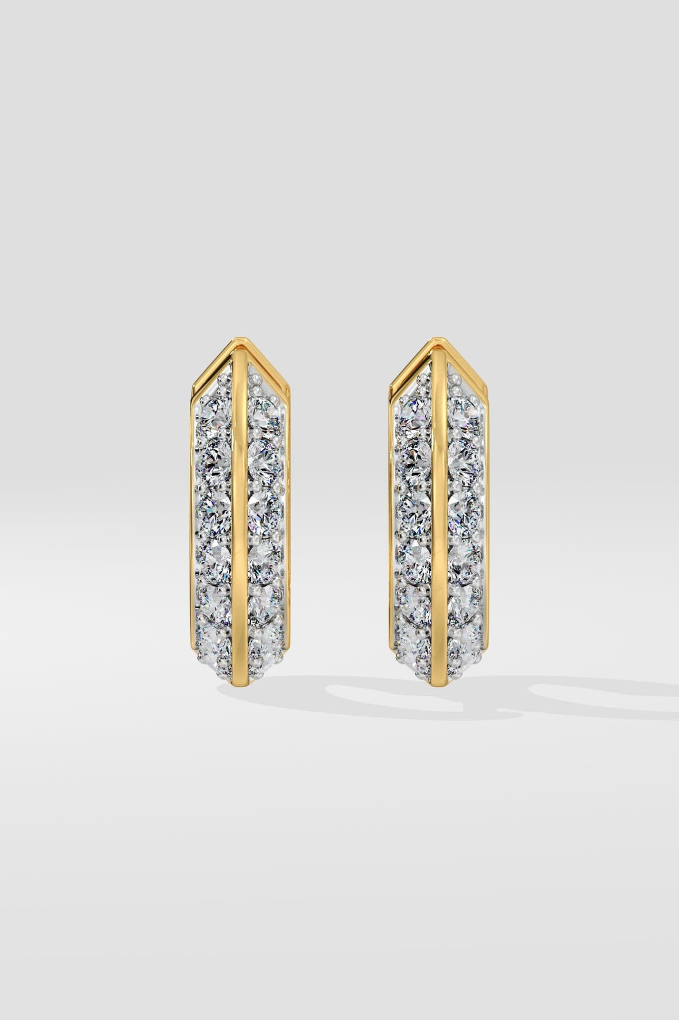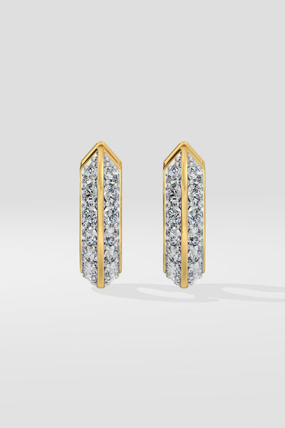The Verve Huggies redefine modern elegance with their sleek, angular silhouette and a radiant row of pavé-set diamonds. Designed for a bold yet refined look, these gold huggies feature a distinctive edge that adds contemporary flair.